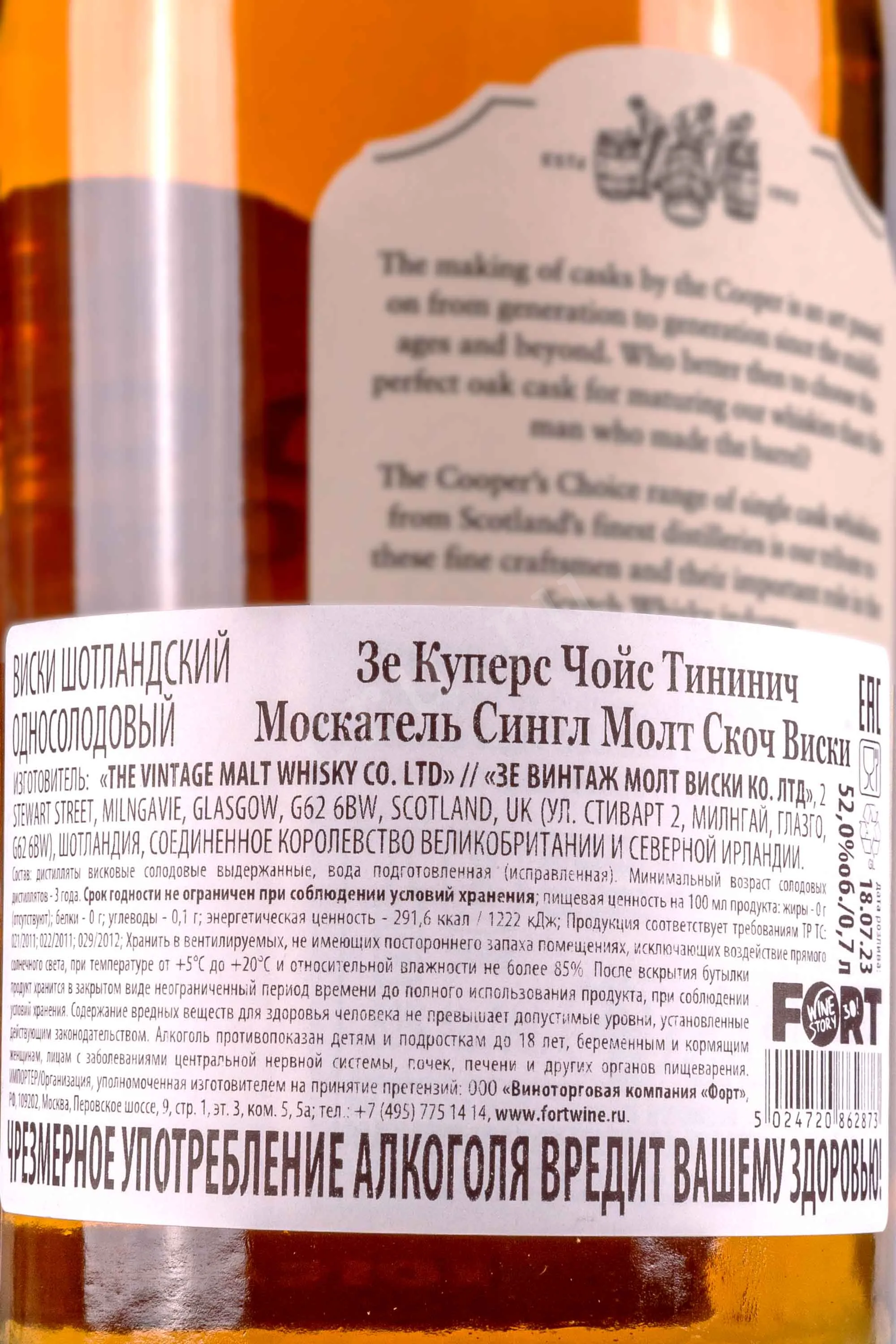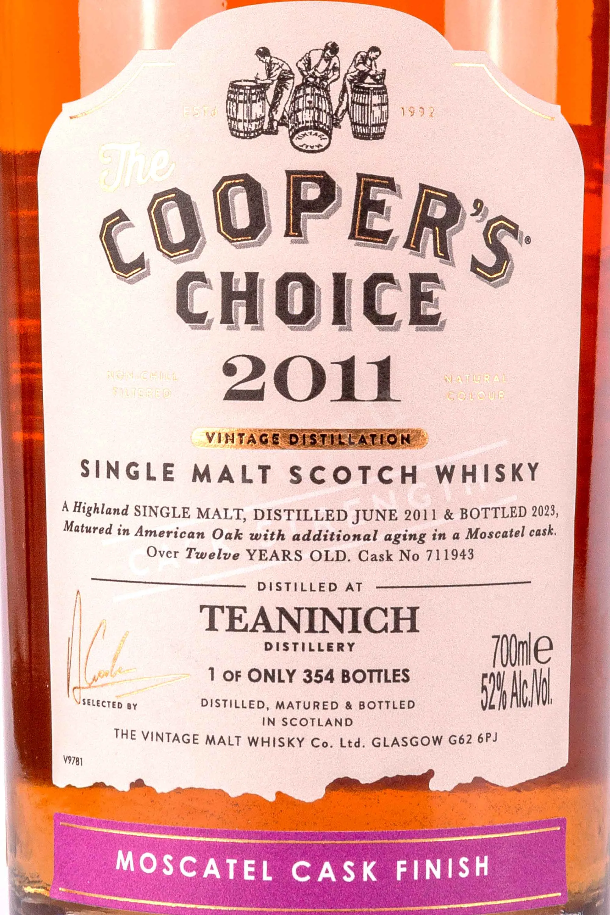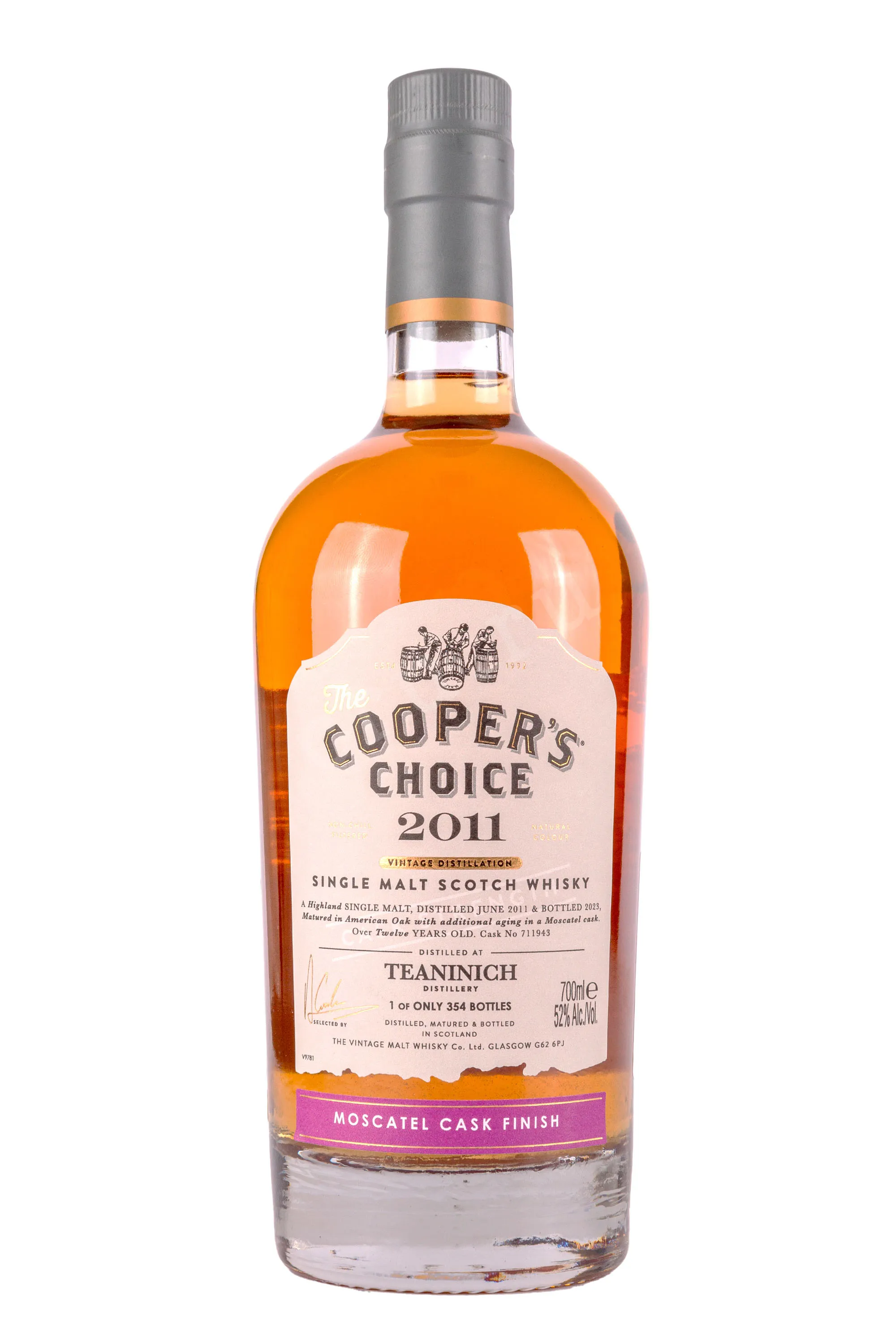 Виски The Coopers Choice Teaninich Moscatel gift box 0.7 л выдерживался в редких бочках из-под десертного вина, созданного из винограда сорта Москатель. Напиток приобрёл свою уникальность благодаря особой технологии двойной выдержки: после основной выдержки в традиционных дубовых бочках его дополнительно перелили в винные ёмкости для насыщения сладкими фруктовыми нотами, подчеркнувшими его сложный характер.