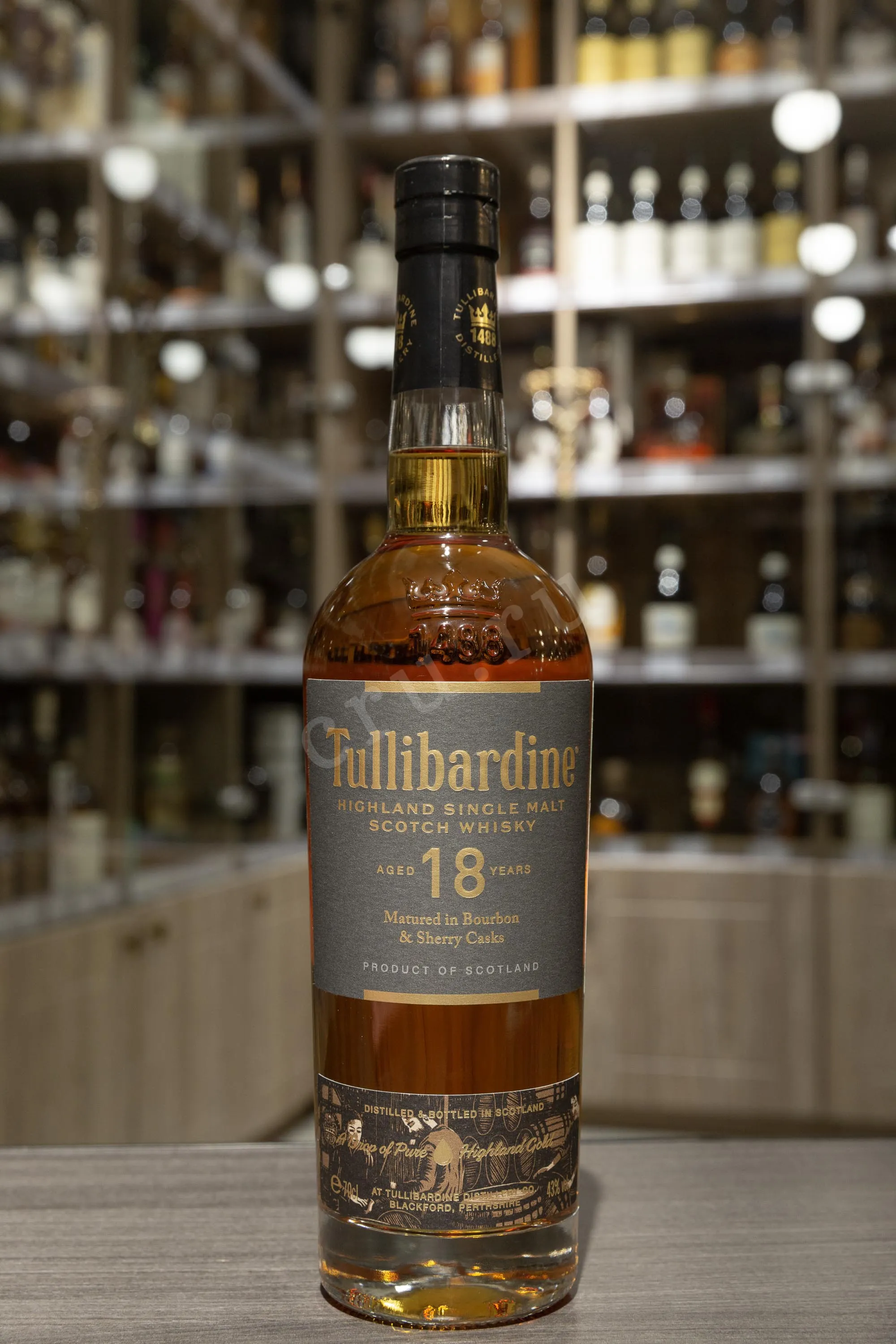 Виски Tullibardine 18 лет 0,7 л в подарочной упаковке — выдержанный односолодовый скотч из региона Хайленд, представленный в 2023 году как часть обновлённой линейки дистиллерии. Основу купажа составил спирт, изготовленный в 2005 году. Напиток провёл полные 18 лет в бочках из американского дуба, ранее использовавшихся для бурбона. Напиток не подвергался холодной фильтрации, что позволило сохранить его текстуру и сложный вкусовой профиль. Бутылка упакована в тубус тёмного цвета, подчёркивающий премиальный характер релиза. Завод Tullibardine расположен у подножия Охильских холмов, рядом с источником Дэнни-Бёрн — это одна из старейших действующих зон пивоварения и винокурения в Шотландии. Вода из родника используется местными производителями с XV века, так как отличается особой мягкостью и чистотой. Благодаря долгой выдержке и использованию качественного сырья виски получил ярко выраженную структуру и сбалансированный характер.