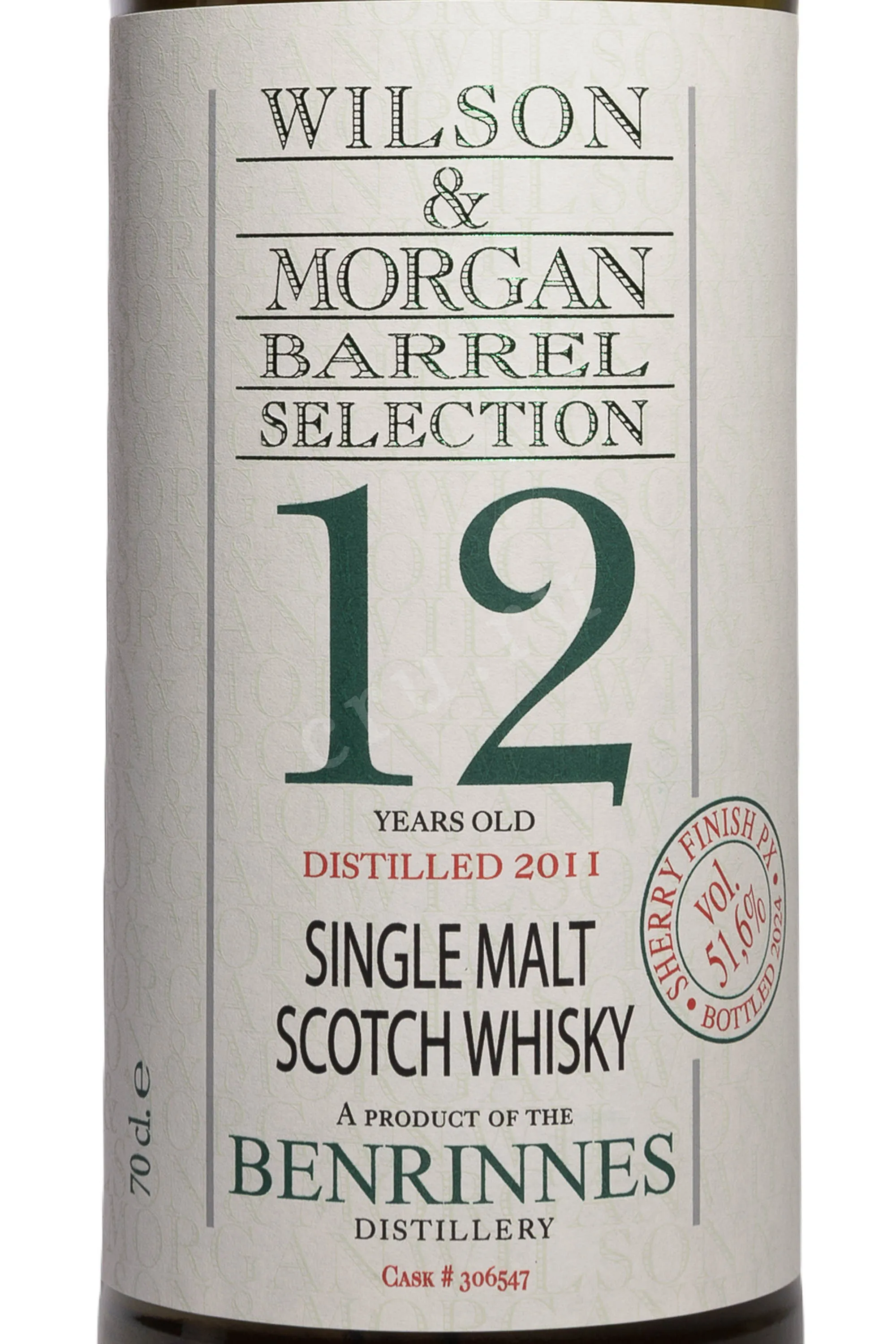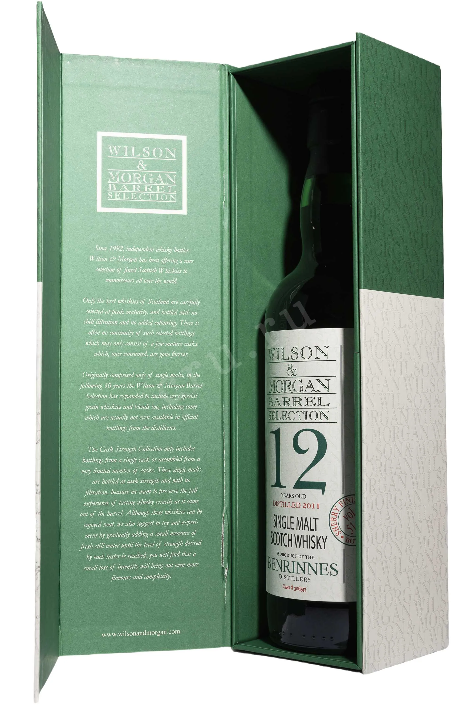 Виски Wilson&Morgan Barrel Selection Benrinnes Sherry Finish 12 лет 0,7 л в подарочной упаковке — односолодовый, насыщенный и выразительный по своему стилю, с ощутимыми винными нотами за счет довыдержки в хересных бочках. Дистилляты произведены вискикурней Бенриннес, которая находится в Спейсайде у подножия горы. Основное время (не менее 12 лет) скотч созревал в хогсхедах повторного наполнения. Дозревание в бочках из-под хереса Педро Хименес длилось 42 месяца. Такая выдержка придала виски насыщенный, глубокий вкус с выраженными нотками шерри. Лимитированная партия бутилирована вручную, что подчёркивает эксклюзивность продукта. Виски получил международные награды и высокие оценки от критиков за богатство аромата и сбалансированный вкус.