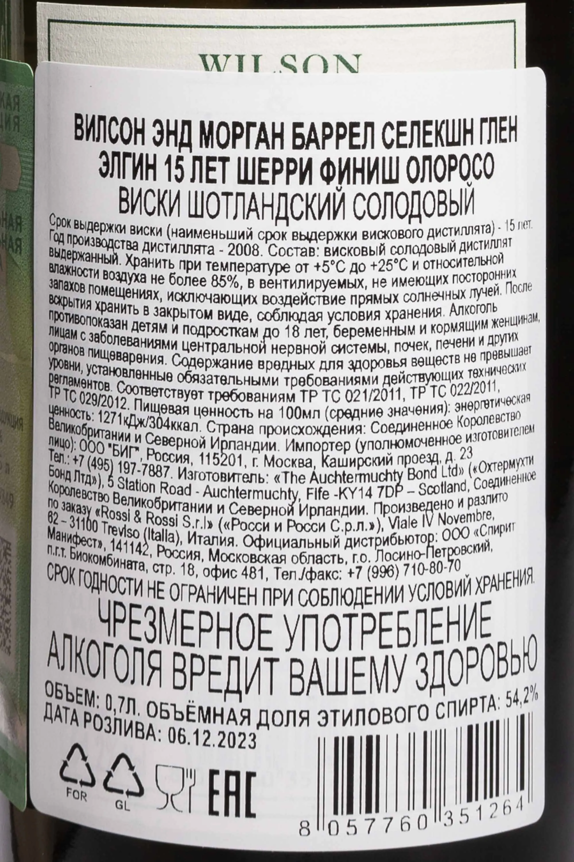 Виски Wilson & Morgan Barrel Selection Glen Elgin Sherry Finish Oloroso 15 лет в подарочной упаковке 0.7 л — односолодовый скотч из региона Спейсайд с выверенным и спокойным характером. Стиль напитка строится на балансе спелых фруктов, мягкой сладости и сдержанных древесных тонов. Спирты были дистиллированы в 2008 году. Основная выдержка проходила в дубовых бочках повторного наполнения, что позволило сохранить чистоту дистиллята. Финальный этап длился около тридцати месяцев в хересных бочках первого наполнения Олоросо. Такой подход усилил глубину вкуса и добавил легкую пряность без излишней сладости. Релиз бутилирован в 2023 году без холодной фильтрации при крепости 54,2%. Независимый боттлер Вилсон энд Морган известен строгим отбором бочек и точной работой с финишной выдержкой, за что его выпуски высоко ценятся энтузиастами и профильными критиками.