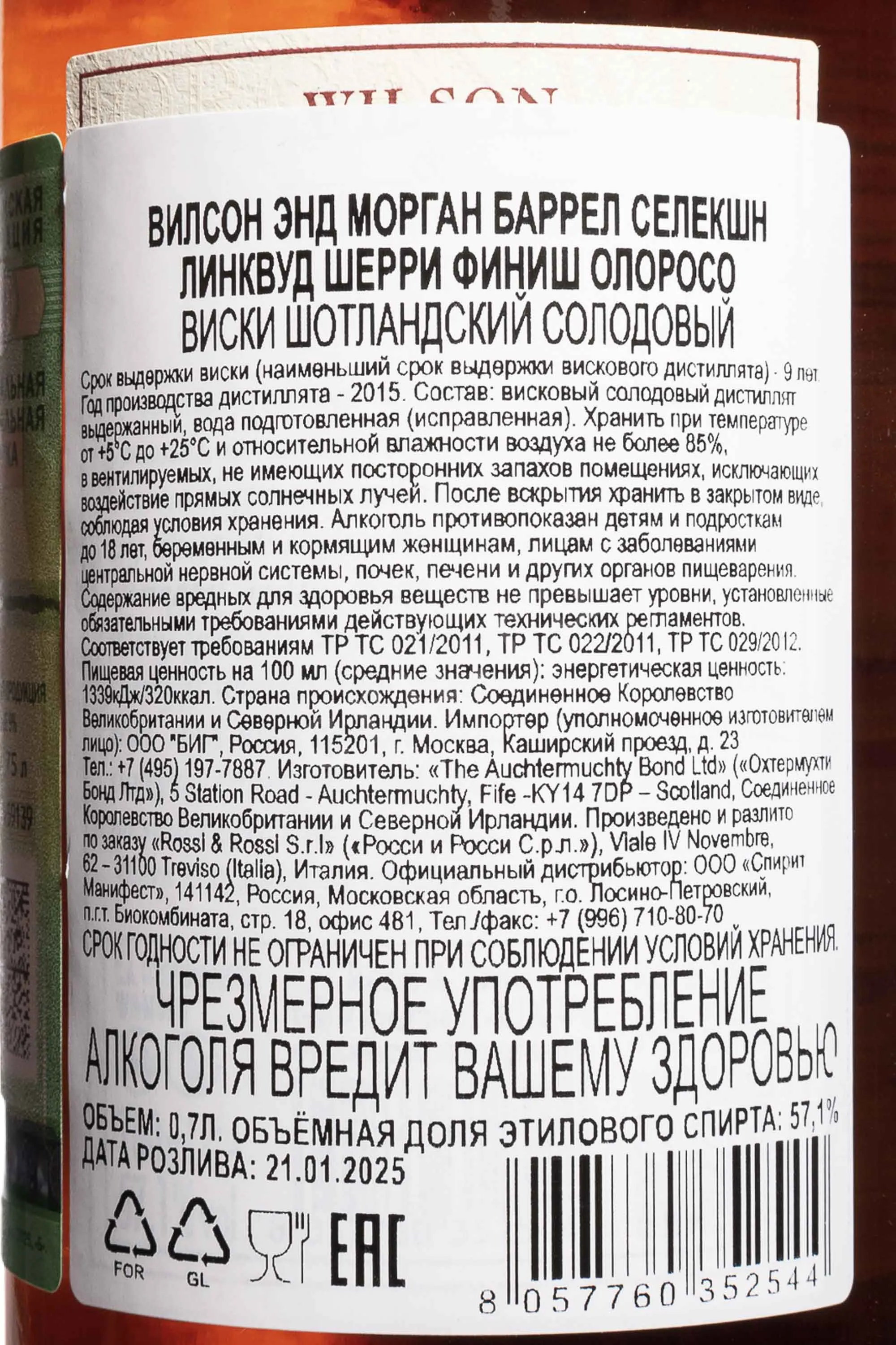 Виски Wilson & Morgan Barrel Selection Linkwood Sherry Finish Oloroso 9 лет в подарочной упаковке 0.7 л — односолодовый скотч в классической хересной стилистике Спейсайда. Характер выразительный и при этом сдержанный. Основу составляют спирты винокурни Линквуд, дистиллированные в 2015 году. Первичная выдержка проходила в дубовых бочках hogshead повторного наполнения, что позволило сохранить природный профиль дистиллята. Финальный этап длился почти три года в бочках из-под хереса Олоросо. Именно этот период придал напитку медовую глубину и ореховую сухость без излишней сладости. Виски бутилирован в 2025 году без холодной фильтрации при крепости 57,1%. Релиз относится к линейке независимого боттлера Вилсон энд Морган, известного точным отбором бочек и высокими оценками среди коллекционеров и профильных критиков, а редкость официальных сингл молтов Linkwood усиливает интерес к этому выпуску.
