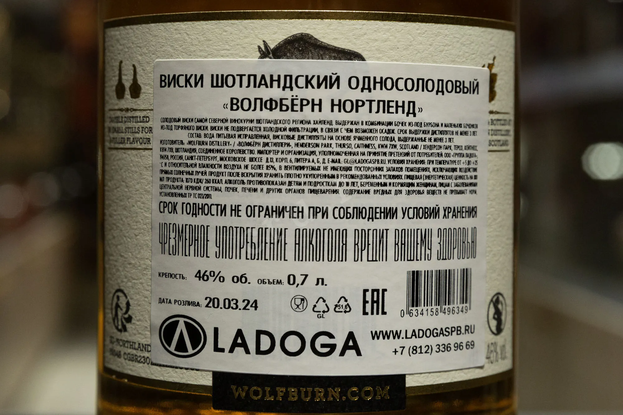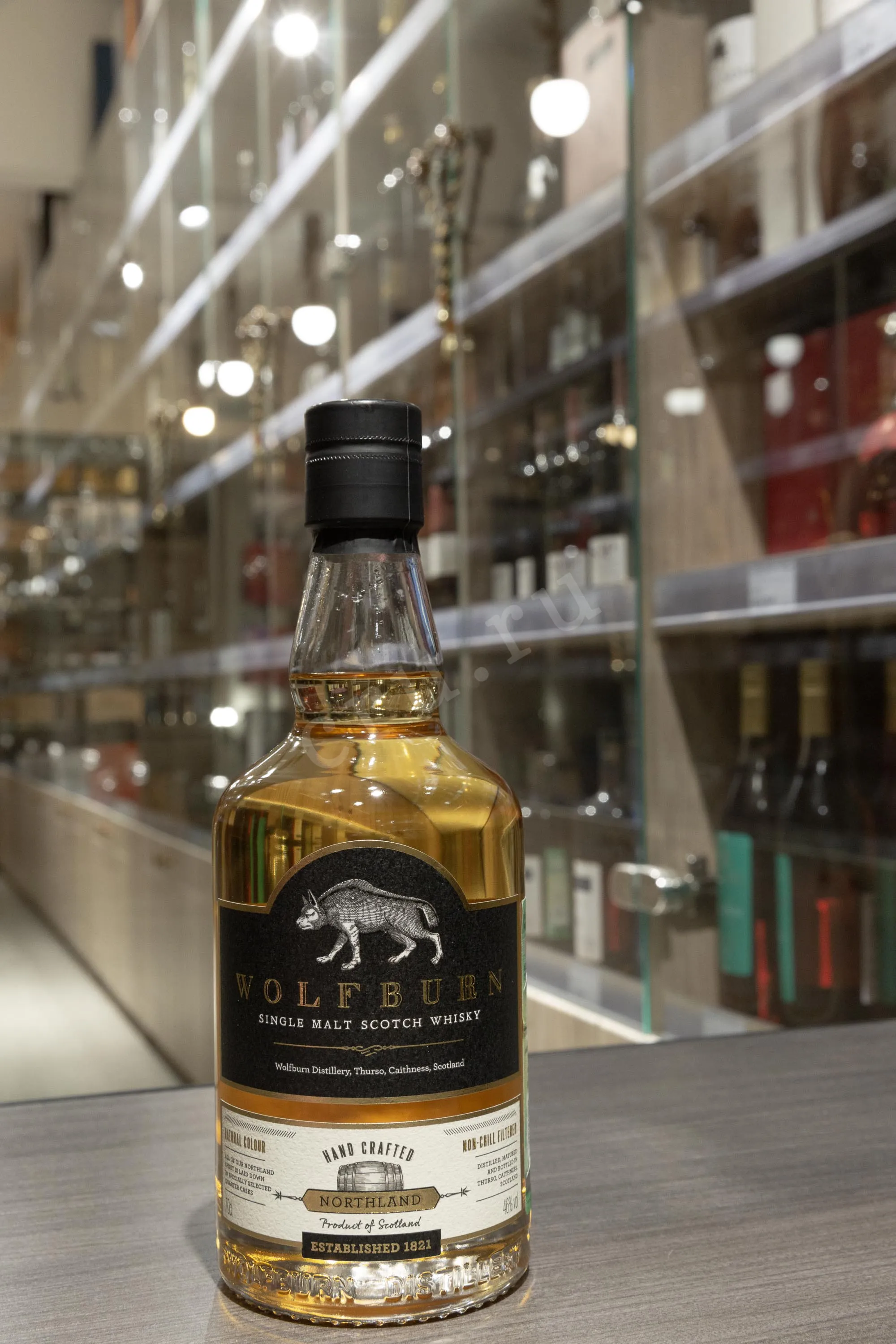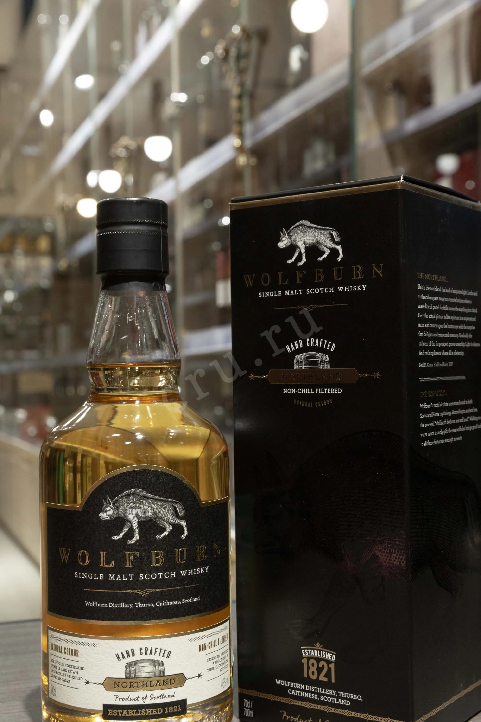 Виски Wolfburn Northland 0,7 л в подарочной упаковке — это современный солодовый скотч из самой северной винокурни на континентальной Британии. Он изготовлен на Шотландских островах, где холодный морской климат и сильные ветры влияют на процесс выдержки. Напиток производится из ячменного солода, очищенной торфом воды местного источника и дрожжей. Средняя выдержка составляет более 8 лет в дубовых бочках — преимущественно из-под бурбона. Фасон бутылки лаконичный, с короткой горлышком и строгой этикеткой.