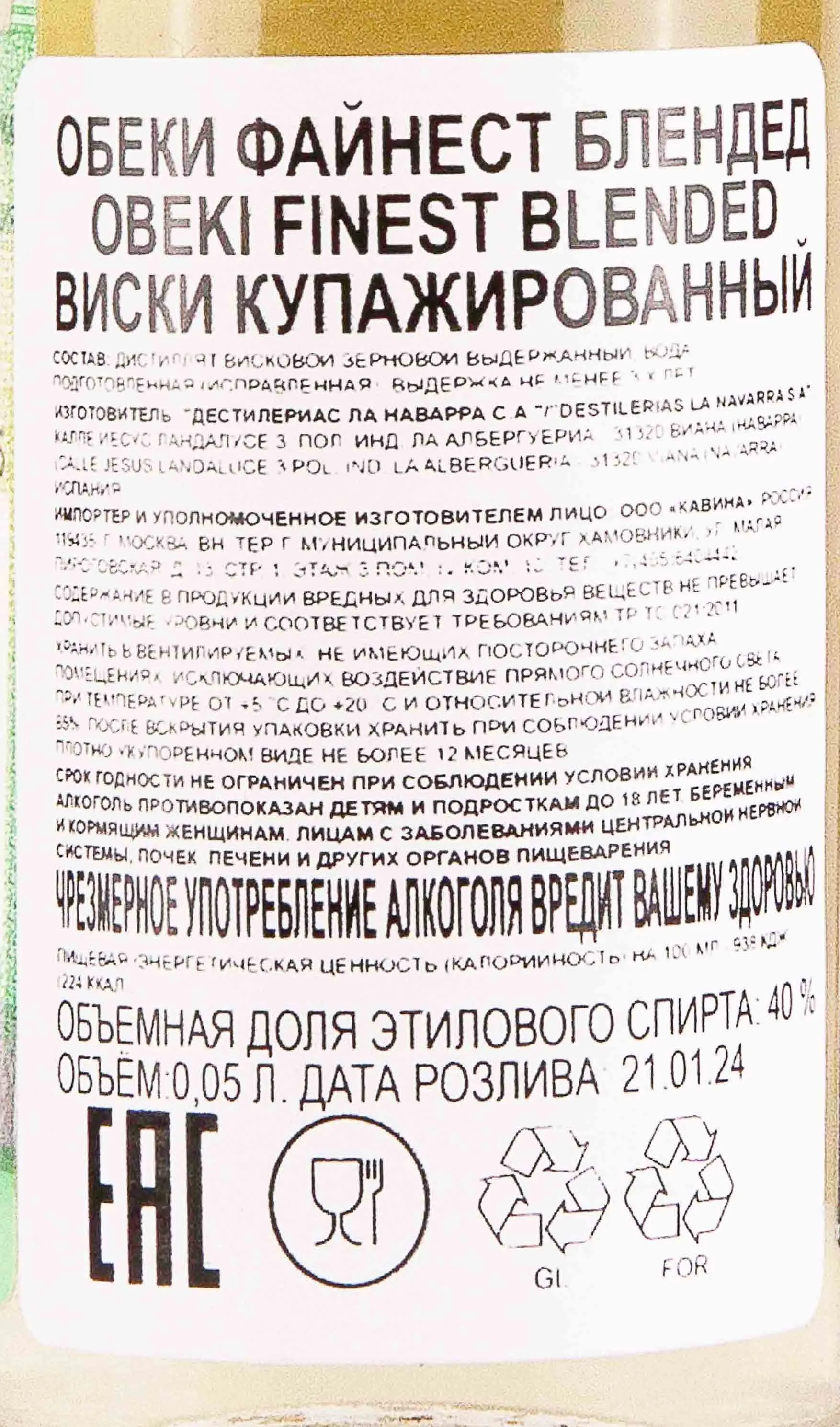 Obeki Finest Blended 0.05 л купить - Испанский виски Обеки Файнест Блендед цена в магазине