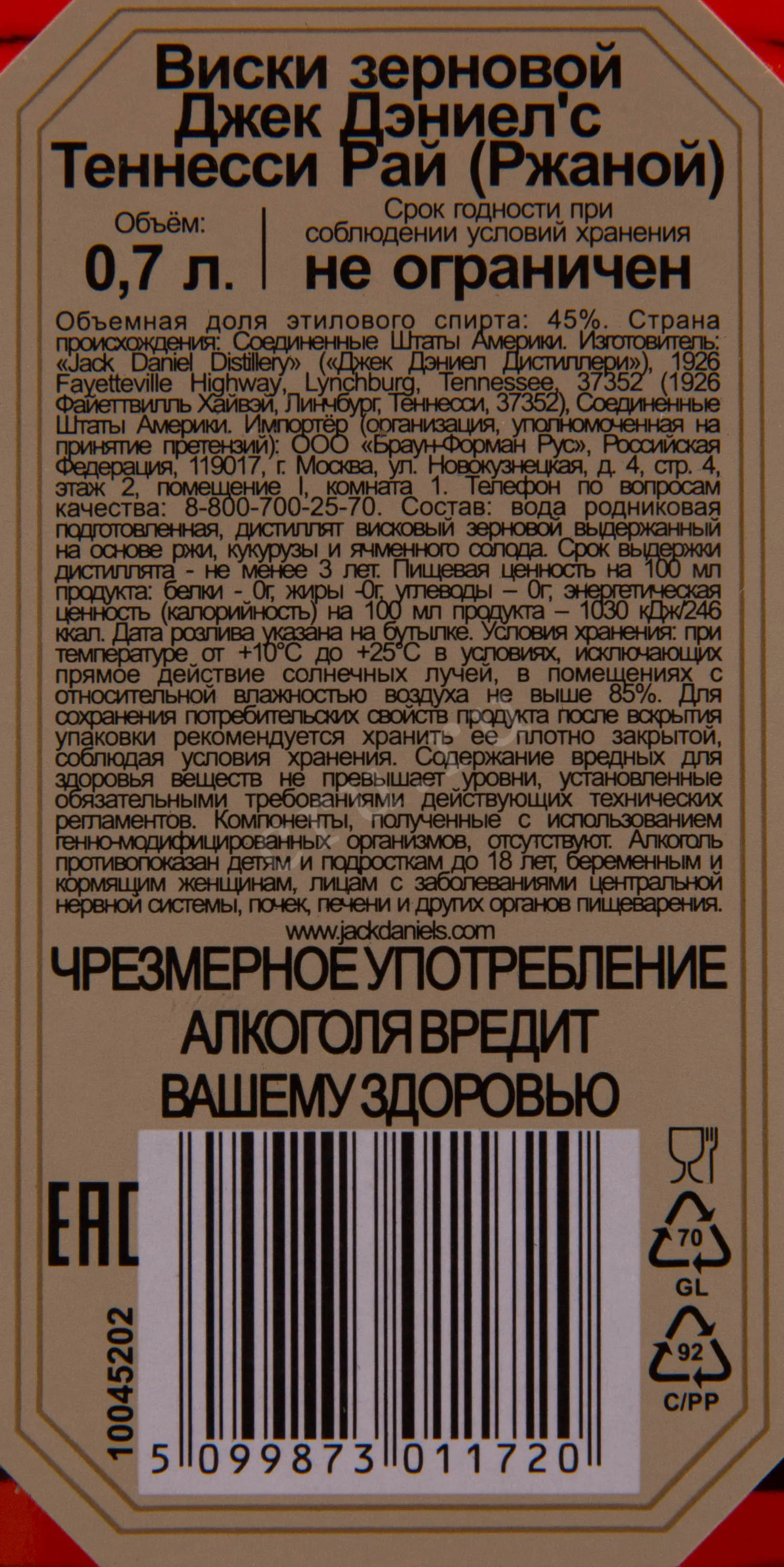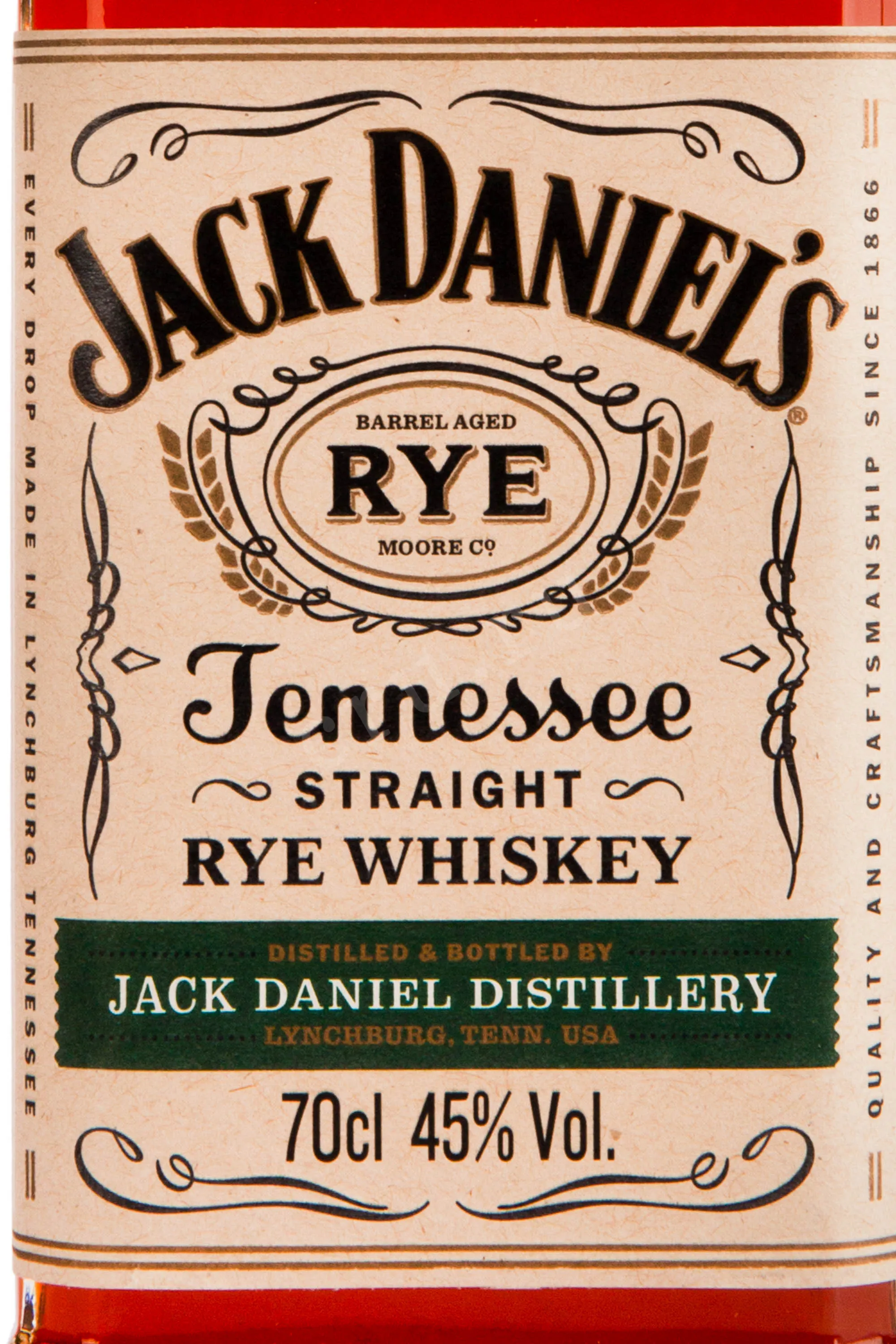 Виски Jack Daniel`s Tennessee Rye создан с учетом традиций и опыта, накопленных легендарной винокурней более чем за 150 лет. Он сочетает в себе характерную пряность ржи с фирменной мягкостью, присущей висковым дистиллятам из Теннесси. Впервые вариация была представлена широкой публике в 2017 году. Производитель разработал собственный рецепт с 70% ржи, 18% кукурузы и 12% солодового ячменя. Неповторимый характер напитка обеспечили, в том числе, использование деминерализованной, с максимально низким содержанием железа, воды и фильтрация через три метра древесного угля сахарного клена. Традиционная выдержка в новых обожженных бочках из американского дуба, изготовленных на собственном бондарном производстве, добавила органолептическому профилю спиртного баланса и глубины.