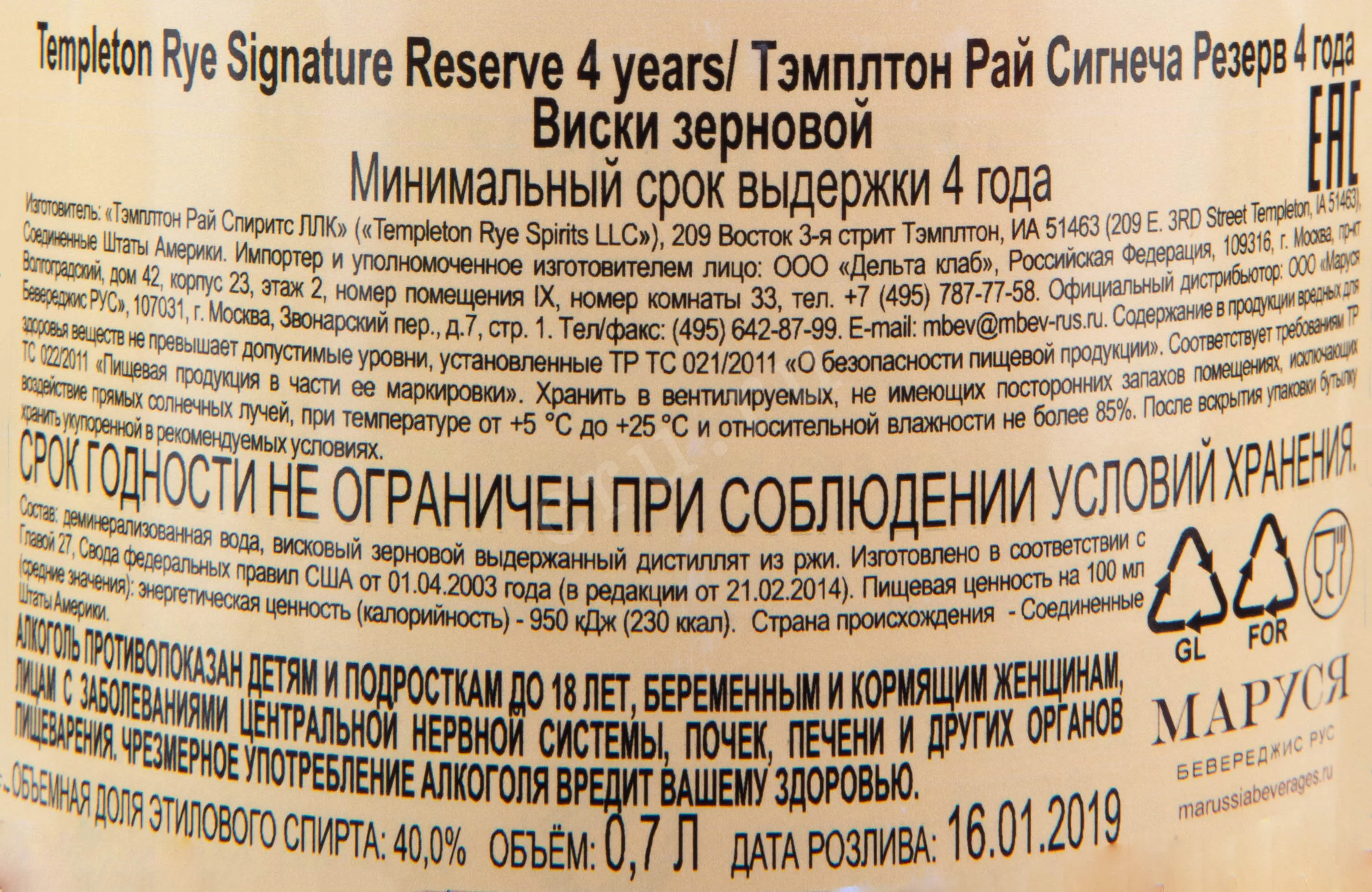 Templeton Rye Signature Reserve 4 years 0.7 л купить - Американский виски Тэмплтон Рай Сигнеча Резерв 4 года цена в магазине