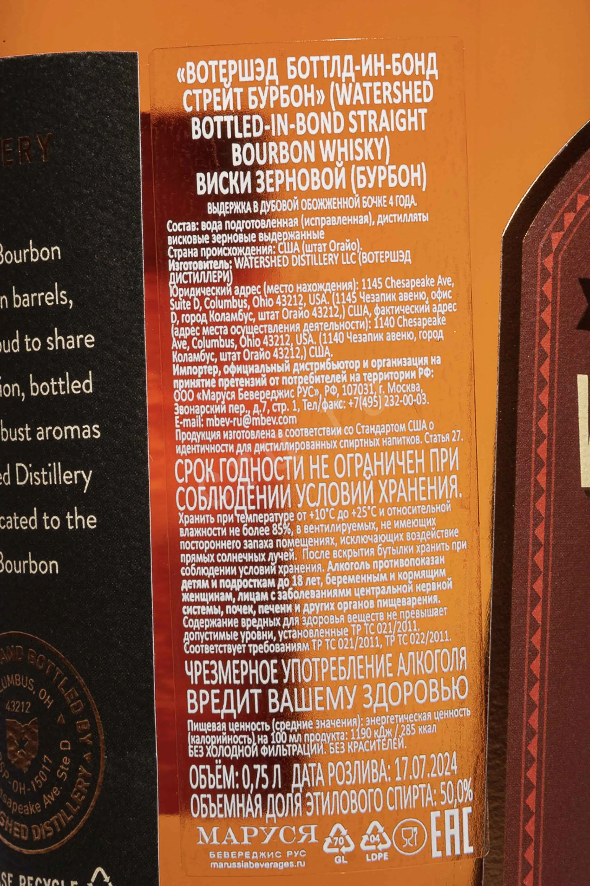 Виски Watershed Bottled in Bond Straight Bourbon 4 года 0.75 л — американский крафтовый бурбон в классическом стиле Bottled in Bond. Напиток производится, выдерживается и разливается на одной дистиллерии Вотершэд в Колумбусе, штат Огайо. Согласно строгим стандартам BIB, дистиллят перегоняется в колонном кубе в строго определённый сезон (в данном случае в летний) и выдерживается не менее четырёх лет в обожжённых дубовых бочках. Главный мастер и основатель вискикурни Грег Леман лично отобрал спирты из десяти бочек для составления бленда. Итоговая крепость после розлива в бутылку составила ровно 50%. По правилам допускается только разбавление водой, без добавок. Такой подход подчёркивает чистоту стиля и стабильное качество.