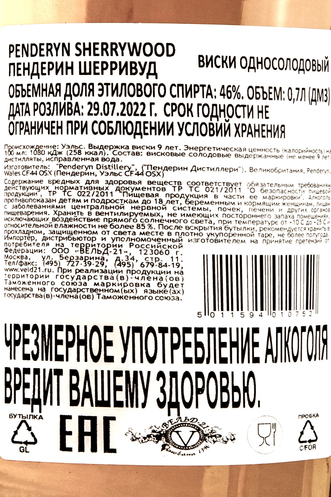 Виски Penderyn Sherrywood gift box 0.7 l – это односолодовый алкоголь от шотландского производителя, представленный в сувенирной упаковке. Напиток изготовлен методом непрерывной перегонки. Спирты созревали в дубовых тарах из-под бурбона и хереса не менее 7 лет, после чего были разлиты по бутылкам без холодной очистки в июле 2022 года. Скотч завоевал несколько бронзовых и серебряных медалей на дегустационных конкурсах в Лондоне и золотую медаль в Сан-Франциско. Также 46-процентный напиток был оценен на 94 балла известным экспертом виски Джимом Мюрреем.
