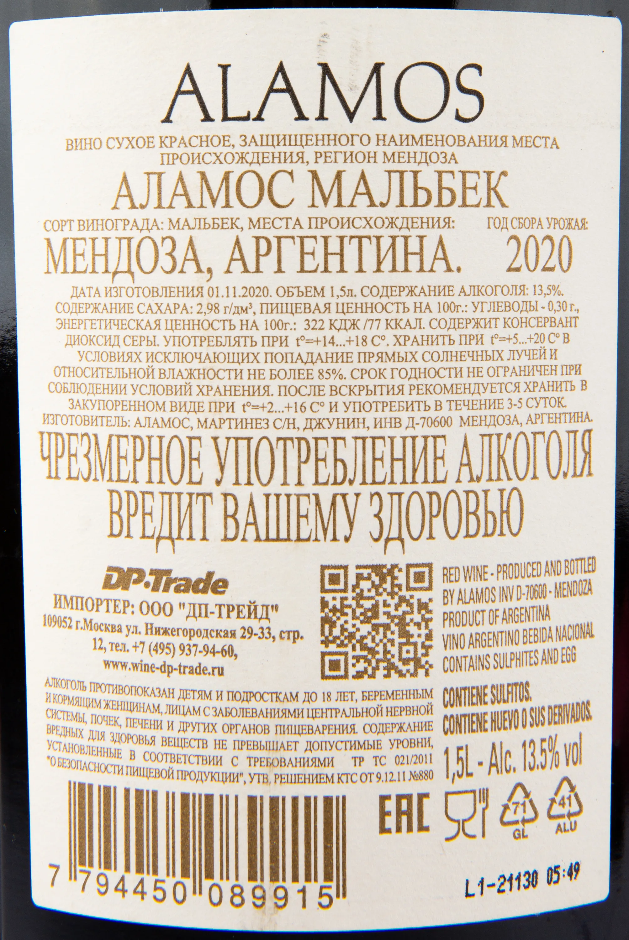 Красное сухое вино Alamos Malbec 2021 1,5 л производится в аргентинском регионе Мендоса, знаменитом своим уникальным терруаром. Виноградники расположены на высокогорных склонах Анд, где значительные перепады температур способствуют равномерному созреванию ягод. Урожай собирается вручную с четырех виноградников хозяйства, после чего следует 2-недельная ферментация при строго контролируемой температуре. Напиток проходит во французских и американских бочках на протяжении 9 месяцев, что придает ему сложность и пряные оттенки. Благодаря этому процессу удается достичь баланса между яркими фруктовыми нотами и глубокими танинами. Потенциал хранения составляет до пяти лет. Бутылка увеличенного (двойного) объема может быть выбрана для подарка.