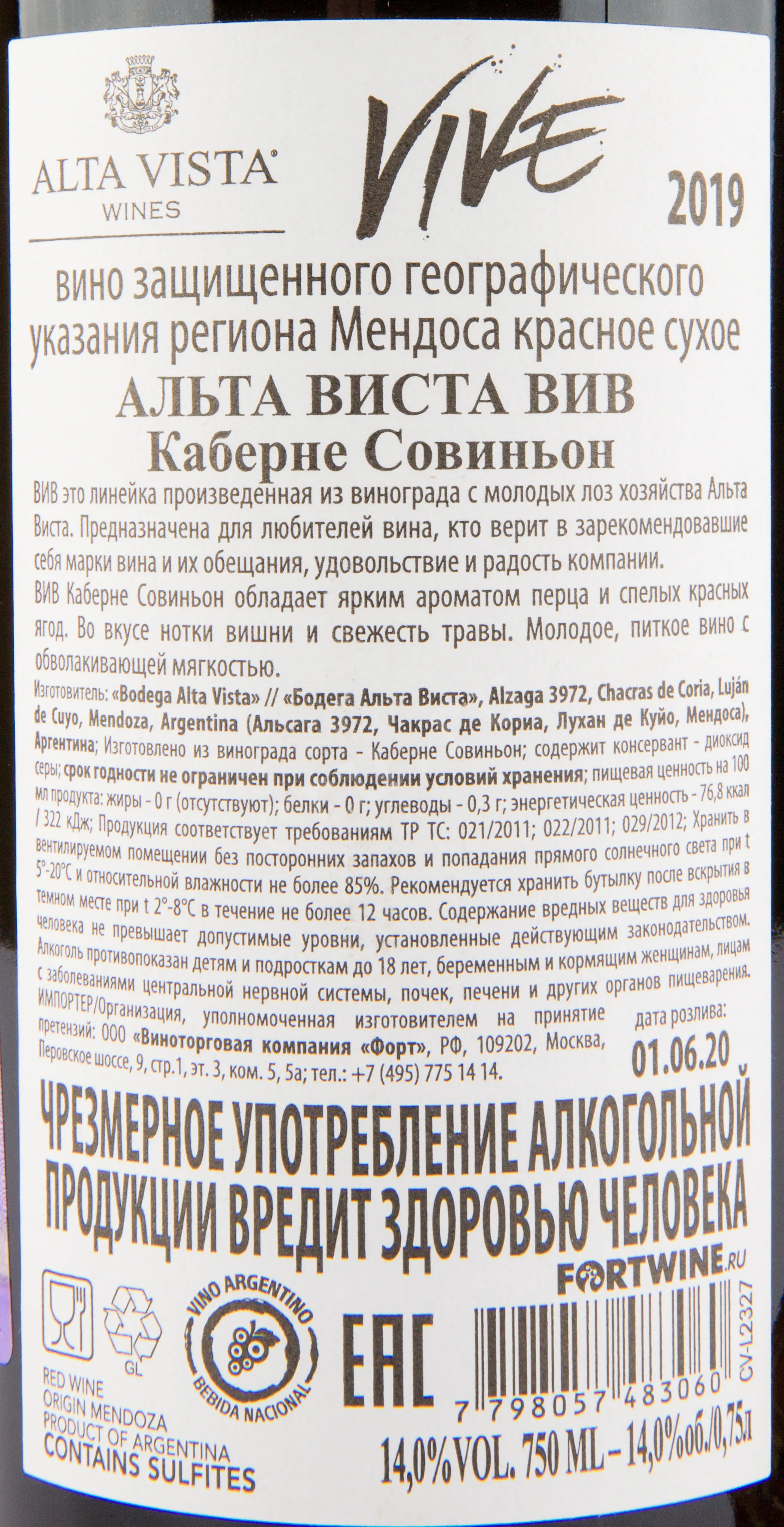 Красное сухое вино Alta Vista Vive Cabernet Sauvignon 0,75 л производится из сырья с молодых лоз. Напиток создается из отборного винограда, выращенного на высоте более 1000 метров над уровнем моря. Особенностью производства является сочетание традиционных методов винификации и современных технологий. Ферментация проходит в стальных емкостях при контролируемой температуре, после следует выдержка в дубовых бочках (20%) и стали (80%), что придает напитку выразительный характер. Вино уникально своей авангардной стилистикой, насыщенной структурой, глубоким вкусом и элегантной танинностью, что является отражением терруара гор Анд.