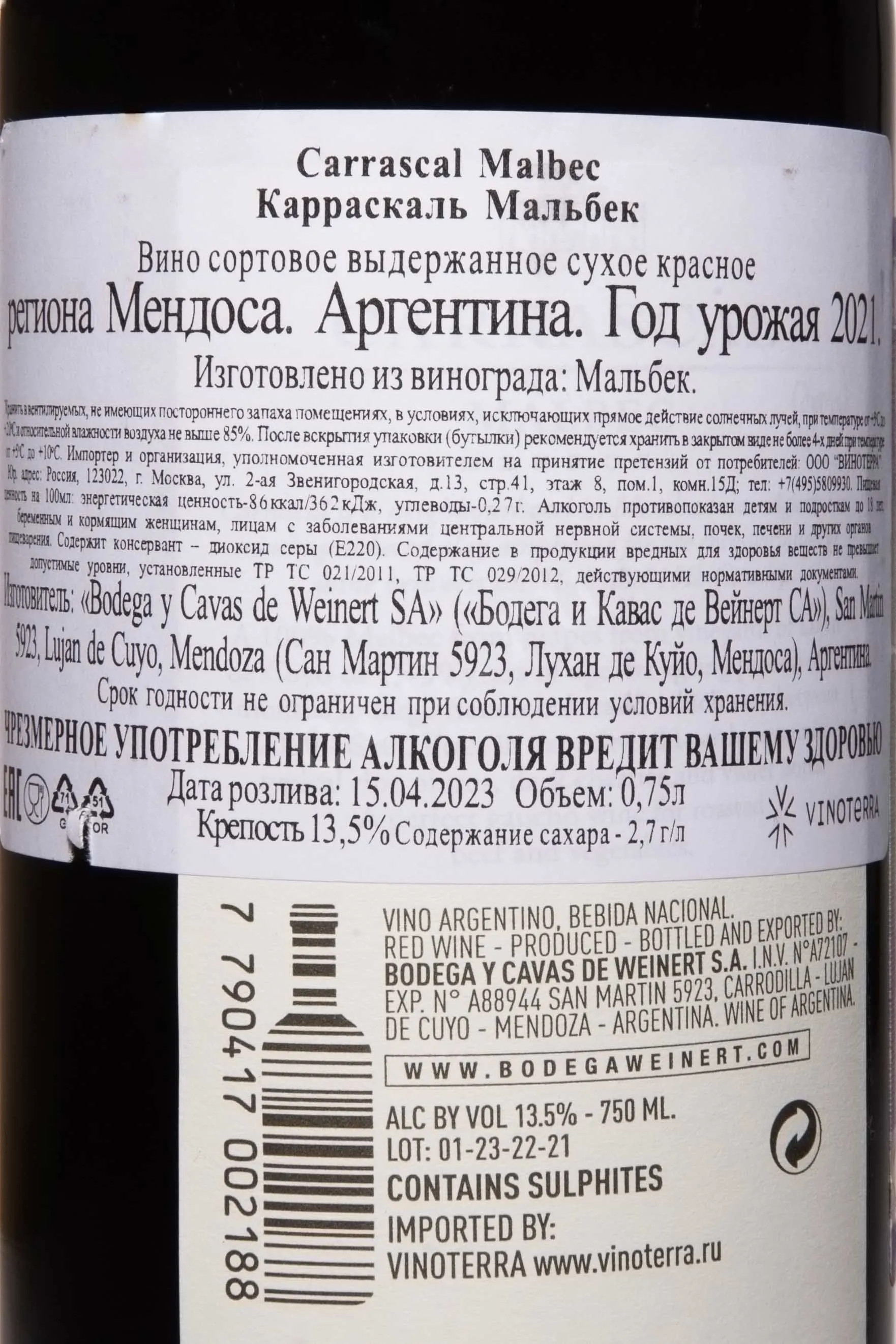 Вино Carrascal Malbec 0.75 л производится на высокогорных виноградниках субрегионов Лухан де Куйо и Майпу в Мендосе, где сочетание континентального климата и богатых минералами почв создает идеальные условия для вызревания ягод с насыщенным вкусом. Урожай собирается вручную в утренние часы, после чего ягоды подвергаются холодной мацерации для максимальной экстракции цвета и аромата. В процессе ферментации при контролируемой температуре в стальных чанах сохраняется элегантность и свежесть, затем напиток выдерживается до 12 месяцев во французских дубовых бочках, приобретая характерные оттенки специй и шелковистые танины.