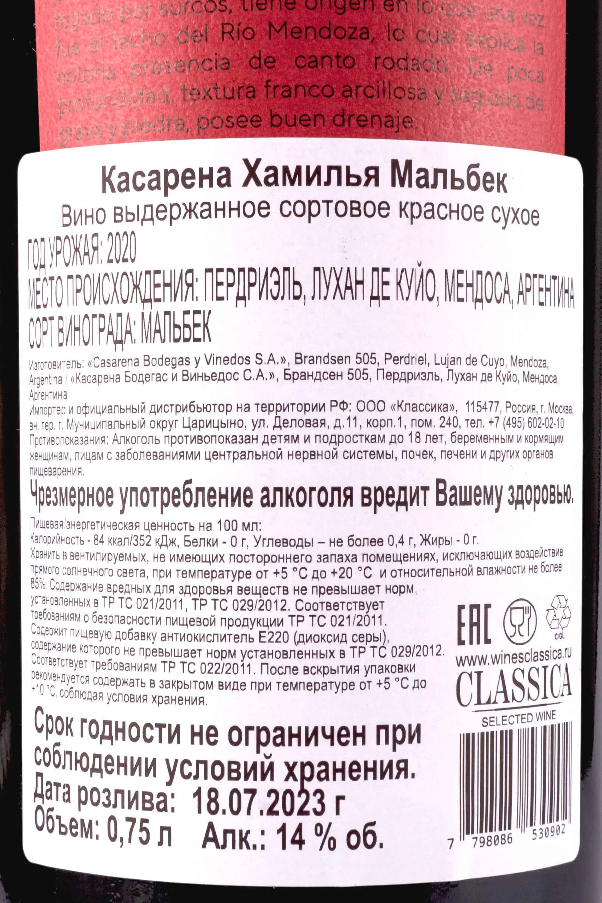 Красное сухое вино Casarena Jamilla Malbec 0,75 л – уникальное и неповторимое, поскольку заключает в себе самую суть небольшого виноградника Хамилья. Он находится на высоте более 900 метров над уровнем моря, что обеспечивает естественный баланс кислотности и насыщенность вкуса. Тонкий слой почвы (примерно 40 см глубиной) покрывает каменную подложку из валунов. Лозы Мальбека, посаженные в середине 90-х гг. XX в., достигают возраста 30 лет. Урожай с них собирается вручную в прохладное ночное время, чтобы сохранить свежесть и ароматику ягод. Спонтанная ферментация с малолактикой проходит в небольших бетонных емкостях, что позволяет раскрыть сортовые особенности. Выдержка в течение 12 месяцев во французских дубовых бочках (второго года наполнения) придает вину структуру, глубину и элегантные древесные нюансы. Его потенциал составляет 10-15 лет.