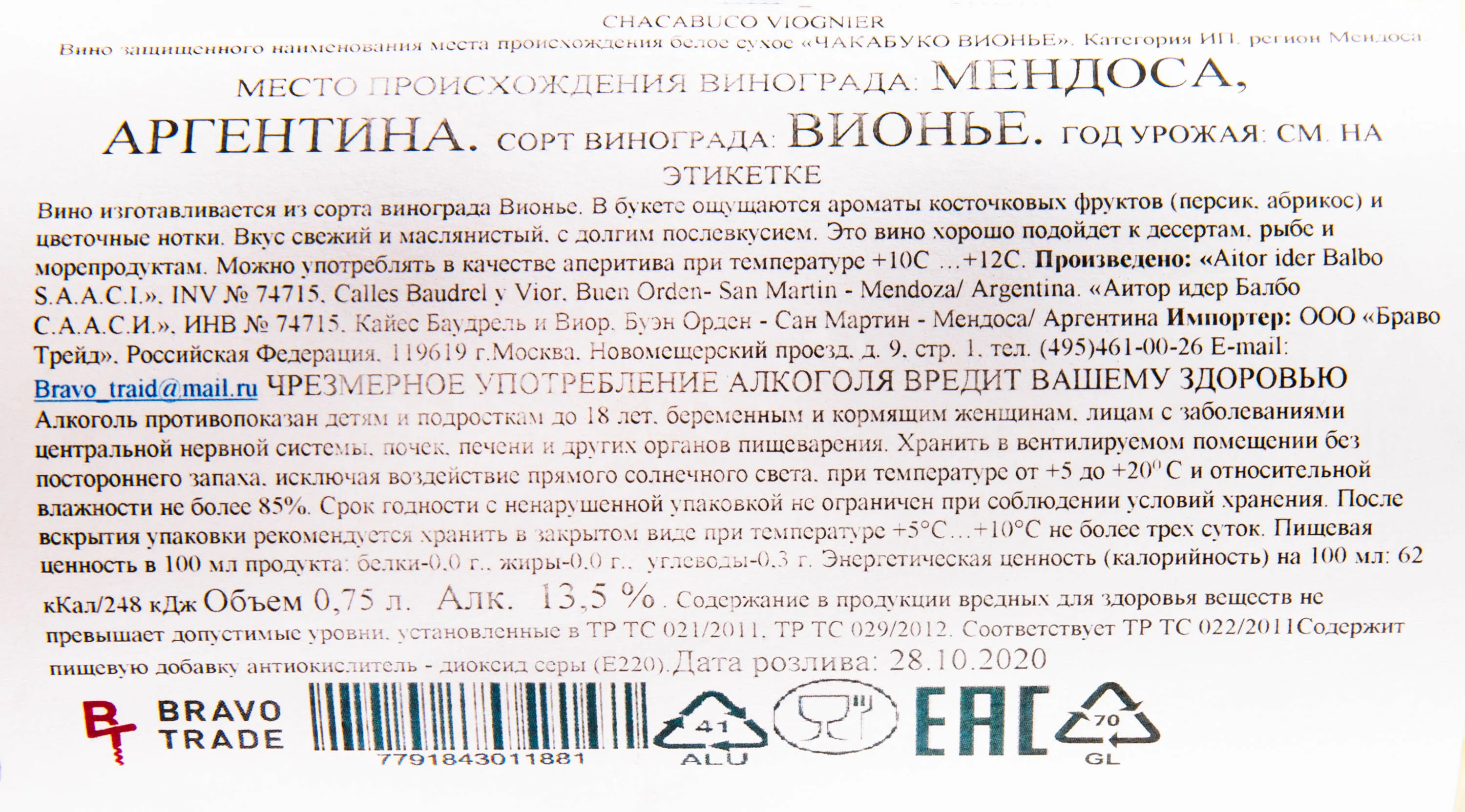 Белое сухое Chacabuco Viognier 0,75 л создано из сорта Вионье, который выращивается в долине Уков в условиях теплого климата с прохладными ночами, способствующими сохранению свежести и ароматики. Урожай собирают на пике спелости. Ягоды отделяют от гребней и мягко отжимают. Далее сусло подвергается ферментации в резервуарах из нержавеющей стали при постоянной невысокой температуре, что позволяет сберечь натуральные фруктовые оттенки. Недолгая выдержка осуществляется в тех же емкостях, что способствует сохранению свежести и чистоты вкуса вина.