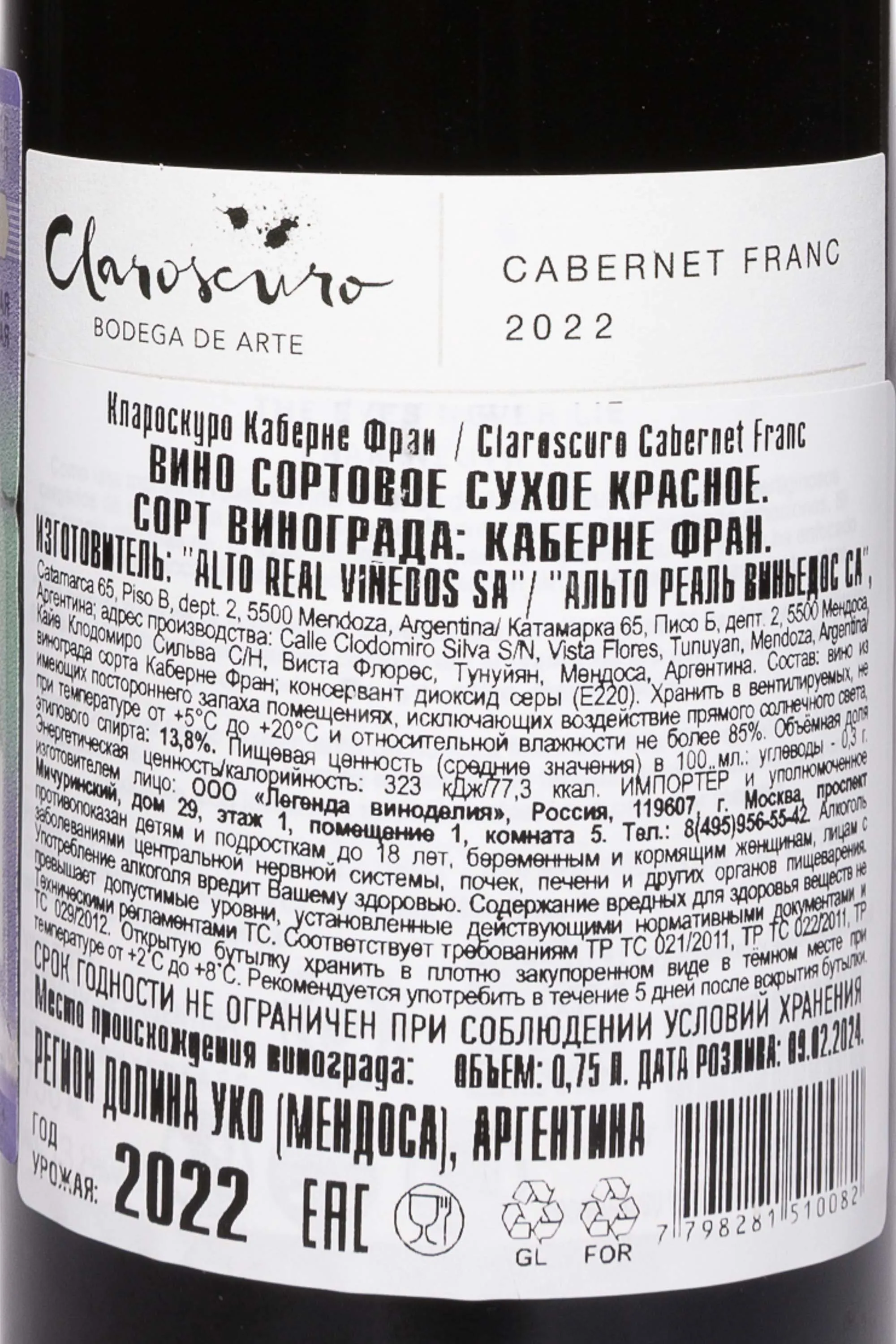 Красное сухое вино Claroscuro Cabernet Franc 2022 год 0,75 л производится из сырья с одного участка в районе Виста Флорес. Сорт Каберне Фран собирается ручным способом с тщательной сортировкой гроздей. Перед ферментацией проводится краткосрочная мацерация при низкой температуре в бетонных резервуарах. Затем начинается ферментация с использованием отборных дрожжей при температуре 26-28 °C, продолжающаяся около недели. После этого вино 25 дней остается на осадке, что усиливает его структуру и насыщенность. Далее следует выдержка во французских дубовых бочках в течение 9 месяцев, которая придает дополнительные нюансы вкусу и аромату. Разлитый в бутылки напиток «отдыхает» в погребе винодельни ещё полгода.