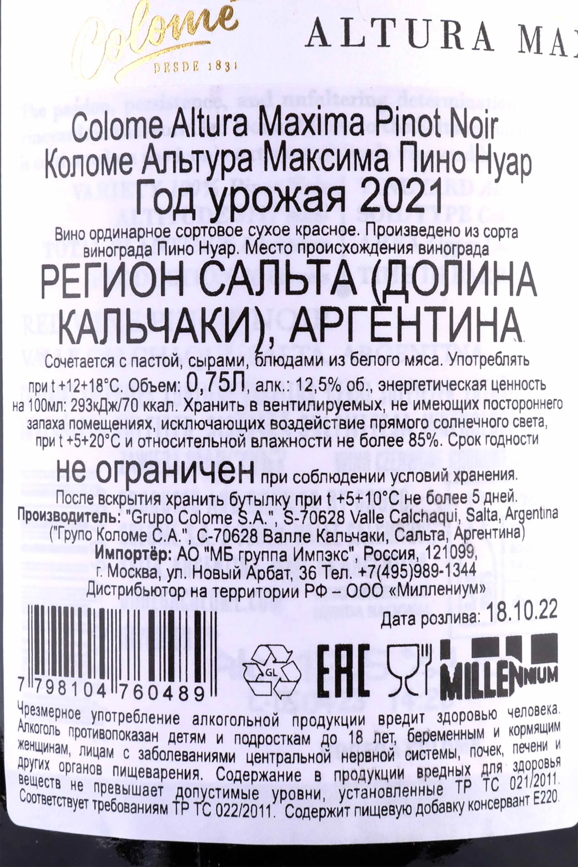 Красное сухое вино Colome Altura Maxima Pinot Noir 0,75 л производится из Пино Нуара с одного из самых высокогорных виноградников мира. Он располагается на высоте более трех тысяч метров в регионе Сальта. Экстремальные условия выращивания, резкие перепады температур и интенсивные солнечные лучи придают ягодам особую концентрацию сладости и насыщенности.Грозди собирается вручную с максимальной осторожностью, чтобы сохранить его целостность. Ферментация проходит в нержавеющих емкостях при контролируемой температуре, что позволяет подчеркнуть природную чистоту вкуса. Выдержка осуществляется в течение года в небольших бочках из французского дуба, за счет чего вино приобретает мягкие танины и сложность.