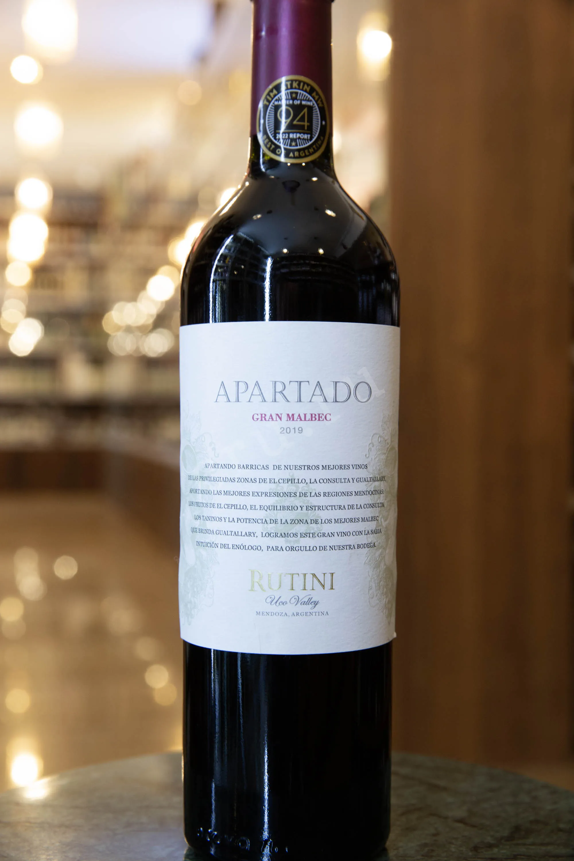 Красное сухое вино Gran Malbec Rutini Mendoza Apartado 2019 года 0,75 л - насыщенный и ароматный Мальбек с самобытным аргентинским стилем, который невозможно перепутать со старосветским. Виноград был собран ручным способом на 3 виноградниках в провинции Мендоса — Гуальтальяри, Альтамира и Ла Консульта. Ферментация проводилась в рамках традиционной технологии с малолактикой. Вино 16 месяцев выдерживалось во французских бочках, что придало ему сложность и глубину. Потенциал развития в бутылке — около 10 лет.