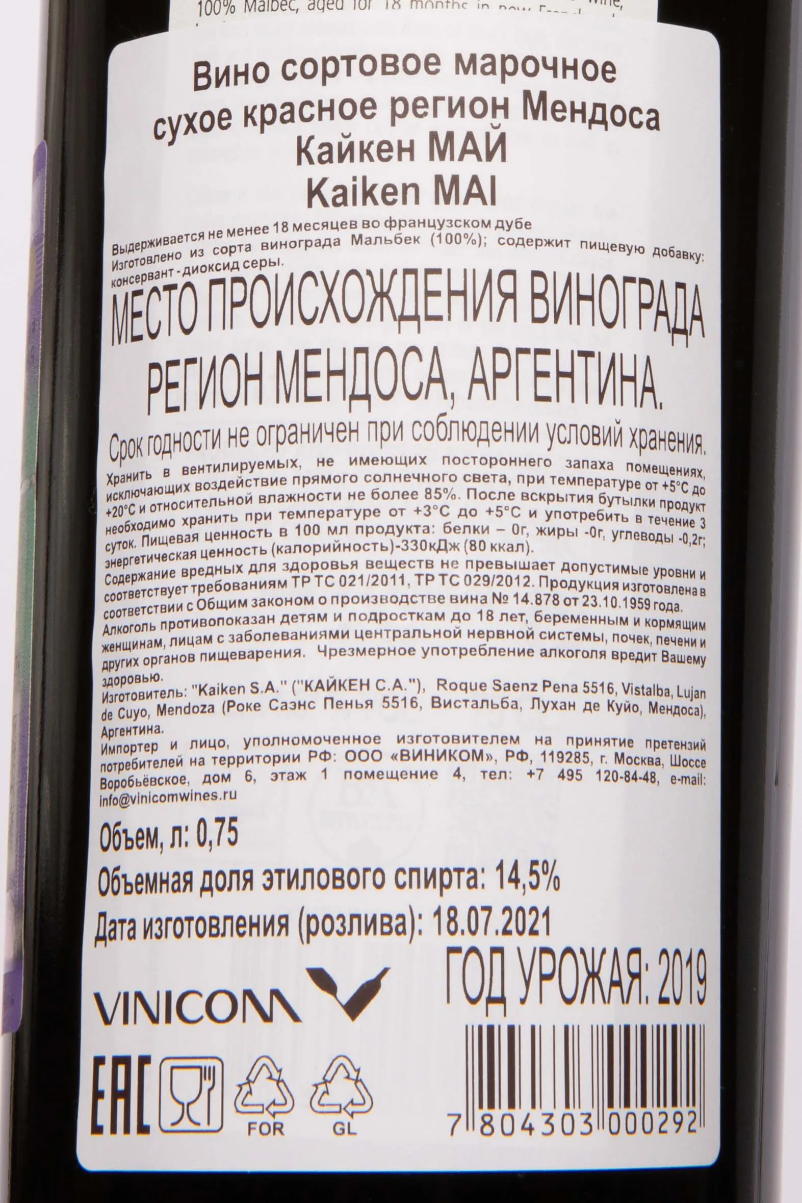 Красное сухое вино Kaiken MAI 2018 0,75 л в подарочной коробке — отличный выбор для презента по особенно торжественному поводу. Аргентинский Мальбек премиального класса получил высокие оценки от ведущих критиков. Его можно дегустировать уже сейчас, а можно отложить на 10-15 лет в виду хорошего потенциала для хранения. Виноград для производства собирали ручным способом со старых лоз, возраст которых превышает 100 лет. Они естественным образом дают низкие урожаи, что обеспечивает концентрацию вкуса и аромата. Обработка виноградников, расположенных в субрегионе Вистальба, осуществляется исключительно в рамках органических методов. Ферментация проходит в небольших стальных чанах при контролируемой температуре, что способствует сохранению свежести и фруктовых нот. Вино выдерживается в новых французских дубовых бочках в течение 18 месяцев, что придает ему сложность и полнотелость.