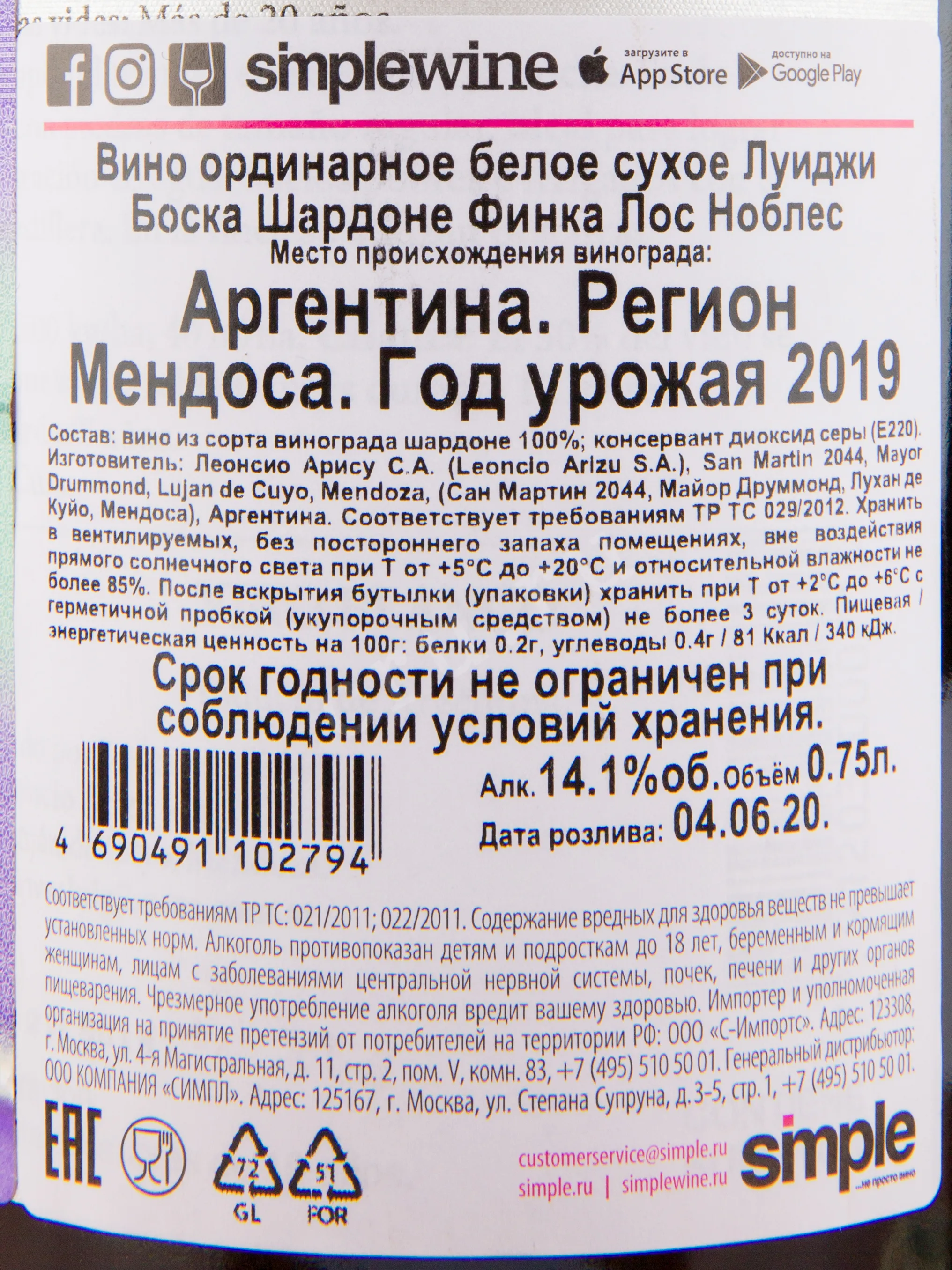 Белое сухое вино Luigi Bosca Chardonnay Finca Los Noble 2019 года 0,75 л удостоилось высоких баллов от ведущих критиков (не менее 90 из 100 возможных), было названо «незаурядным» и «особенным». Оно создано из сорта Шардоне с виноградников Ла Линда и Вистальба, которые находятся на высоте около 1000 м. Возраст лоз достигает 40 лет. Они глубоко укоренились на бедных органикой глинисто-известняковых почвах с каменной основой. Значительные суточные колебания температур способствуют медленному созреванию ягод. Урожай собирают вручную, тщательная сортировка позволяет выявлять лучшие грозди. Виноград полностью освобождают от гребней. Процесс прессования длится 6 часов, затем сусло в течение суток отстаивают при низкой температуре. Ферментация проходит частично в стали, частично в бочках из французского дуба (100% новые) с использованием натуральных дрожжей. По тому же раздельному принципу проводится полугодовая выдержка. Затем составляется купаж, который проходит деликатную фильтрацию и бутилируется.