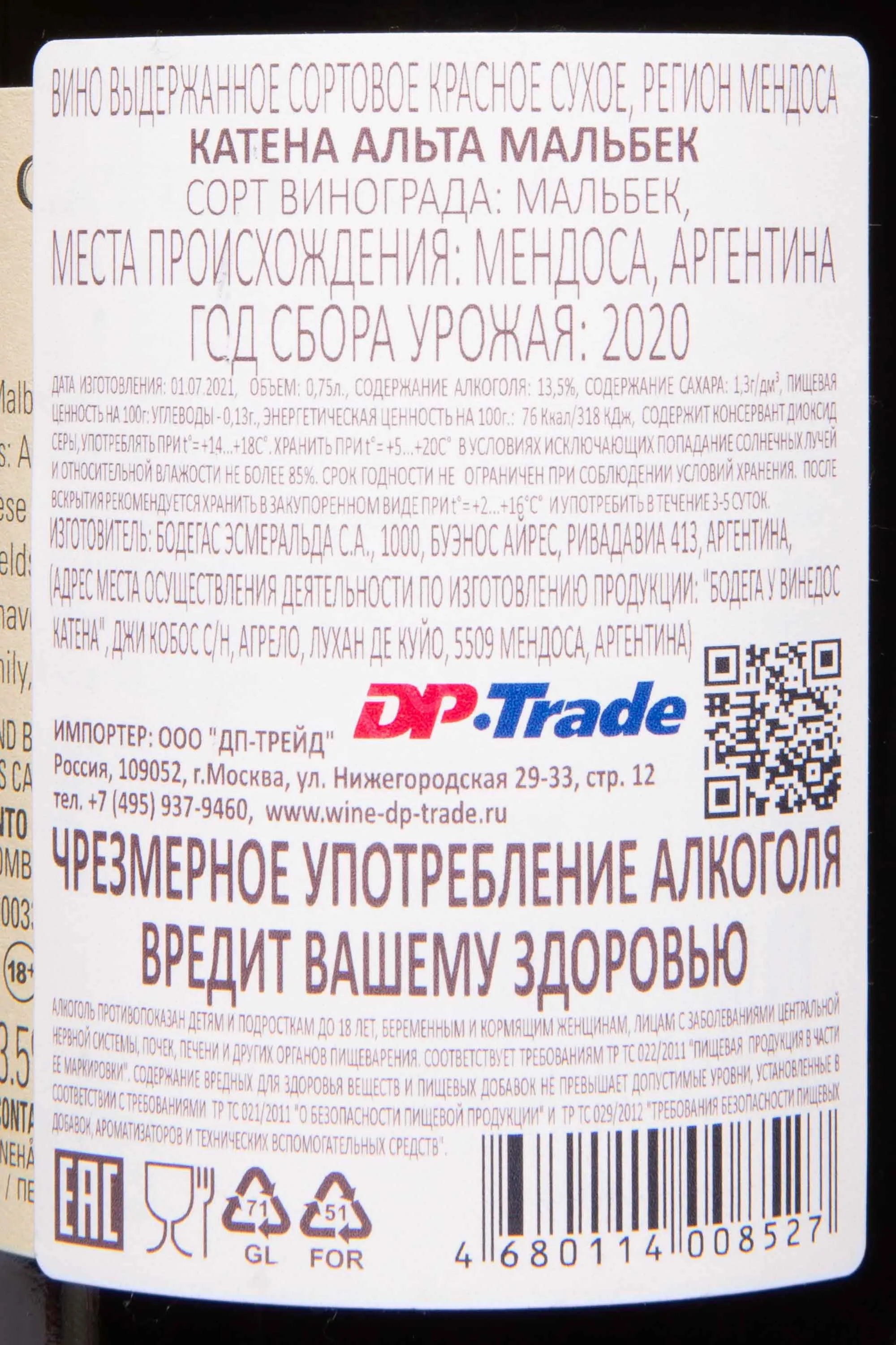Catena Alta Malbec 2020 0.75 л купить - Аргентинское вино Катена Альта Мальбек цена в магазине г. Москва, ул. Профсоюзная, д. 16/10 10:00-22:00 Ежедневно +7 (495) 920-20-02 info@cru.ru