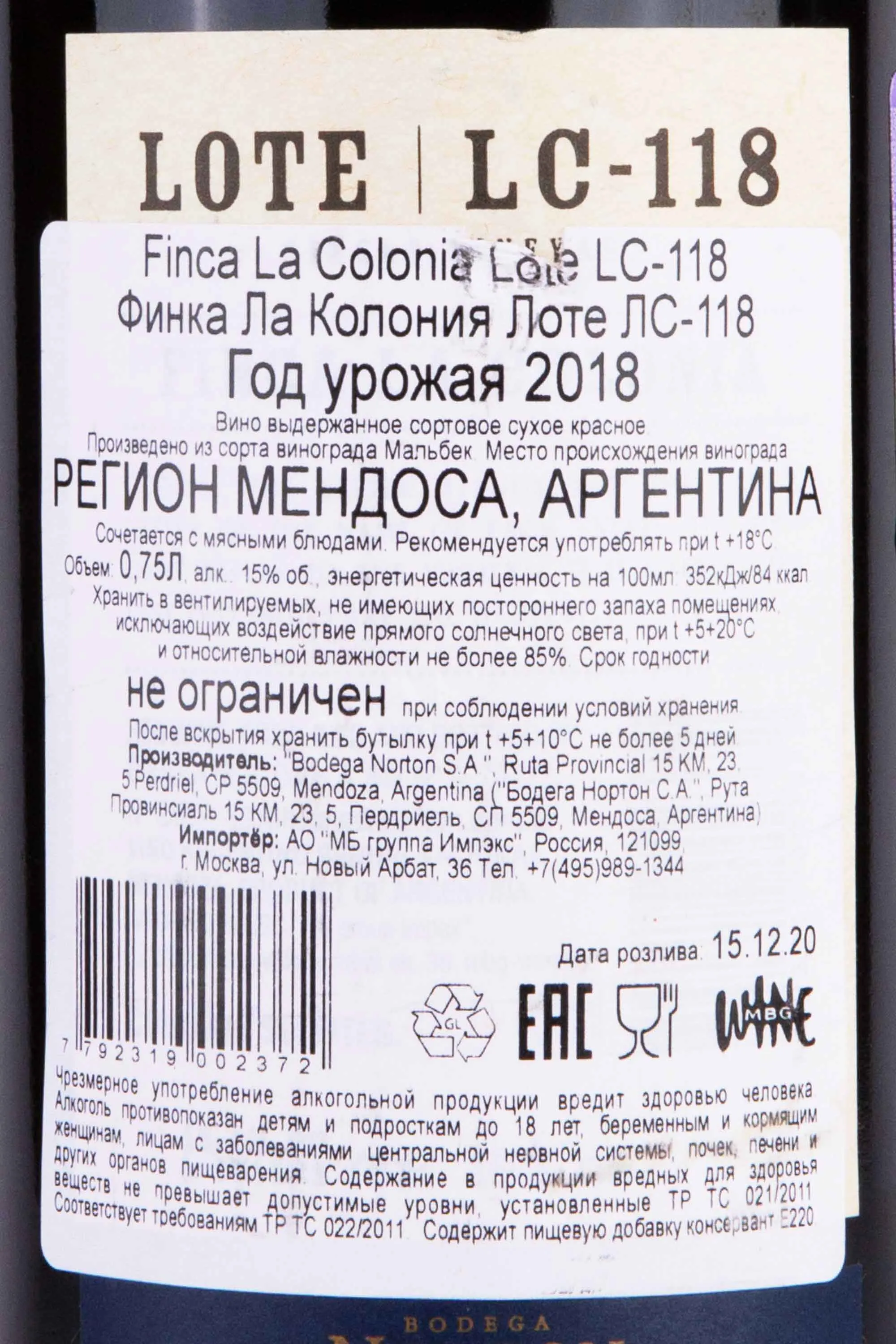 Красное сухое вино Norton Lote Finca La Colonia LC-118 0,75 - было выпущено ограниченным тиражом и является желанным приобретением для ценителей и коллекционеров. Оно изготовлено из Мальбека с виноградников поместья Финка Ла Колония в западной части региона Лухан де Куйо, которые разбиты у подножия гор Анд на высоте 960 м на почвах аллювиального происхождения с содержанием ила и глины. Возраст лоз 24-28 лет, сбор урожая — ручной. Винификация полностью протекает в бочках из французского дуба, что придает вину особенно насыщенную текстуру и глубину вкуса. Выдержка длится 16 месяцев. Потенциал хранения в бутылке превышает 10 лет.