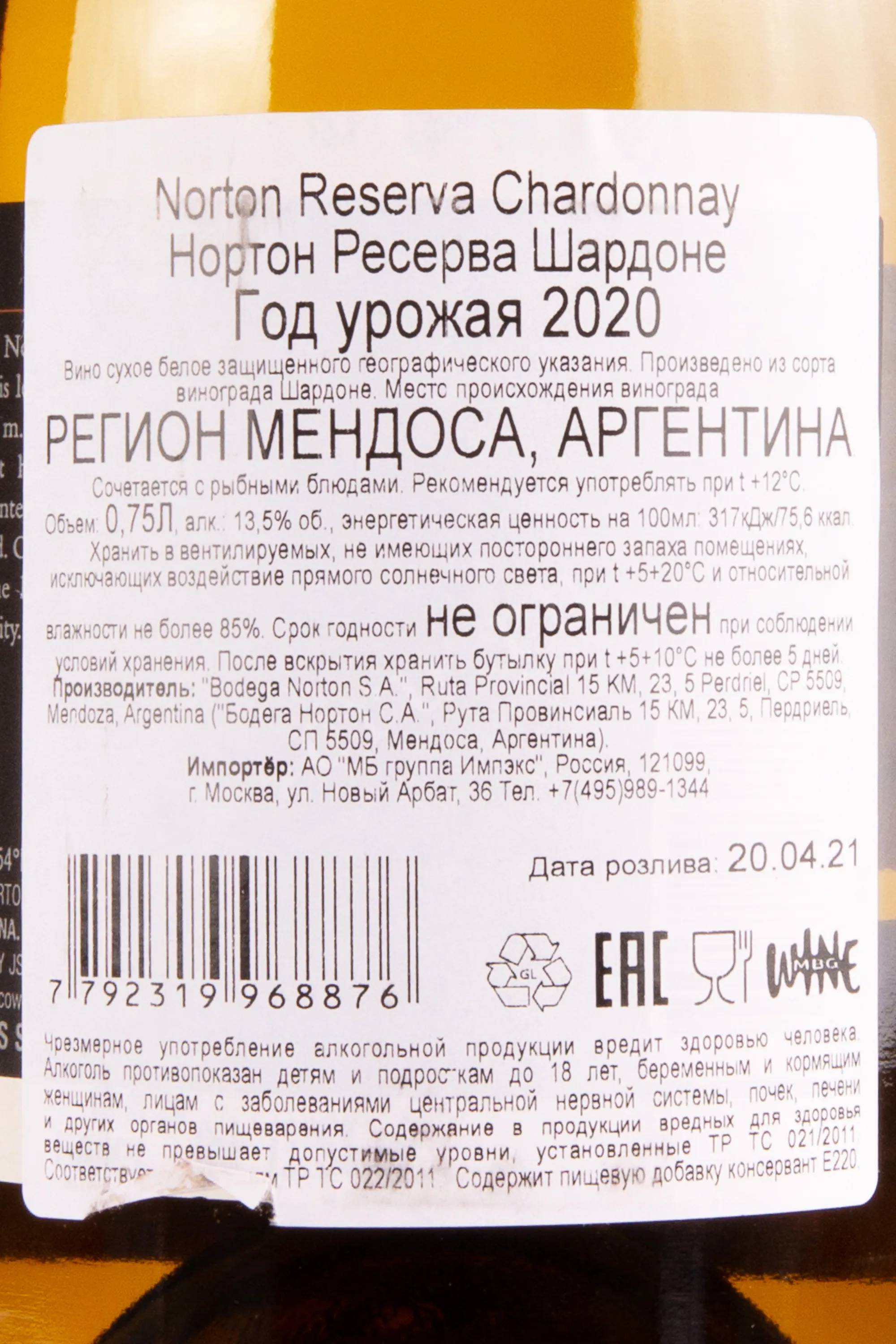 Белое сухое вино Norton Reserva Шардоне 0,75 л — одновременно элегантное и сложное, обладающее особенным стилем за счет выдержки в дубе. Урожай сорта Шардоне собирают вручную со старых 35-55-летних лоз. Грозди бережно складывают в один слой в 20-килограммовые ящики, чтобы сохранить их целостность и свежесть. Перед ферментацией проводится холодная мацерация для усиления структуры и глубины вкуса. Винификация включает брожение в дубовых бочках и выдержку в них же на осадке (около полугода), что придаёт напитку кремовую текстуру и сложные оттенки букета. После бутилирования вино еще 10 месяцев содержится в бутылках, которые хранятся в особых условиях в погребах винодельни.