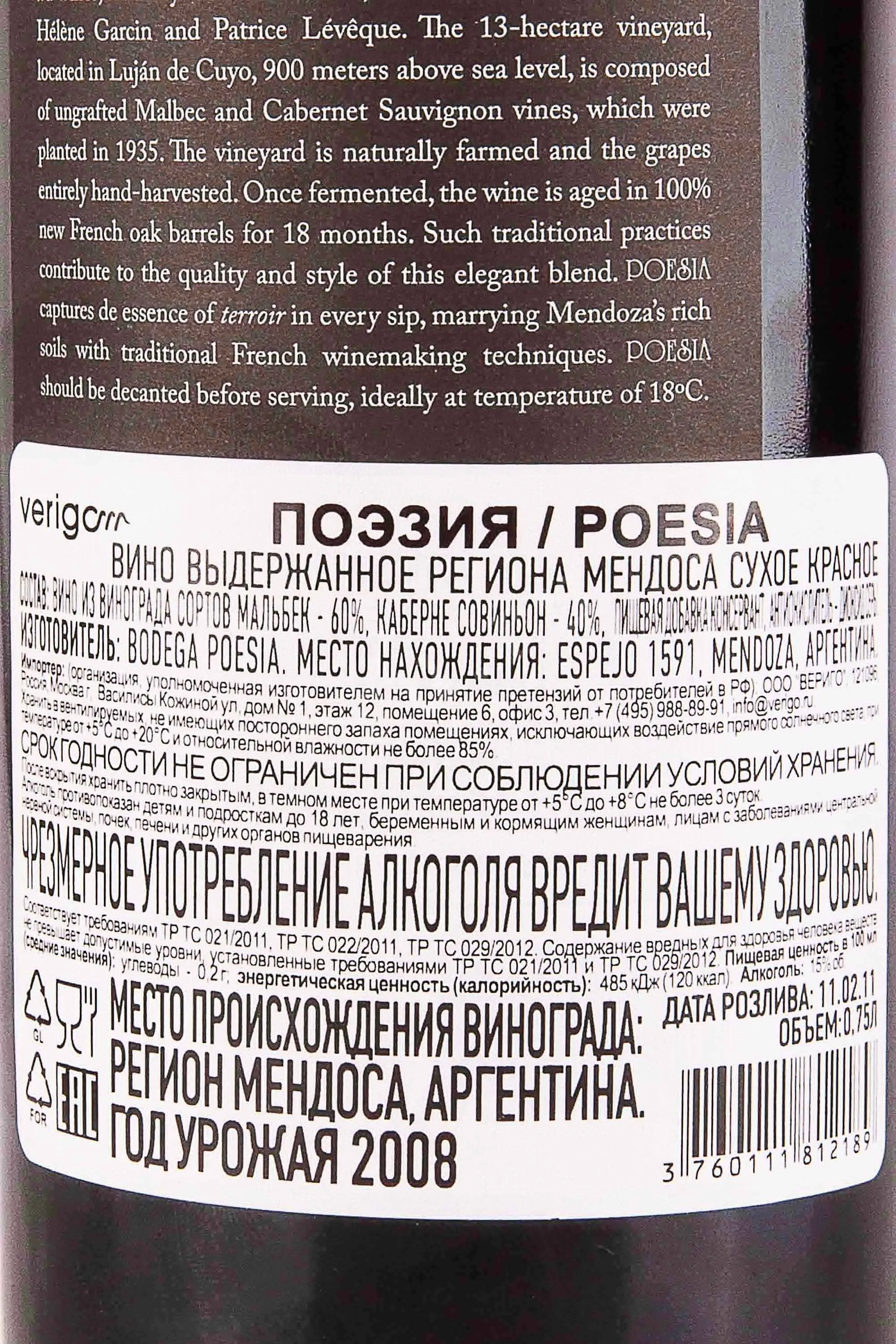 Красное сухое вино Poesia Mendoza 0,75 л обладает уникальным выразительным характером, который сложился на стыке двух культур и традиций — аргентинской и европейской. Особенный стиль — это результат творческих усилий с определенной долей риска. Виноград двух сортов был выращен на старых виноградниках (90 лет) региона Лухан-де Куйо в провинции Мендоса. Тщательно отбирались только лучшие грозди с самыми спелыми ягодами. Ферментация протекала в стальных резервуарах и дубовых бочках, обеспечивая оптимальное развитие вкусовых характеристик. Выдержка осуществлялась в бочках из французского дуба не менее 24 месяцев, что придало вину сложный аромат и глубокий вкус. Потенциал хранения в бутылке превышает 15 лет.