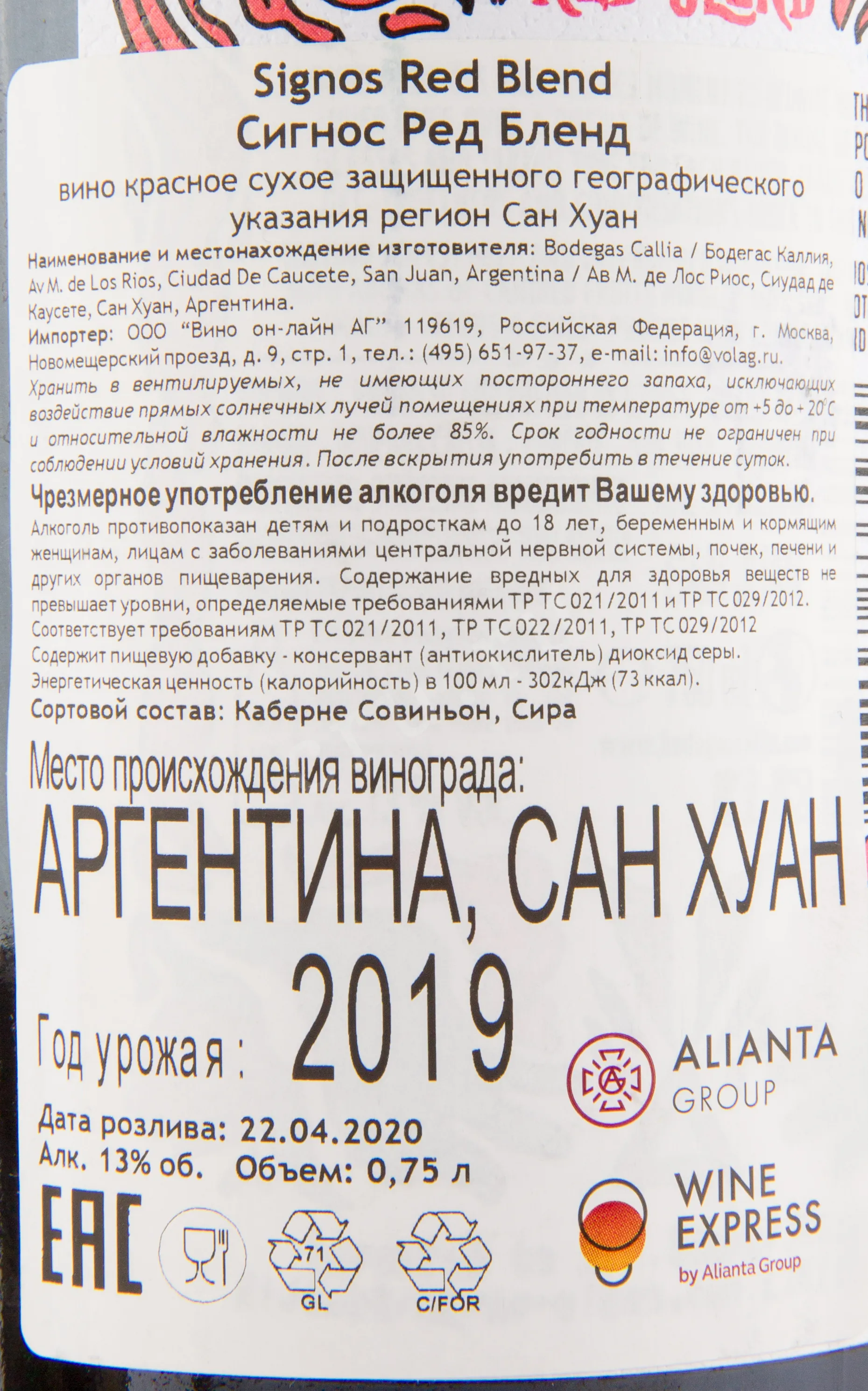 Красное сухое вино Signos Red Blend 0,75 л — интересный купаж сортов Сира и Каберне Совиньон, дающий представление о современном направлении в виноделии Аргентины с применением передовых технологий. Виноградники, откуда поступает сырье, расположены в долине Тулум на высоте 630 метров над уровнем моря. Лозы здесь растут на песчано-суглинистые почвах в засушливом климате, что способствует развитию насыщенных ароматов в ягодах. Сбор винограда осуществляется механически в первую неделю февраля, преимущественно ночью и на рассвете, что позволяет сохранить свежесть. Ферментация с отобранными штаммами дрожжей длится 10 дней (при температуре не выше 25 градусов). Примерно 30% вина выдерживают в бочках из французского и американского дуба, остальное — в стальных резервуарах.