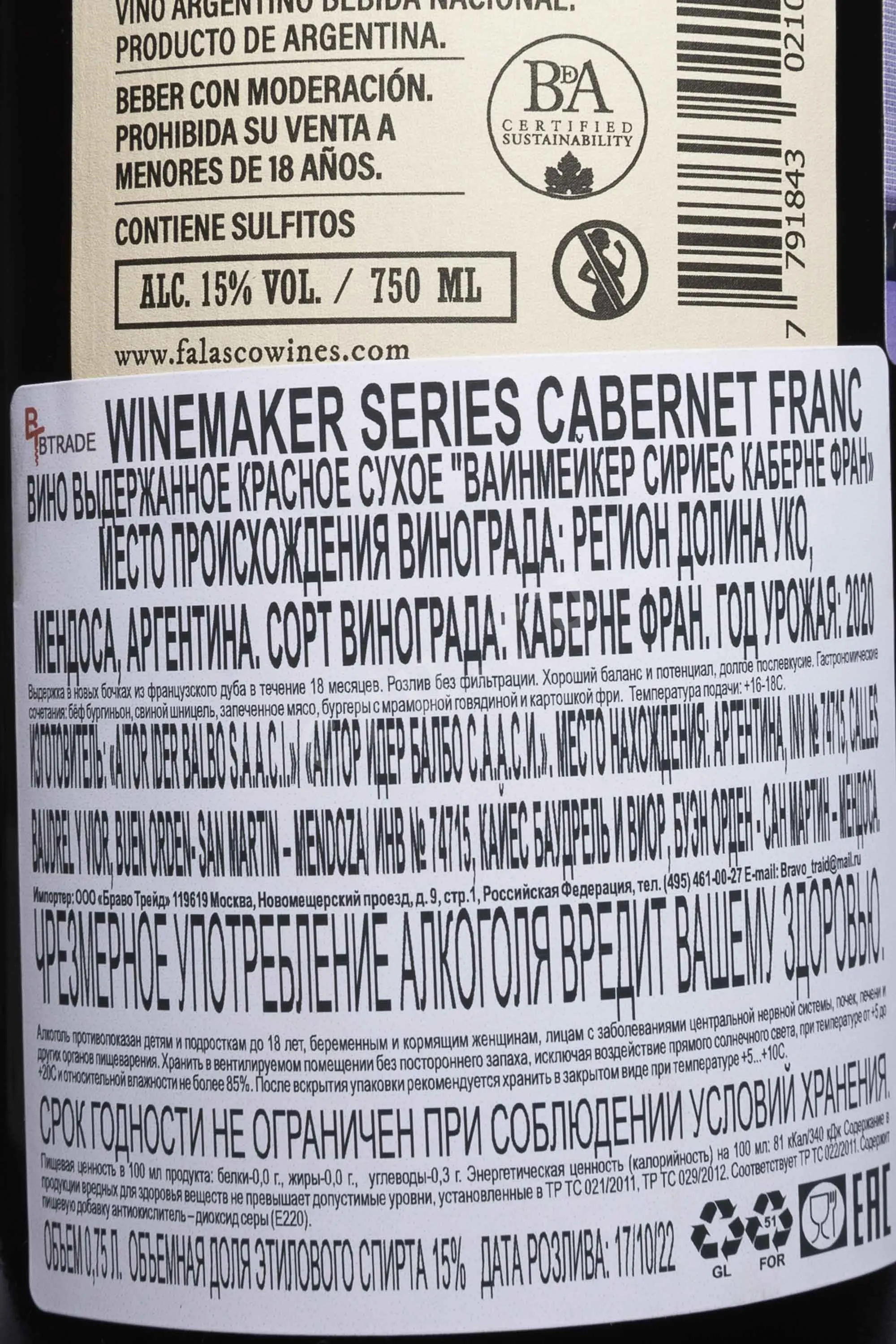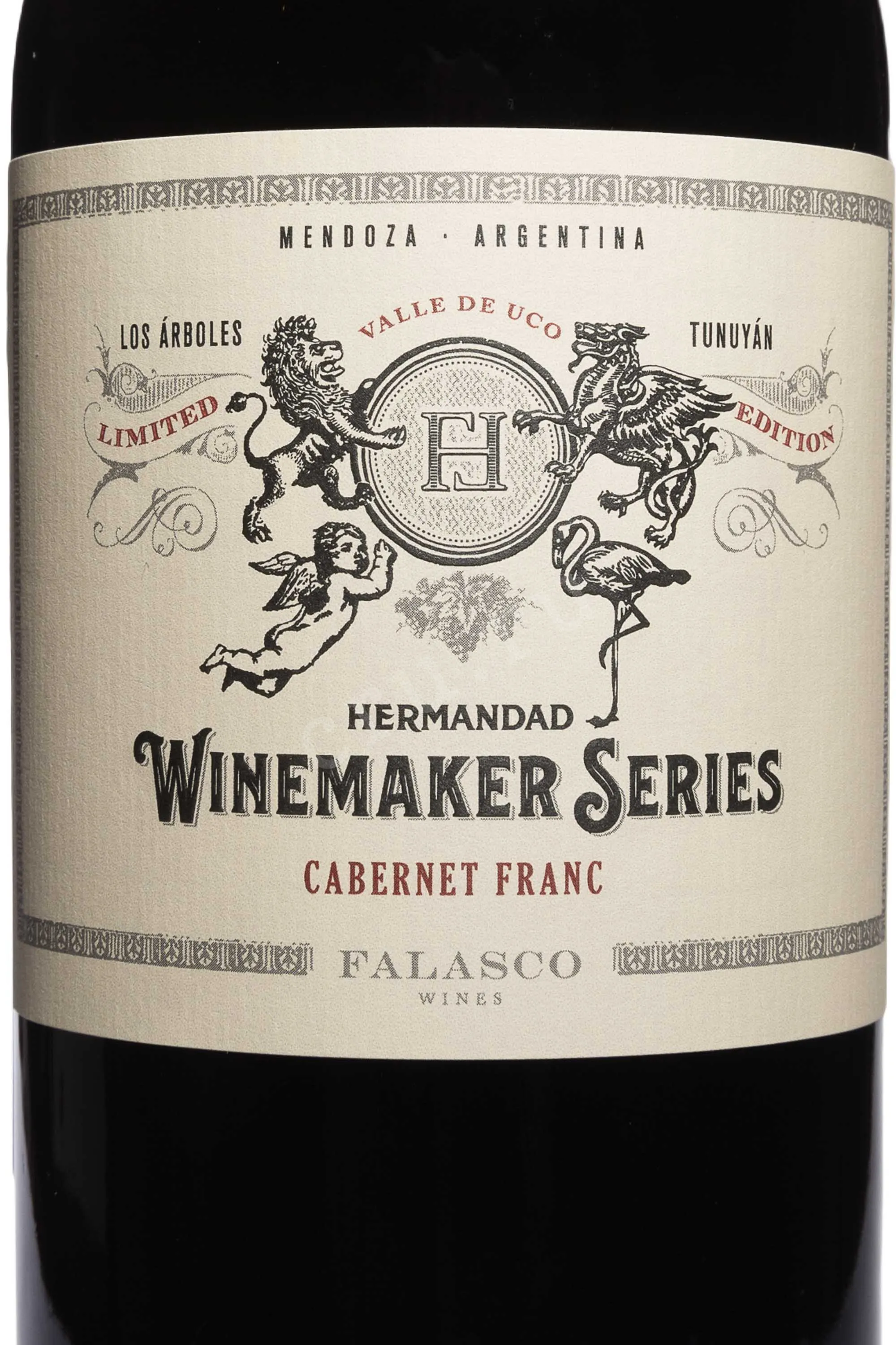 Красное сухое вино Hermandad Winemakers Series Cabernet Franc 0,75 л — полнотелое, с длительным послевкусием и солидным потенциалом хранения — 5-8 лет минимум. Оно производится в регионе Валье-де-Уко, Тунуйан. Виноградники расположены на высоте 1100 метров, что обеспечивает оптимальные условия для вызревания ягод. Сбор урожая проходит вручную, что позволяет отбирать только лучшие плоды. Перед ферментацией проводится 48-часовая мацерация для более интенсивного раскрытия цвета и аромата. Брожение осуществляется традиционным методом, а затем напиток выдерживается 18 месяцев в новых бочках из французского дуба, приобретая сложный вкус и насыщенный букет. Вино разливается в бутылки без предварительной фильтрации.