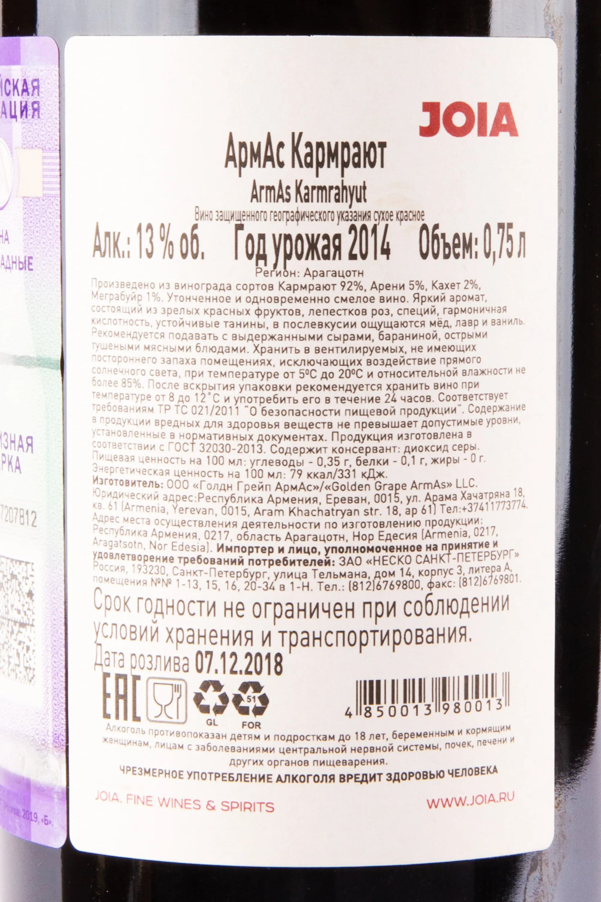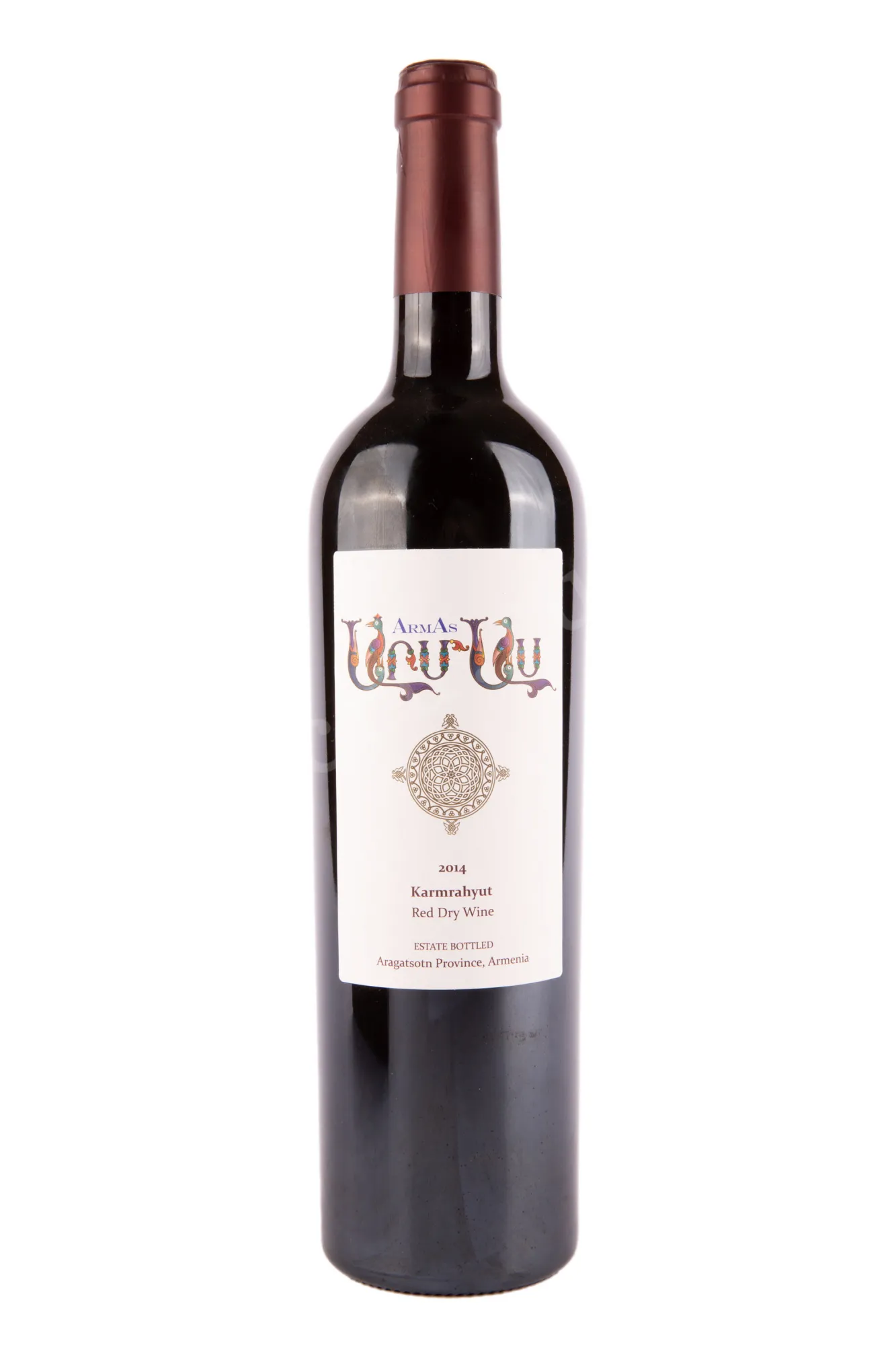 Красное сухое вино ArmAs Karmrahyut 0,75 л — одновременно гармоничное и колоритное, с плотным вкусом, выразительными таниными и приятной кислинкой. Виноград автохтонных сортов, главным из которых является Кармрают, собирается вручную на высоте 1050–1300 метров над уровнем моря в регионе Арагацотн. Почвы вулканического происхождения и значительные перепады температур между днем и ночью способствуют накоплению ароматных веществ и кислотности в ягодах. После тщательной сортировки виноград прессуется, сусло ферментируется при контролируемой температуре 25–27 °C, затем следует выдержка 24 месяца в бочках из французского и армянского дуба, что придает вину глубину и сложность вкуса. Оно получило золото от Артура Саркисяна и попало в его авторский год, удостоилось также медалей на конкурсах Japan Best Wine и Decanter World Wine Award, взяло Гран-При на Винном фестивале Арени.