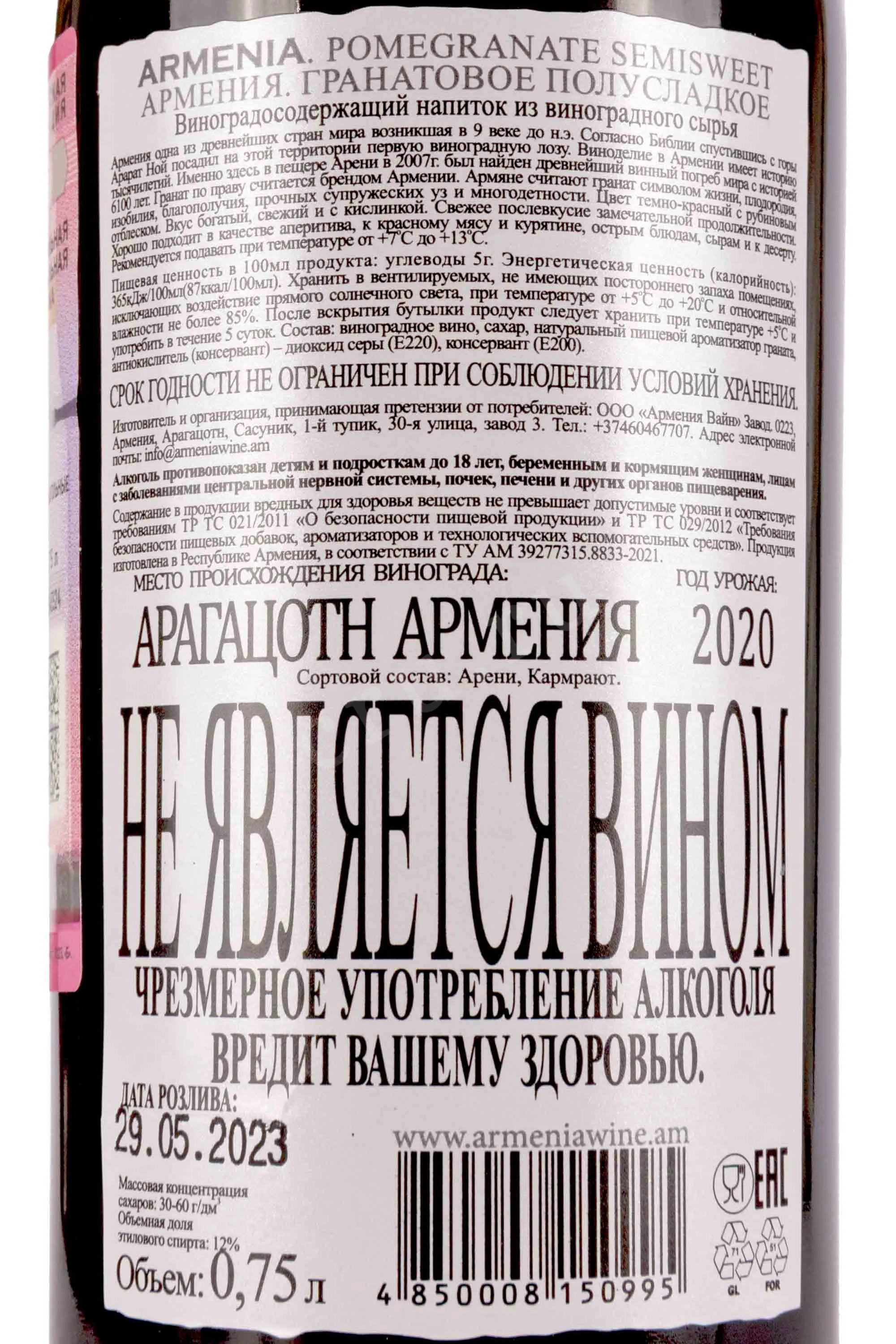 Красное полусладкое вино Armenia Pomegranate 0,75 л производится в Армении, в регионе Арагацотн, компанией Armenia Wine. Для его создания используют сок красных гранатов из Мегрийского региона и сок винограда сортов Арени и Кармрают в равных пропорциях. Сбор урожая проходит с начала октября до ноября. Ферментация длится две недели при температуре 26–28 °C в стальных емкостях. Это вино не выдерживают в дубовых бочках, чтобы сохранить свежесть и фруктовый характер.
