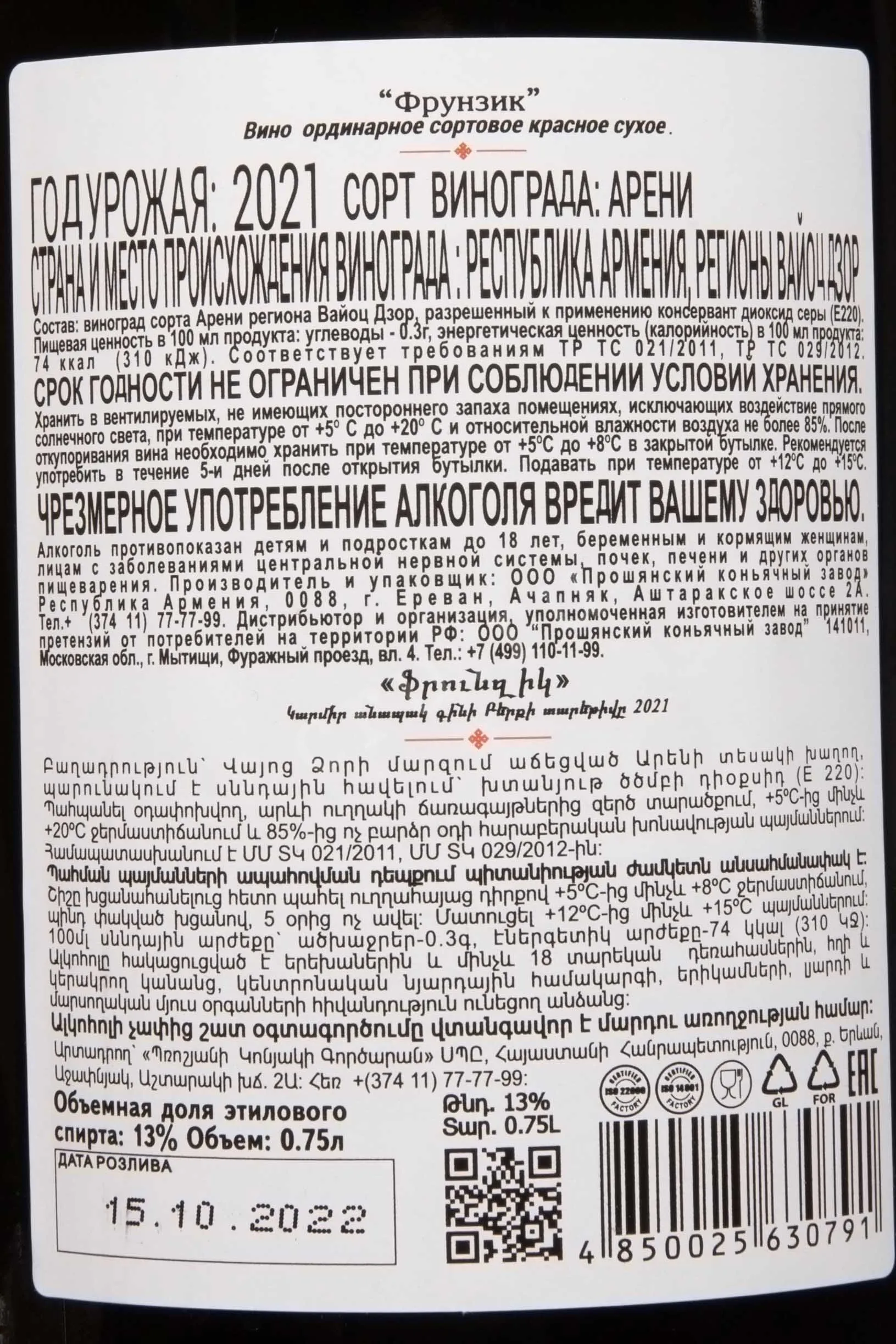 Вино Frunzik Red Dry 0,75 л от Прошянского Коньячного Завода изготовлено из старинного армянского сорта Арени, выращенного в уникальных условиях региона Вайоц Дзор. Вино посвящено легендарному актёру и режиссёру Фрунзику Мкртчяну, чьё творчество оставило яркий след в армянской культуре. Урожай собирается вручную, виноград тщательно сортируется, а после бережной ферментации напиток приобретает неповторимый характер.