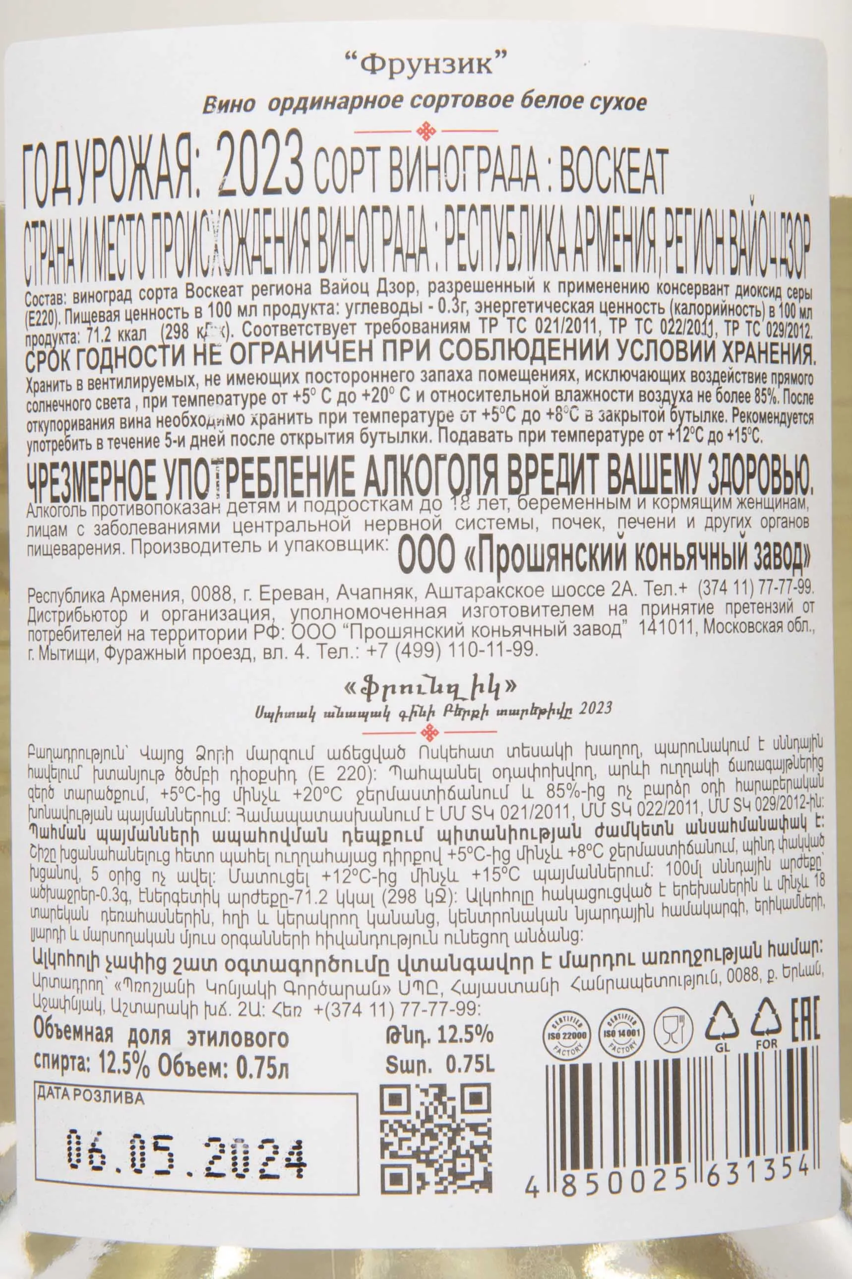 Вино Frunzik White Dry 0,75 л создано на Прошянском коньячном заводе из винограда сорта Воскеат, выращенного на горных склонах Вайоц Дзора. Урожай собирают исключительно вручную, отбирая наиболее зрелые и качественные грозди, которые затем бережно винифицируют с применением современных технологий, сохраняя при этом характерную свежесть и элегантность.