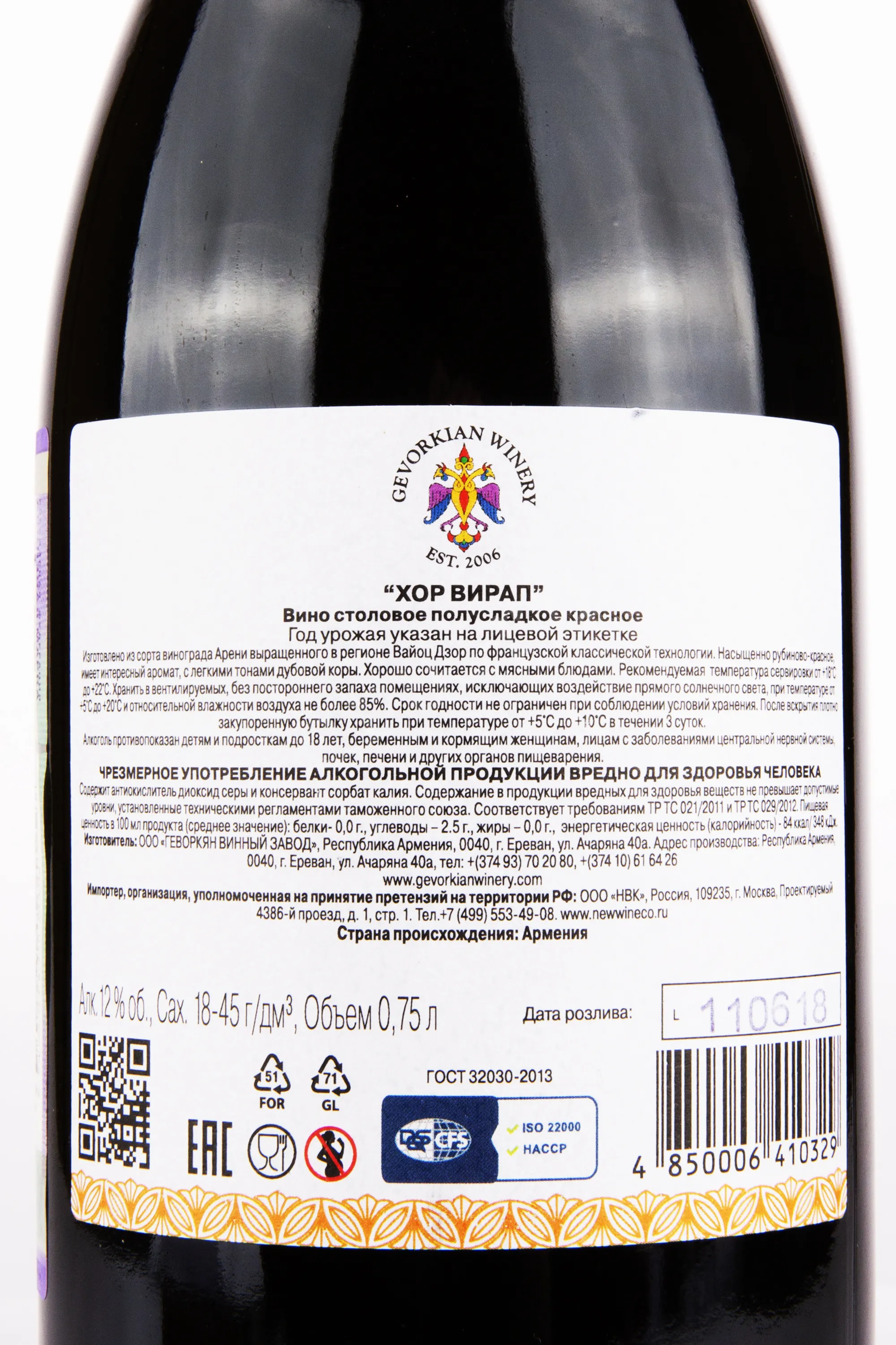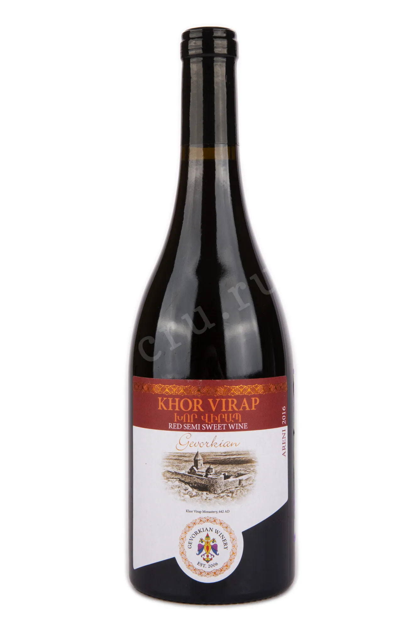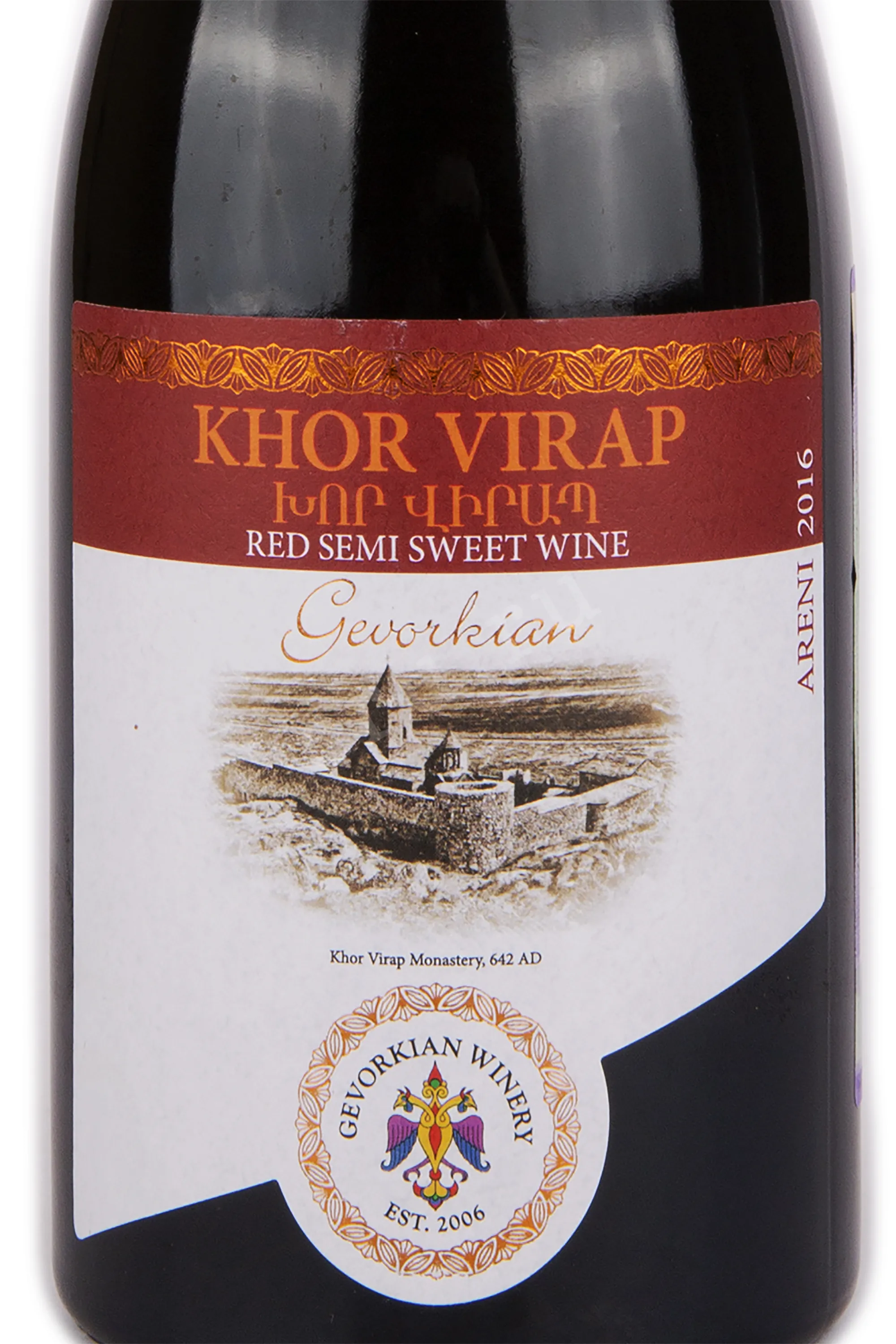 Вино Gevorkian Winery Khor Virap 2016 год 0,75 л — красное полусладкое вино, созданное армянским виноделом В. Геворкяном на собственных виноградниках. Напиток изготовлен из сорта Арени, культивируемого в Вайоц Дзоре. Название напитка выбрано в честь древнего армянского монастыря «Хор Вирап». Цвет глубокий, рубиново-красный. В аромате сочетаются оттенки спелых ягод вишни и сливы с тонким цветочным фоном. Вкус насыщен оттенками чернослива, ежевики и клюквы, дополнен фруктовыми нотами и лёгкой сладостью в завершении. Вино гармонично сочетается с мясными блюдами, свиными рёбрами на гриле и свежими фруктами.