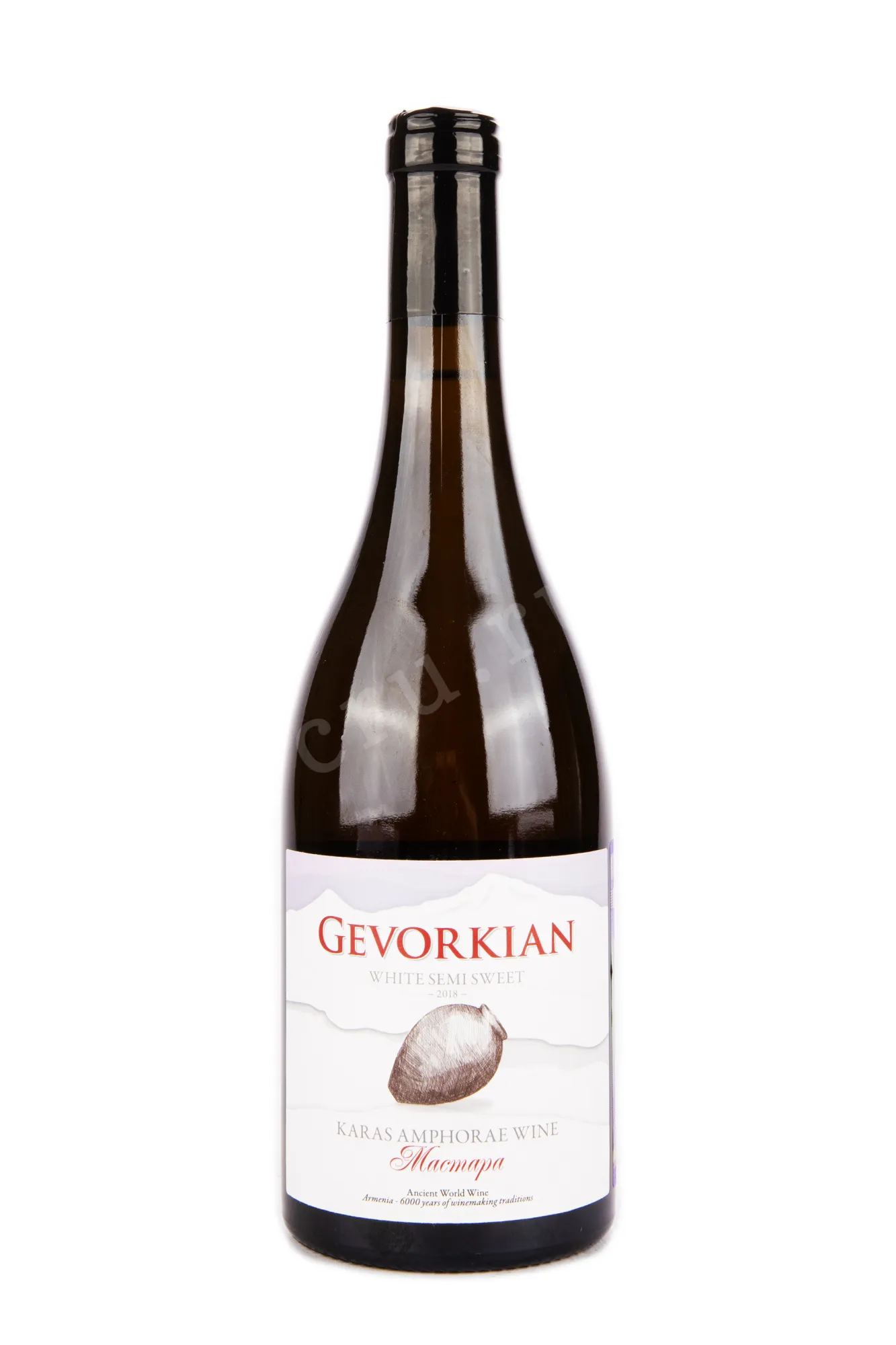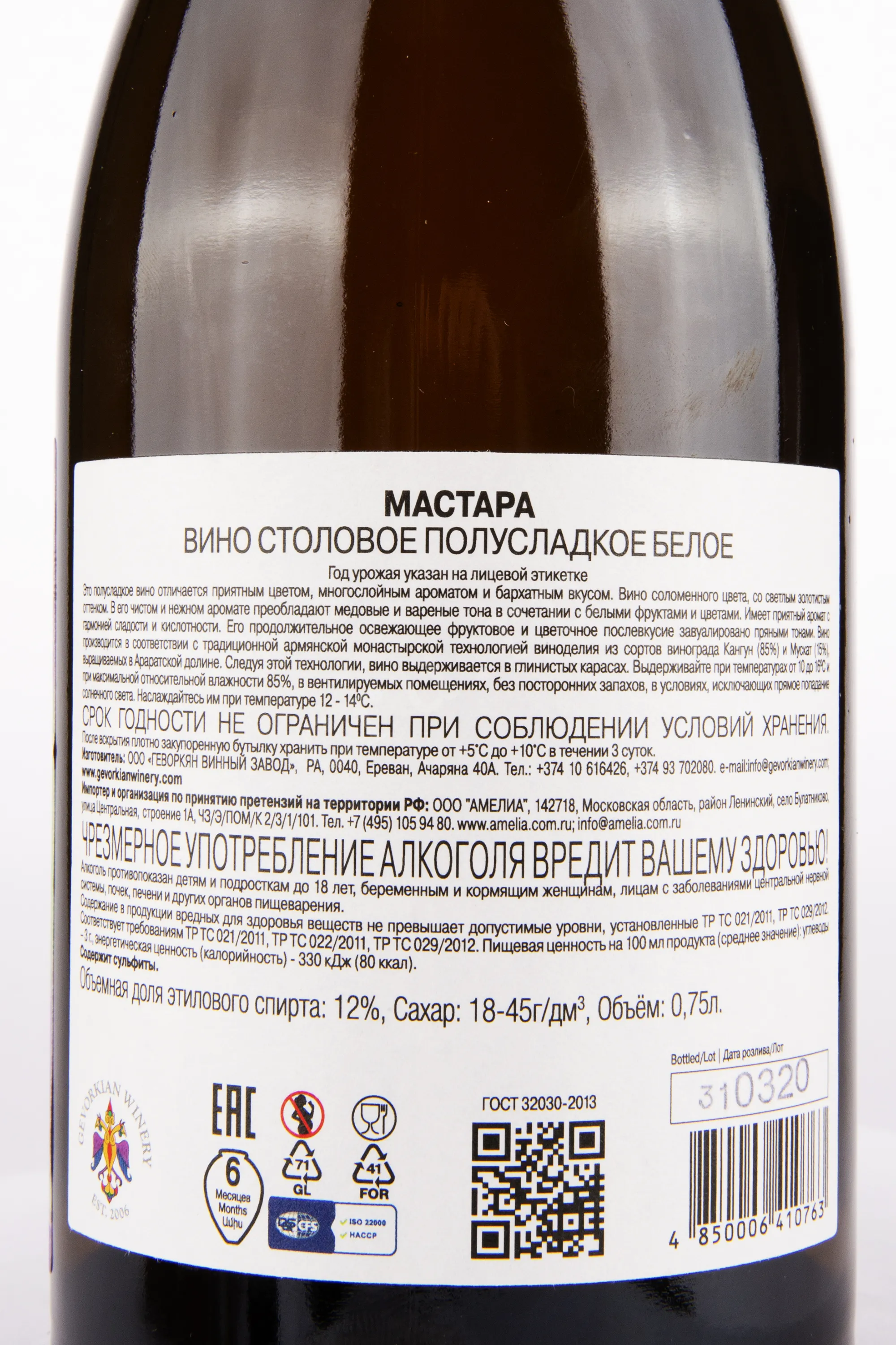 Вино Gevorkian Winery Mastara 0,75 л — полусладкое белое вино, представленное армянским виноделом Ваагом Геворкяном, основателем хозяйства «Геворкян Вайнери» в регионе Вайоц Дзор. Для напитка использованы местные сорта Кангун и Мускат Вардабуйр, произрастающие в Араратской долине. После ручного сбора ягоды прошли ферментацию в бетонных ёмкостях, с последующей выдержкой в традиционных глиняных сосудах — карасах. Напиток содержит 12% спирта и уровень сахара от 18 до 45 г/дм³. Цвет вина соломенно-золотистый. В аромате преобладают оттенки мёда и белых плодов, с лёгкими цветочными нюансами. Во вкусе ощущаются сухофрукты с деликатным медовым оттенком, переходящим в долгое, приятное завершение. Отлично подходит к мясным блюдам, десертам и фруктовым закускам.