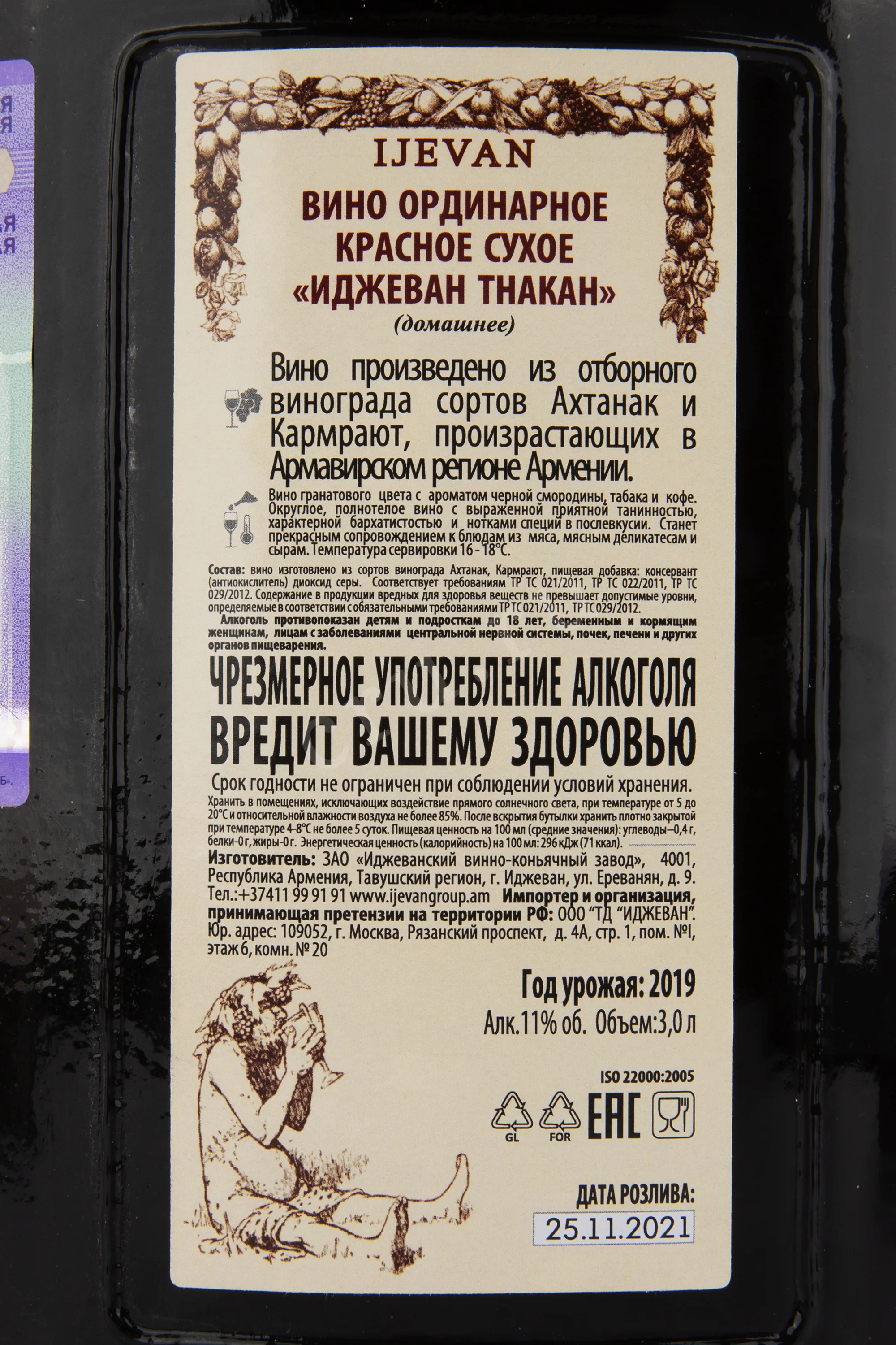 Вино Ijevan Tnakan Red Gift box 3 л создается на винодельне «Иджеван» в живописном армянском регионе Тавуш. Для производства тщательно отбирают виноград местных разновидностей, адаптированных к климату и особенностям почв этой местности. Напиток выдерживается в условиях, сохраняющих его яркие органолептические качества, и разливается в подарочную упаковку большого формата, удобную для компании.