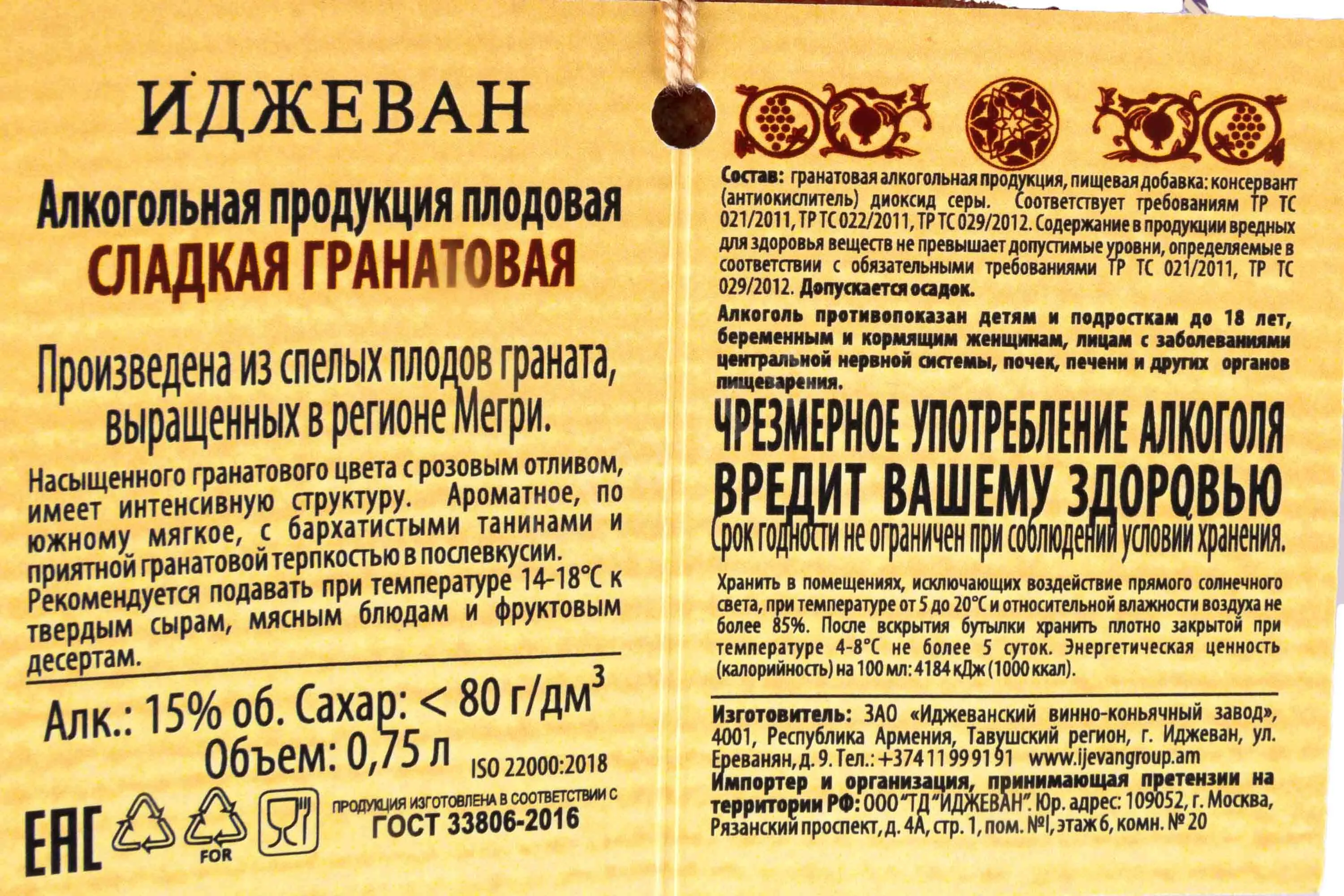 Ijevan Pomegranate Wine bottled in a ceramic bottle gift box 0,75 л — гранатовое вино от Иджеванского винно-коньячного завода, созданное методом традиционной винификации фруктовых напитков. Гранаты, собранные вручную, тщательно сортируют и подвергают бережному прессованию без кожуры, благодаря чему напиток приобретает яркий, насыщенный красный цвет с рубиновыми переливами. Аромат раскрывается нежными цветочными тонами, дополненными пряными акцентами и свежестью спелого граната. Во вкусе выражена умеренная кислотность, приятная терпкость с оттенками фруктовой сладости в мягком, продолжительном послевкусии. Особую ценность вино приобретает благодаря эксклюзивной керамической бутылке, оформленной в подарочной упаковке.