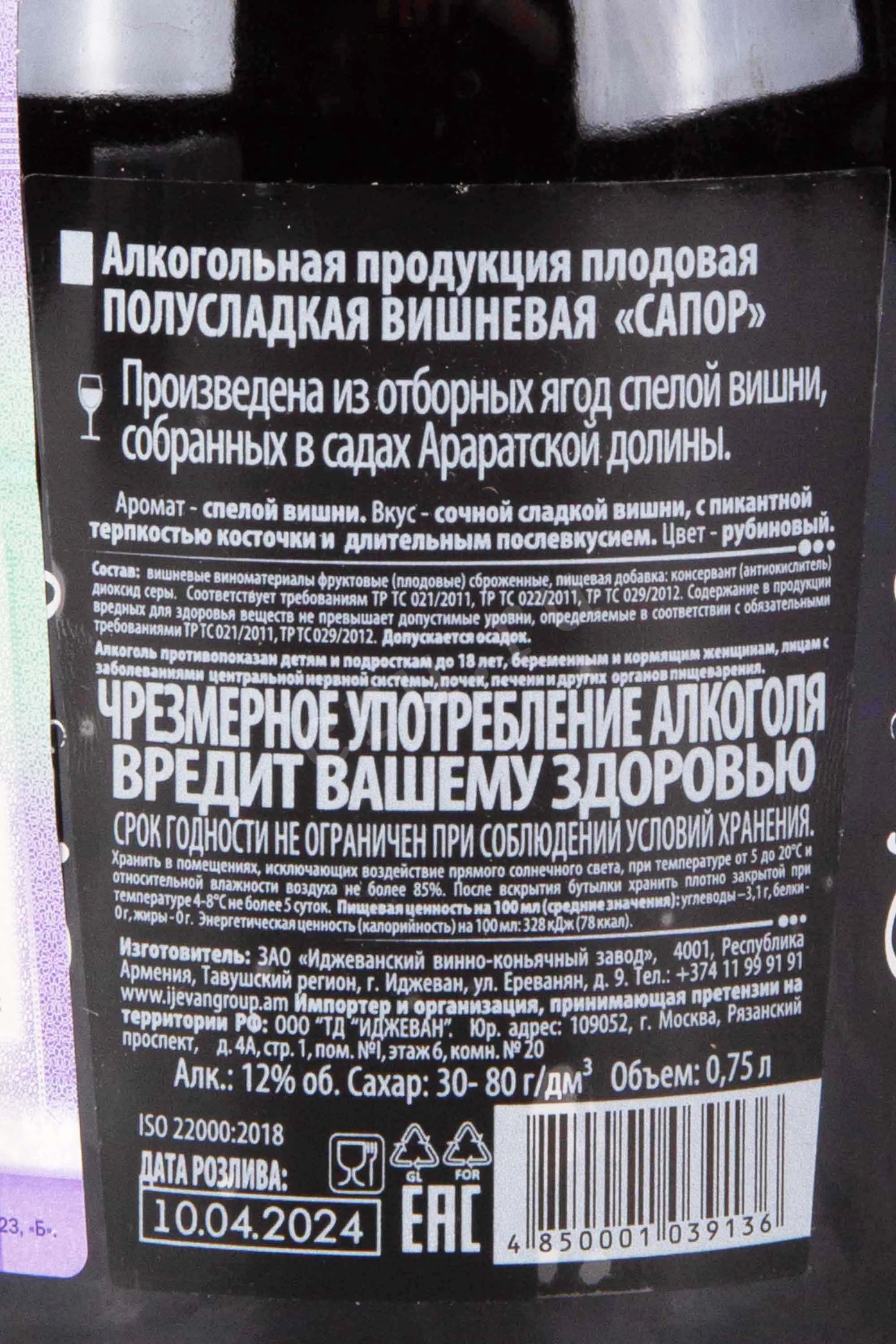 Ijevan Sapor Red Sweet 0,75 л — фруктовый тихий винный напиток, произведённый Иджеванским винно-коньячным заводом по технологии традиционного виноделия на основе отборной спелой вишни. Ягоды собирают исключительно вручную, тщательно сортируют и подвергают бережной переработке, сохраняя природную яркость вкуса и аромата. Напиток обладает глубоким, пурпурно-красным цветом. Аромат насыщенный и яркий, напоминающий цветущие вишнёвые сады. Вкус гармонично сбалансирован — сочная терпкость и лёгкая кислотность прекрасно дополняются приятной фруктозной сладостью, плавно переходящей в мягкое, долгое послевкусие.