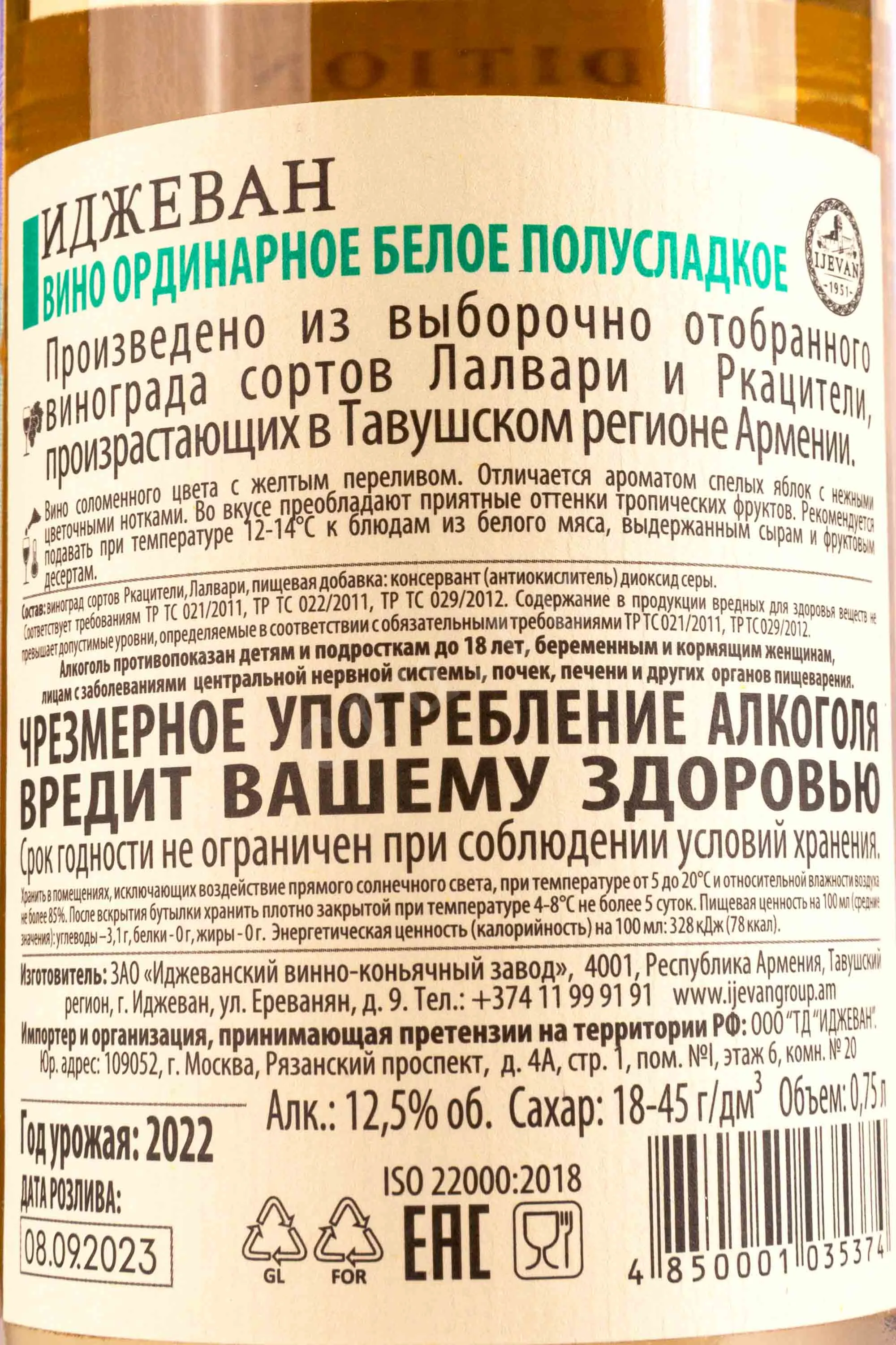 Вино Ijevan White Semi-Sweet 0,75 л производится компанией «Иджеван» в Тавуше, живописном регионе на севере Армении. Для создания вина используются два старинных местных сорта, которые отлично адаптировались к климатическим особенностям этого края. Собранный вручную виноград аккуратно перерабатывается, что позволяет сохранить естественные вкусоароматические характеристики.