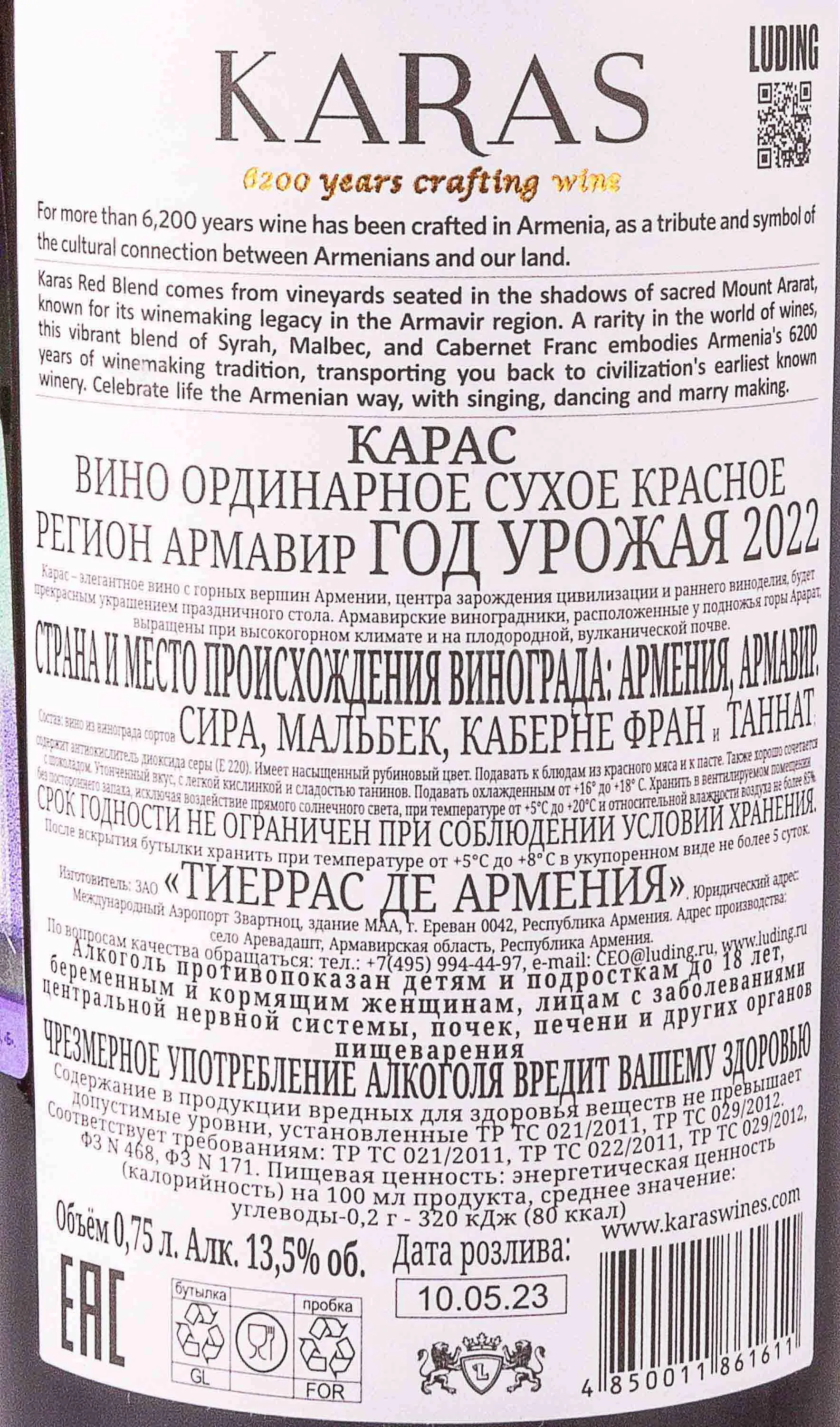 Karas Red Dry - выразительное красное сухое вино от армянского производителя "Тиеррас де Армения", расположенного в Армавирской долине, славящейся уникальным микроклиматом и вулканическими почвами. Для изготовления вина выбраны сорта Таннат, Сира, Мальбек и Каберне Фран, идеально адаптированные к условиям региона и дающие превосходный урожай. Виноград собирается вручную и тщательно сортируется, после чего проходит ферментацию при низких температурах. Дальнейшее созревание в нейтральных ёмкостях позволяет максимально раскрыть богатую палитру ароматов и сохранить естественные свойства каждого сорта.