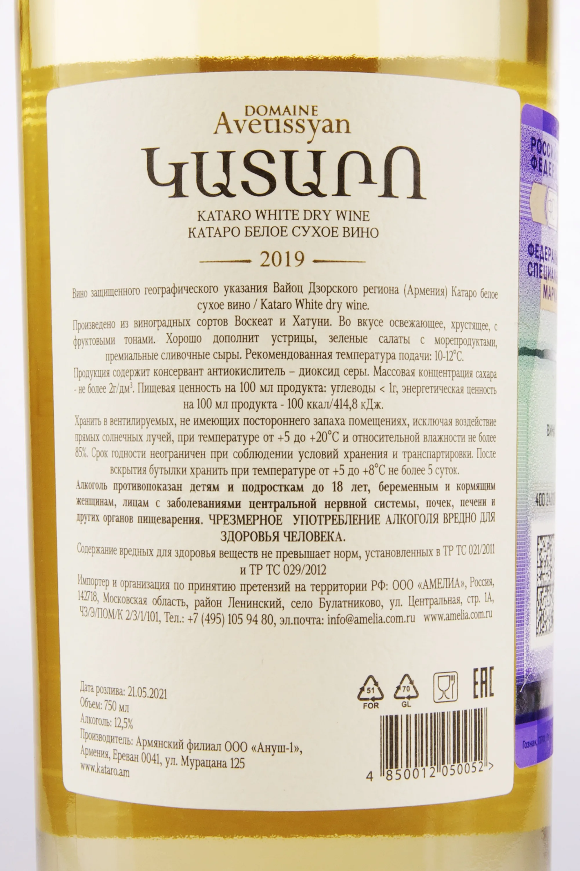 Белое сухое вино Kataro White создаётся компанией ООО "Ануш-1", ереванским подразделением известной армянской винодельни "Катаро". Для производства используются уникальные автохтонные сорта винограда Воскеат и Хатуни, выращенные на виноградниках горного региона Вайоц Дзор. Высокогорные участки с известково-каменистыми почвами придают напитку выразительную минеральность и подчёркивают сортовые особенности. Виноград собирают вручную, бережно сортируют и ферментируют в нейтральных ёмкостях, чтобы максимально сохранить свежесть и элегантность вкуса.
