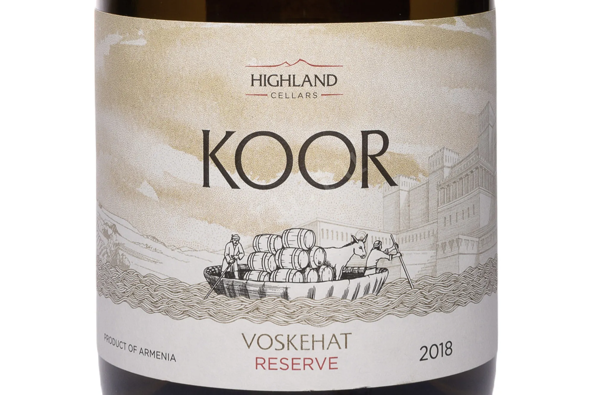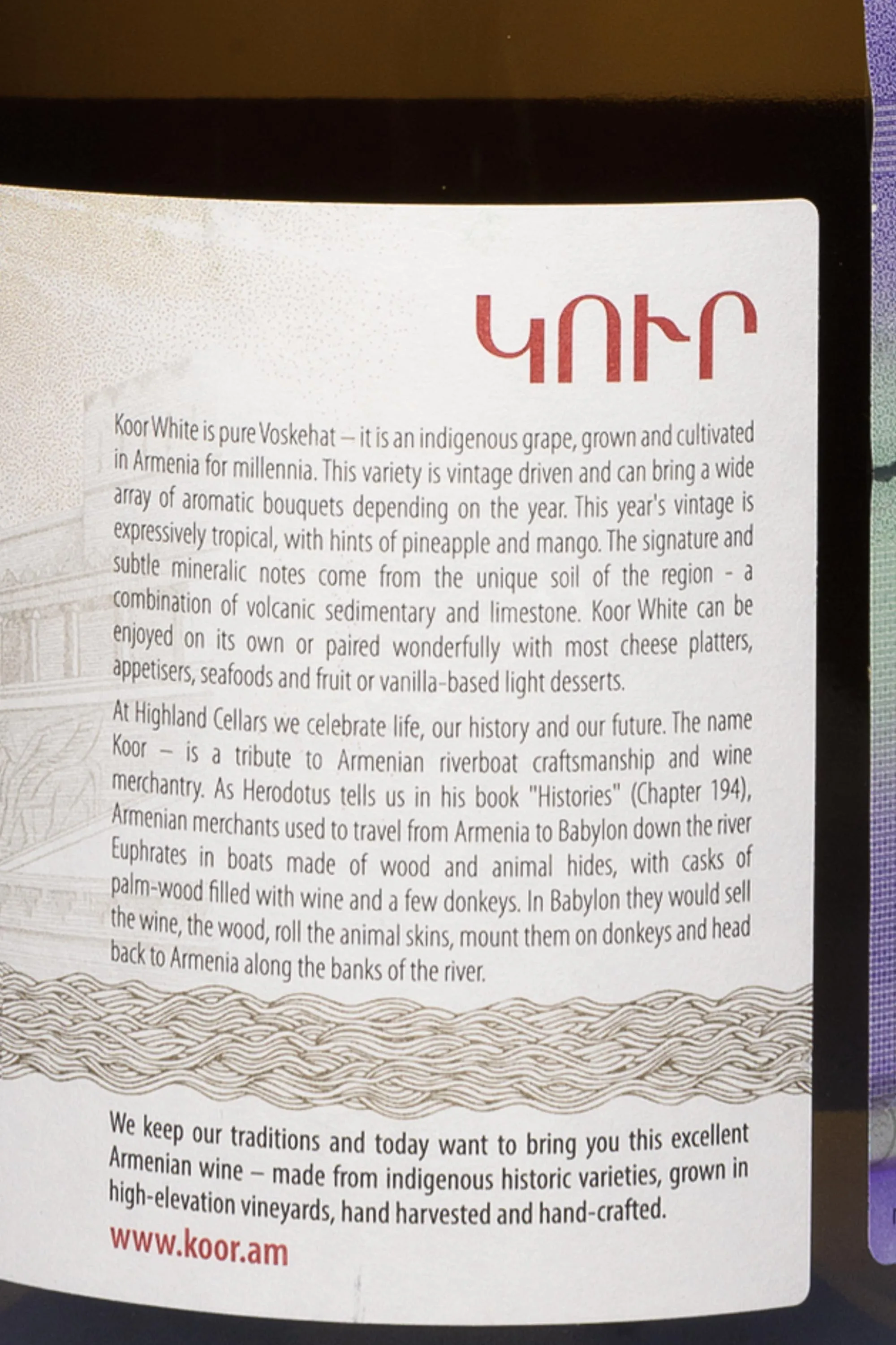 Белое сухое вино Koor Voskehat Reserve 0,75 л создано из автохтонного армянского сорта Воскеат, выращенного в высокогорном регионе Вайоц Дзор. Этот терруар известен своим континентальным климатом, прохладными ночами и каменистыми почвами, что придает ягодам яркий аромат и сбалансированную кислотность. Урожай собирают вручную и тщательно сортируют. После мягкого прессования сусло ферментируется при контролируемой температуре, что сохраняет природную сортовую ароматику. Выдержка проходит частично в дубовых бочках, частично в стальных резервуарах, что обеспечивает вину сложность и объем. Название Koor отсылает к древней традиции армянских винных торговцев, использовавших лодки «кур» для перевозки товаров по Евфрату, как описывал историк Геродот. Вино получило признание за чистоту вкуса и благородный характер, подтверждая высокий уровень современного армянского виноделия.