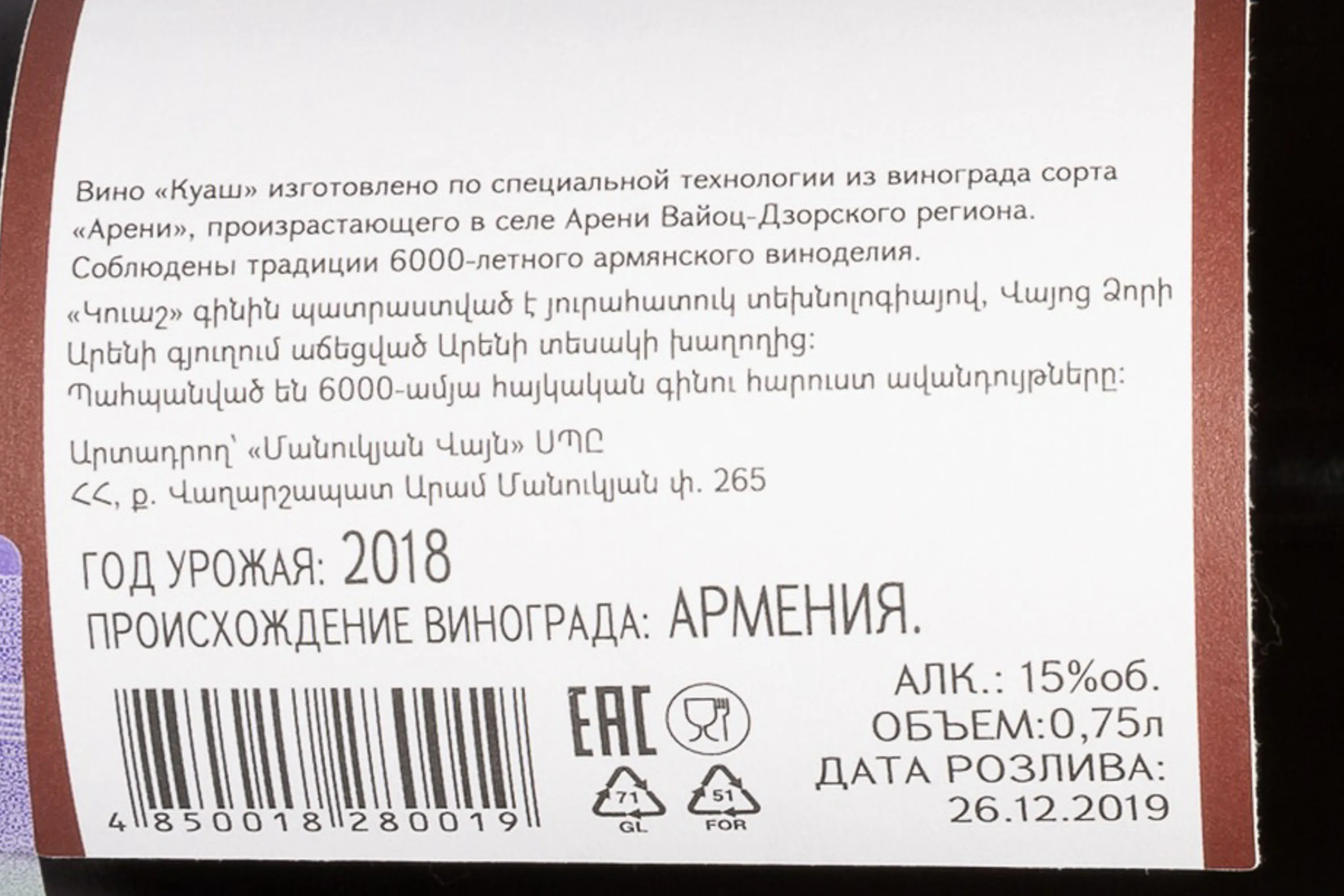 Красное сухое вино Kouash выпускает винодельческое предприятие ООО "Manukyan Wine", основанное в 2018 году и располагающее собственными виноградниками в армянском регионе Вайоц Дзор. Напиток создаётся из знаменитого местного сорта Арени, который выращивается на высокогорных склонах, богатых известняковыми породами и минералами. Виноград собирают вручную, аккуратно укладывая в небольшие ёмкости для сохранения целостности ягод, затем следует ферментация в стальных ёмкостях с контролем температуры. Благодаря щадящим методам производства, вино приобретает сложность и многогранность вкуса, ярко отражающую уникальность терруара.