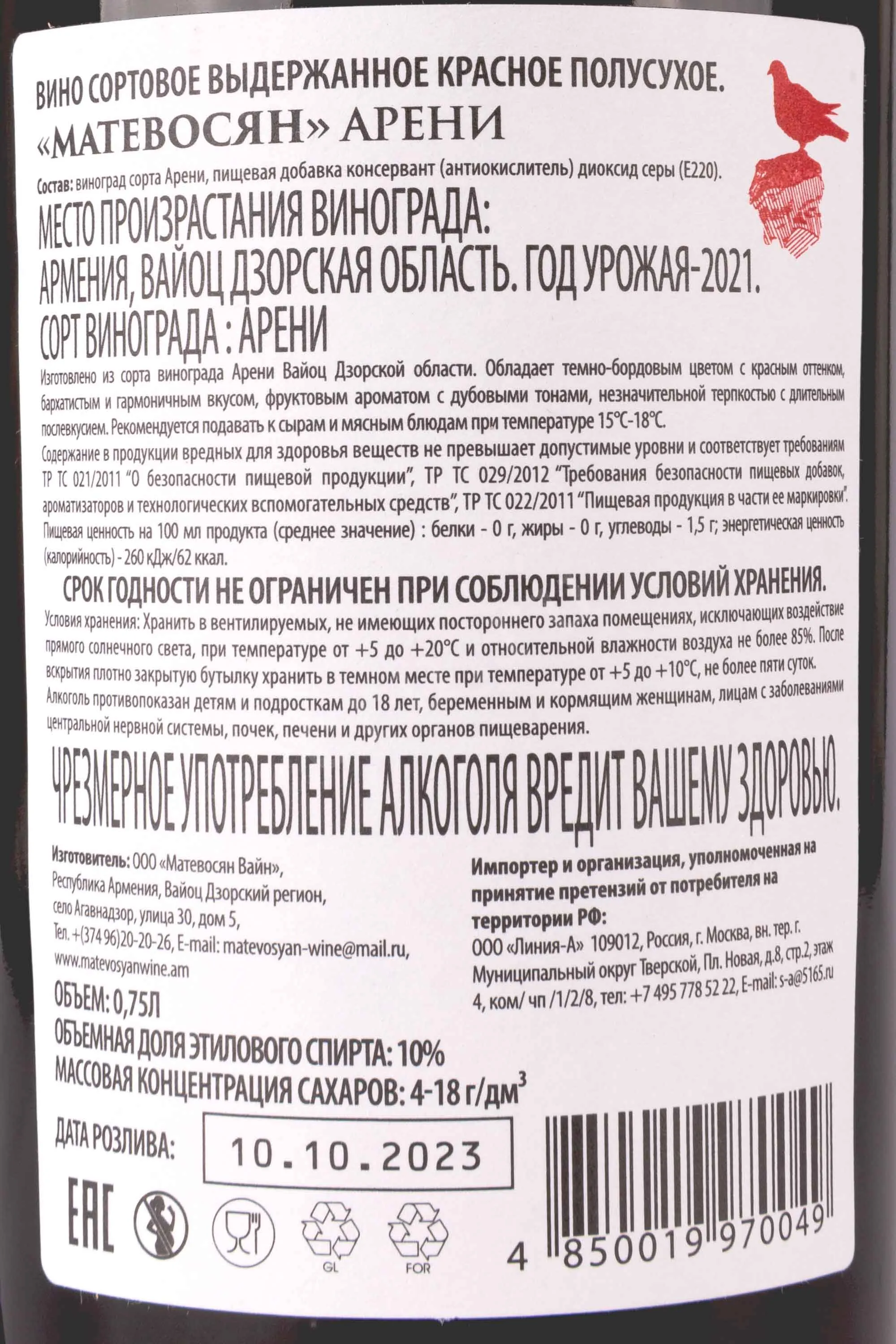 Красное полусухое вино Matevosyan Areni 0,75 л — выразительное, самобытное, создано из знаменитого армянского сорта Арени. Виноградники расположены в горном регионе Вайоц Дзор, на высоте более 1000 метров. Климат с перепадами дневных и ночных температур придаёт ягодам насыщенность и тонкий аромат. Ферментация происходит при контролируемой температуре, после чего следует выдержка на осадке. Это добавляет вину плотность и придает округлость вкусу. Особенность Матевосян Арени — сочетание традиционных методов виноделия и уникального горного терруара Армении.