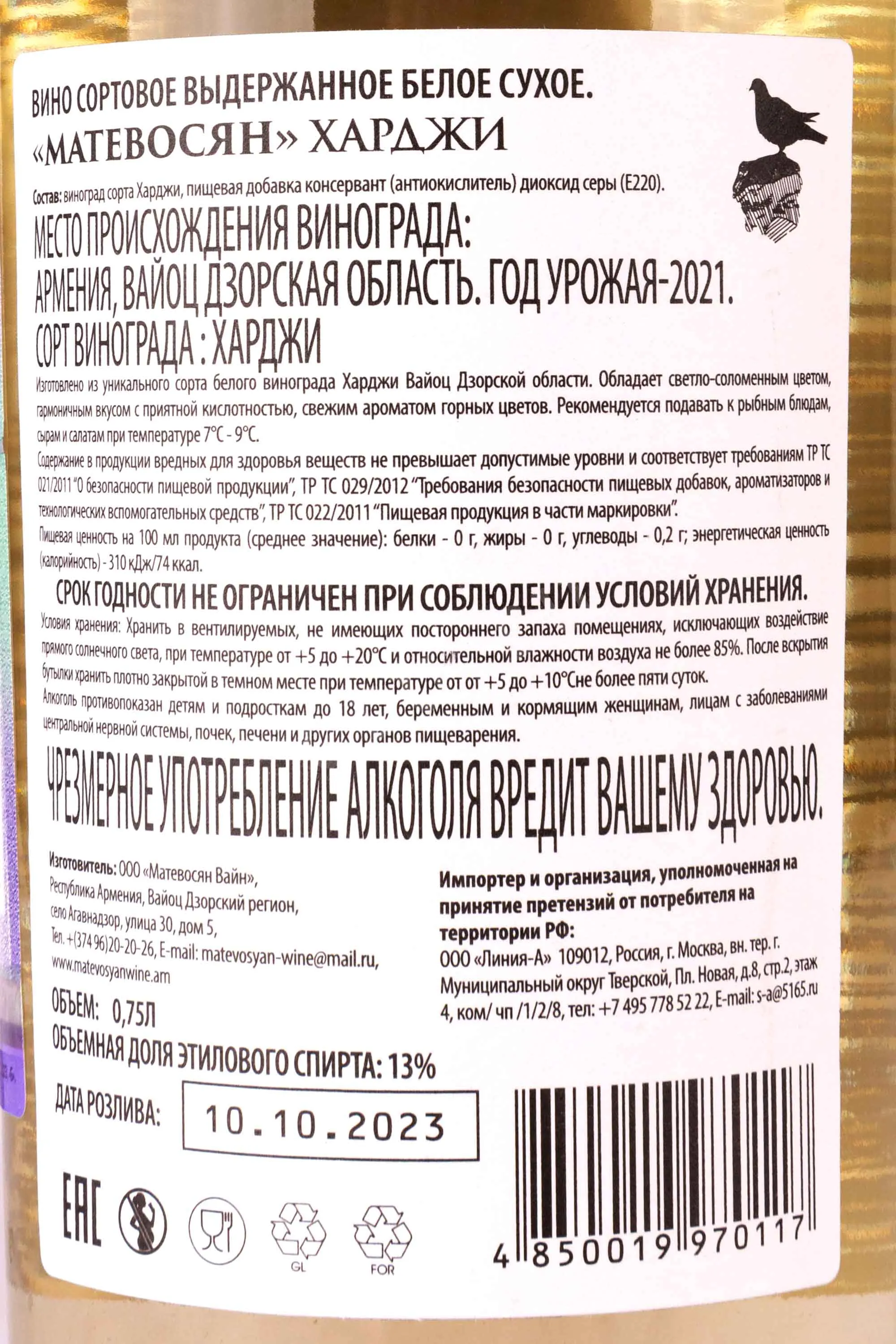 Белое сухое вино Matevosyan Kharji 0,75 л производится в Армении в регионе Вайоц Дзор. Виноград выращивают в горном терруаре с известковыми и каменистыми почвами. Сорт винограда местный — Харджи. При производстве контролируется температура ферментации для сохранения свежести и яркости аромата. Выдержка проходит непродолжительно в стальных ёмкостях, что подчеркивает естественные качества сорта. Особенности вина, отмеченные ценителями, это тонкий баланс вкуса и аромата, гармоничность и лёгкость.
