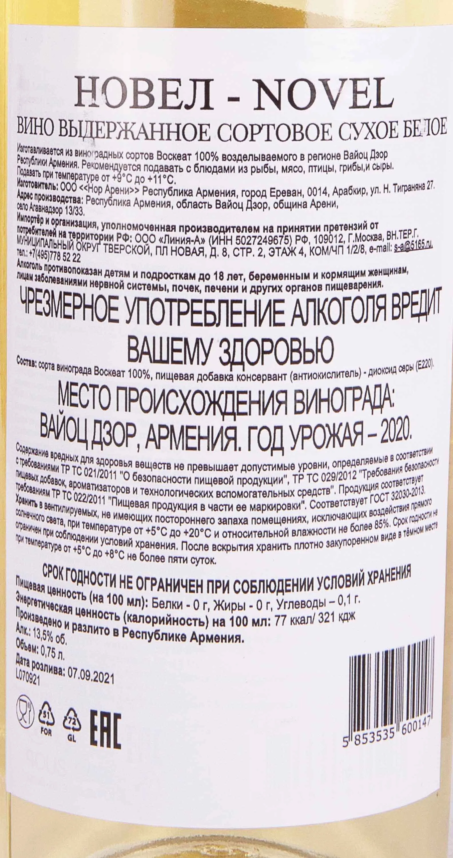 Белое сухое вино Novel Voskehat White 0,75 л выпускает армянская винодельня «Нор Арени», работающая с аборигенными сортами винограда в регионе Вайоц Дзор. Урожай Воскеат проходит полугодовую выдержку в дубовых бочках, за счёт чего напиток приобретает выразительный профиль и утончённую текстуру.