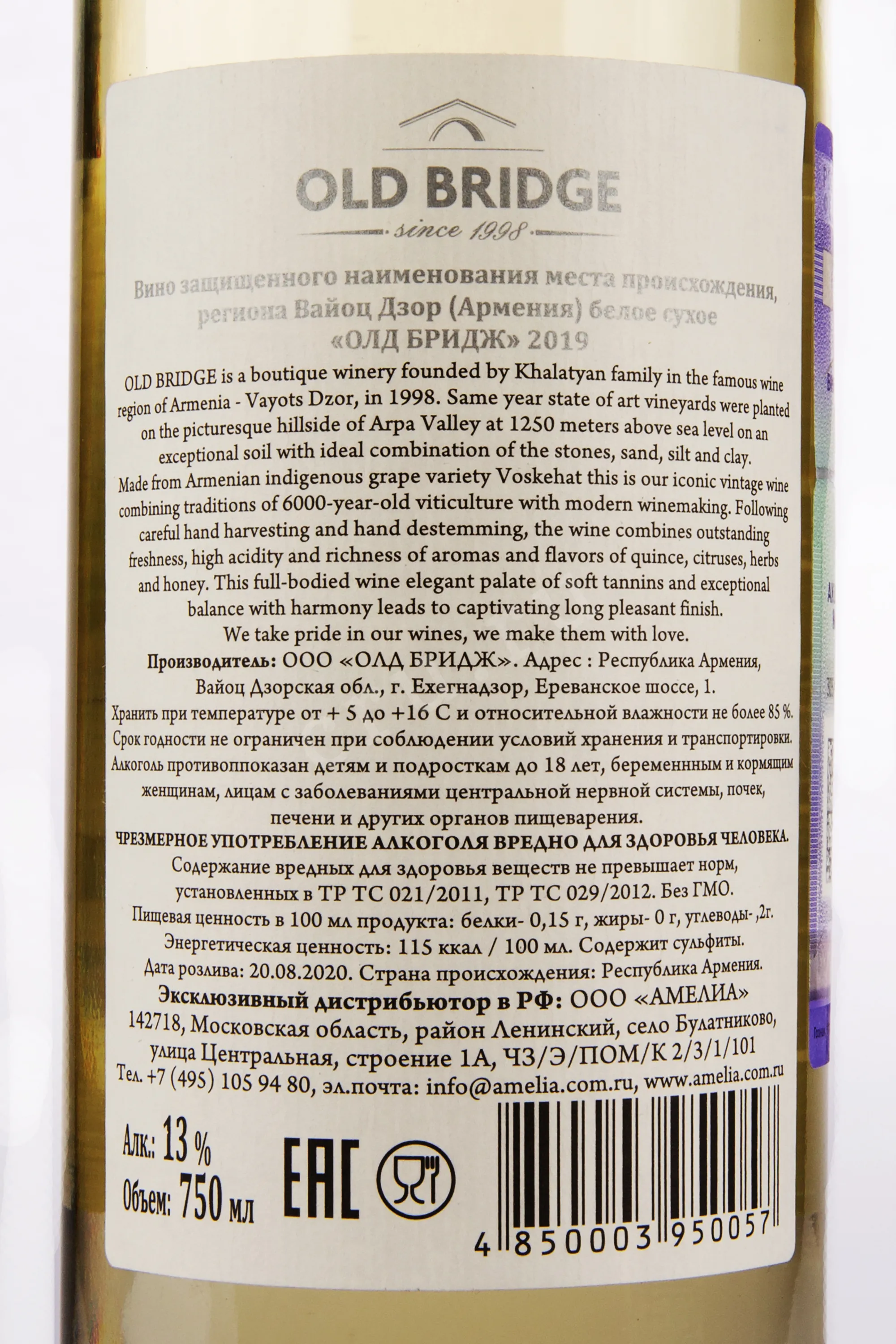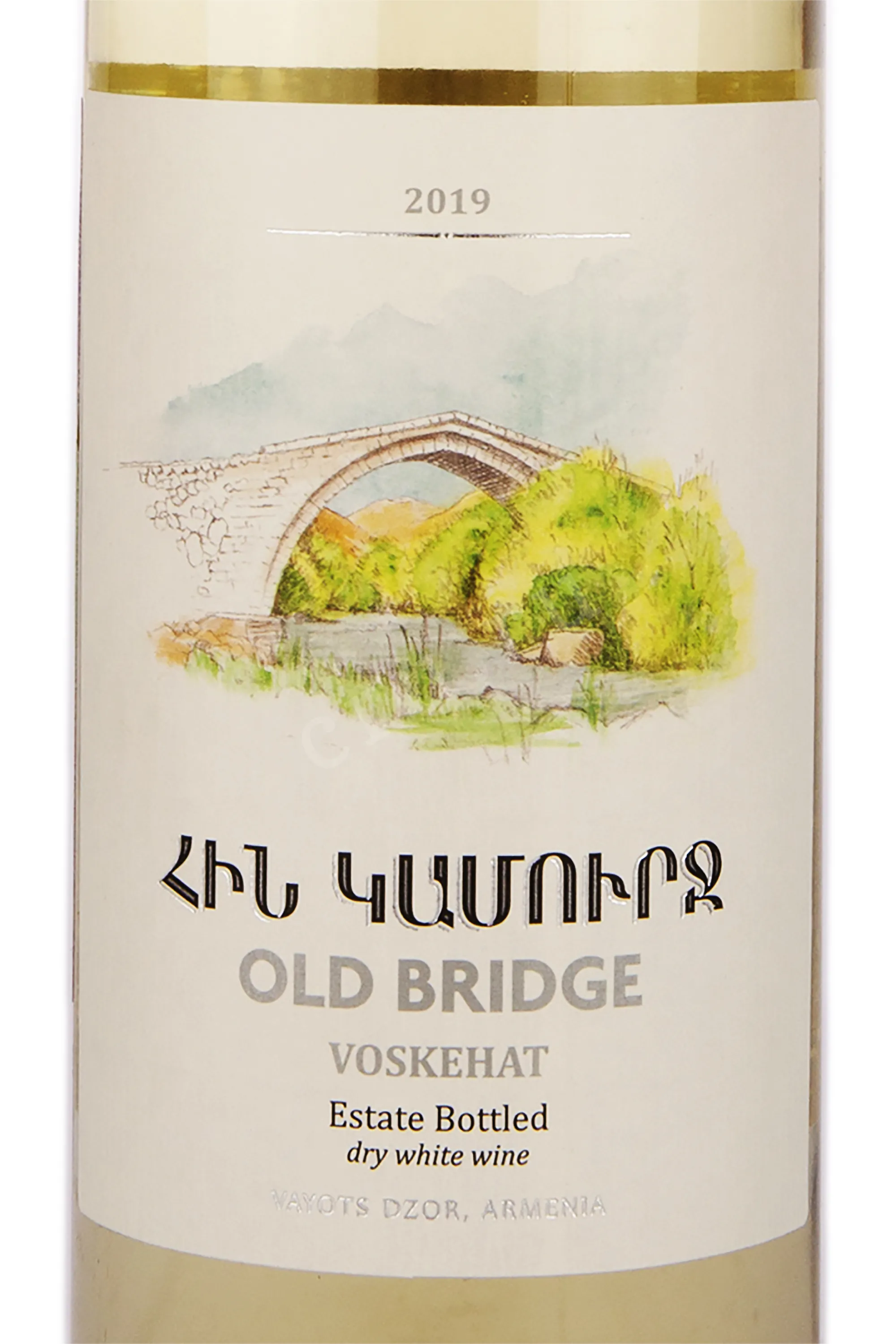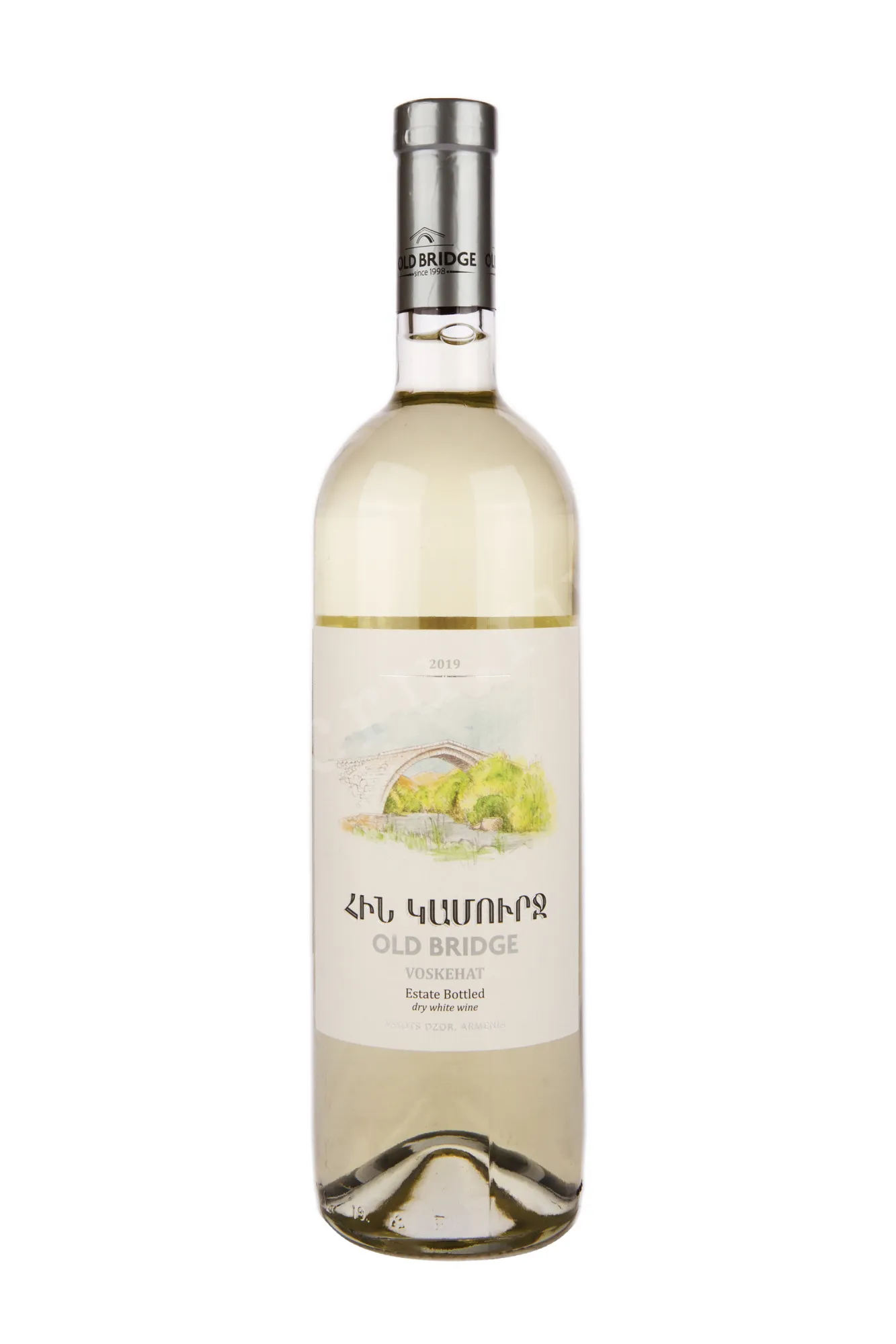 Белое сухое вино Old Bridge Voskehat 2019 0,75л выпускается армянским хозяйством «Олд Бридж» («Старый Мост»), получившим название в честь древнего каменного моста XIII века через реку Арпа. Виноградники расположены на компактной территории в 4 га, на высоте около 1200 метров, где вулканические и аллювиальные почвы с песчано-суглинистыми включениями придают винограду Воскеат особую насыщенность и минеральную выразительность.