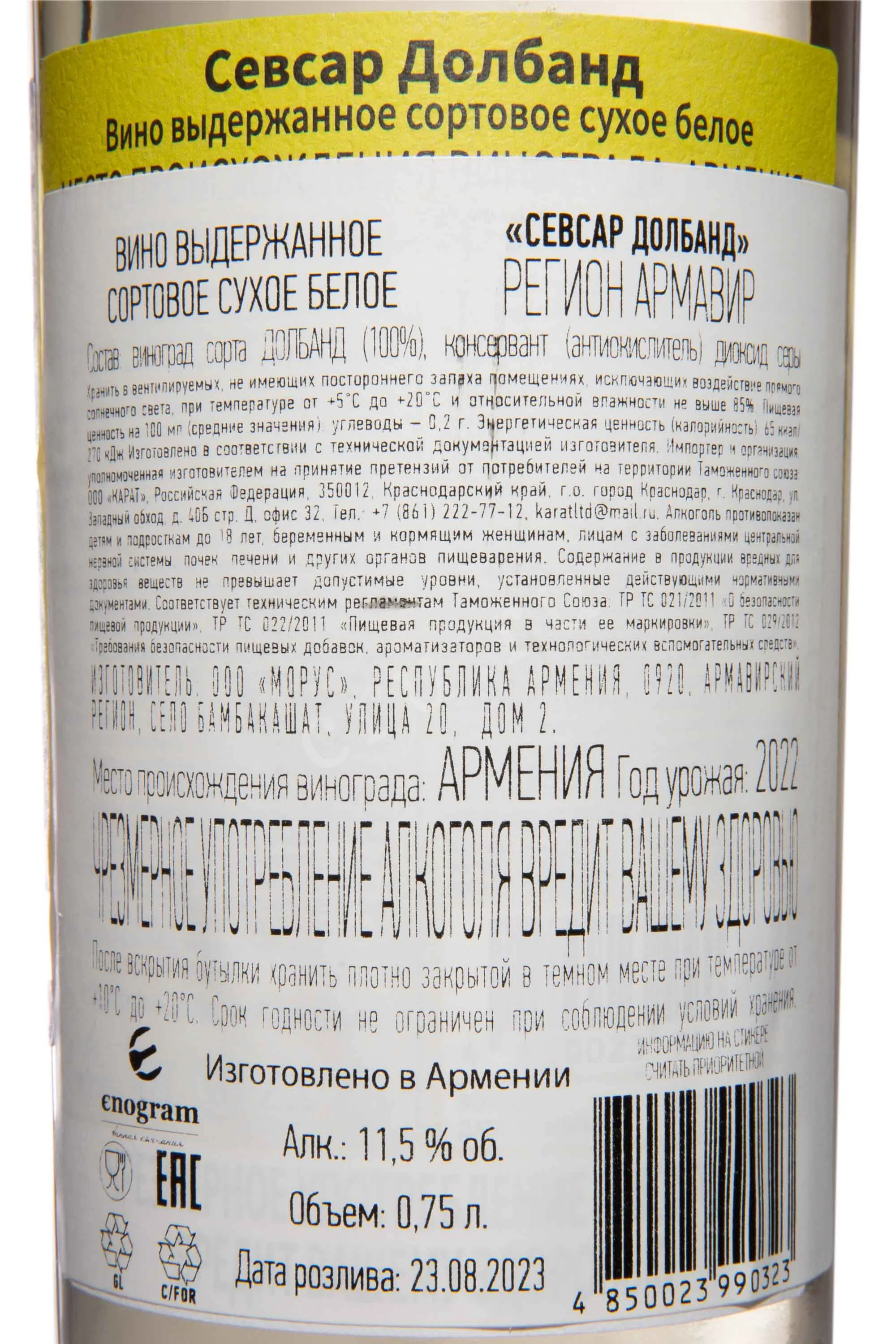 Белое сухое вино Sevsar Dolband 0,75 л — авторское, самобытное, создано из армянского автохтонного сорта Долбанд (он же Мсхали). Виноград был выращен в Армавирском районе на высоте около 1200 метров над уровнем моря, где фиксируются резкие перепады температур, а почвы имеют вулканическое происхождение. Такие условия способствуют формированию яркой кислотности и выраженного аромата. Производитель, ООО «Морус», использует современные щадящие методы винификации с контролем температуры при ферментации, что позволяет сохранить свежесть и ароматические качества вина. Выдержка проходит в стальных емкостях, что позволяет подчеркнуть чистоту вкуса. Вино получило положительные отзывы на международных дегустациях и высокие оценки на платформе Vivino.