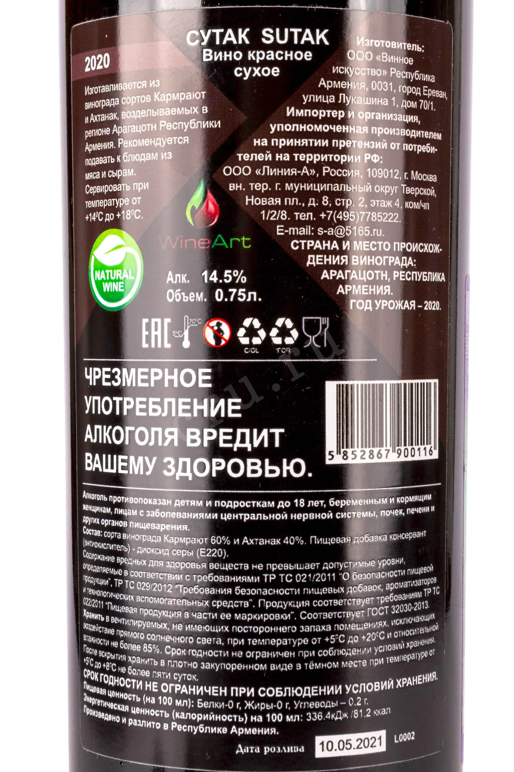 Красное сухое вино WineArt Sutak 0,75 л представляет собой армянский купаж из винограда сортов Кармрают и Хахтанак. Они выращены на высокогорных виноградниках Армении на высоте более 1000 метров. Процесс производства включает традиционную ферментацию с контролем температуры, затем следует выдержка в деревянных бочках. Это придаёт вину многогранность вкуса, сбалансированные танины и глубокий характер. WineArt Sutak создается путем сочетания традиций армянского виноделия с современными методами, благодаря чему вино обладает отличным потенциалом к выдержке и престижной репутацией среди винных критиков.