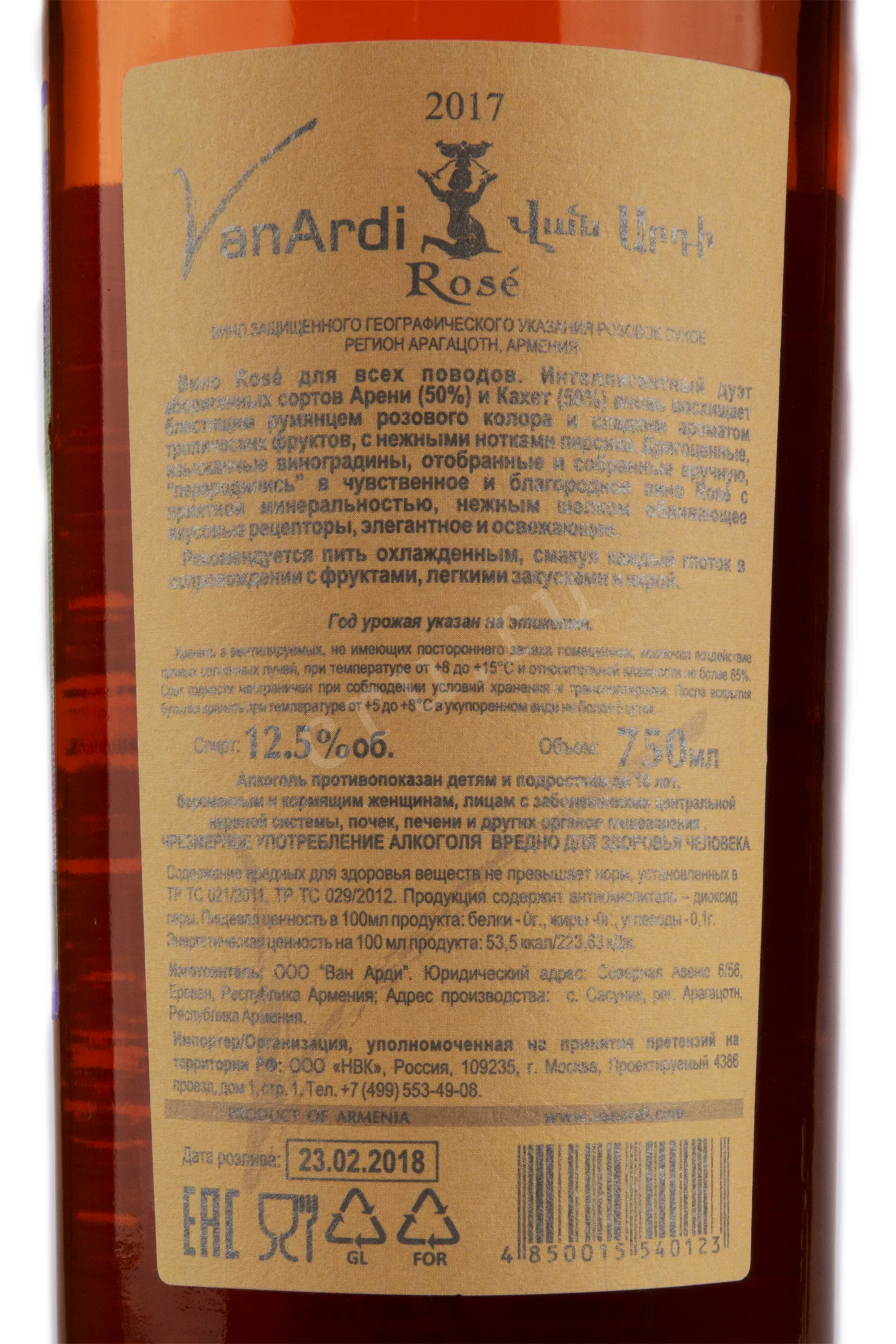 Розовое сухое вино Van Ardi Rose 0,75 л — изысканное, сочетающее в себе свежесть и элегантность. Произведено из винограда двух аборигенных сортов, которые выращиваются в регионе Арагацотн, на склонах горы Арагац на высоте 1050 метров над уровнем моря. Почвы здесь вулканического происхождения, богатые минералами, а климат — сухой и ветреный, с тёплыми днями и прохладными ночами, что способствует созреванию винограда с ярким ароматом и сбалансированной кислотностью. Вино создаётся винограда, собранного вручную. Ферментация проходит в стальных резервуарах при контролируемой температуре, что позволяет сохранить свежесть и фруктовый характер. Розе Ван Арди отмечено медалями на престижном конкурсе International Wine & Spirit Competition (IWSC).
