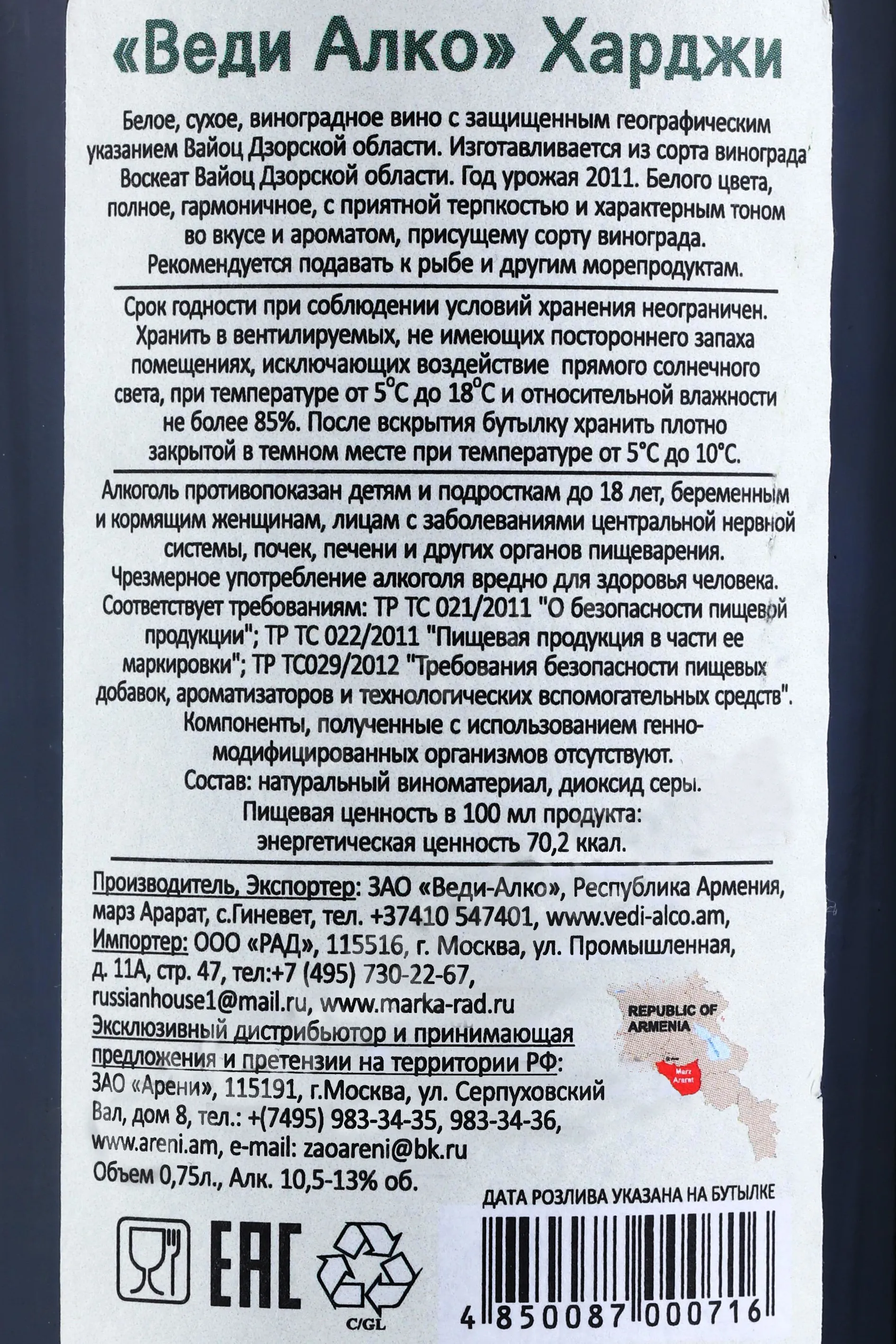 Белое сухое вино Vedi Alco Kharji 2011 0,75 л — классическое, армянское, произведенное из автохтонного сорта Воскеат, который был выращен в регионе Вайц Дзор. 2011 год запомнился благоприятной сухой погодой, которая позволила получить виноград высокого качества. Ферментация проходила при контролируемой температуре, что способствовало сохранению свежести и аромата вина. Выдержка осуществлялась в стальных емкостях, что позволило подчеркнуть природные характеристики сорта без влияния древесных нот. Вино обладает сбалансированным вкусом и отражает терруар региона, отличается солидным потенциалом хранения благодаря удачному году урожая.