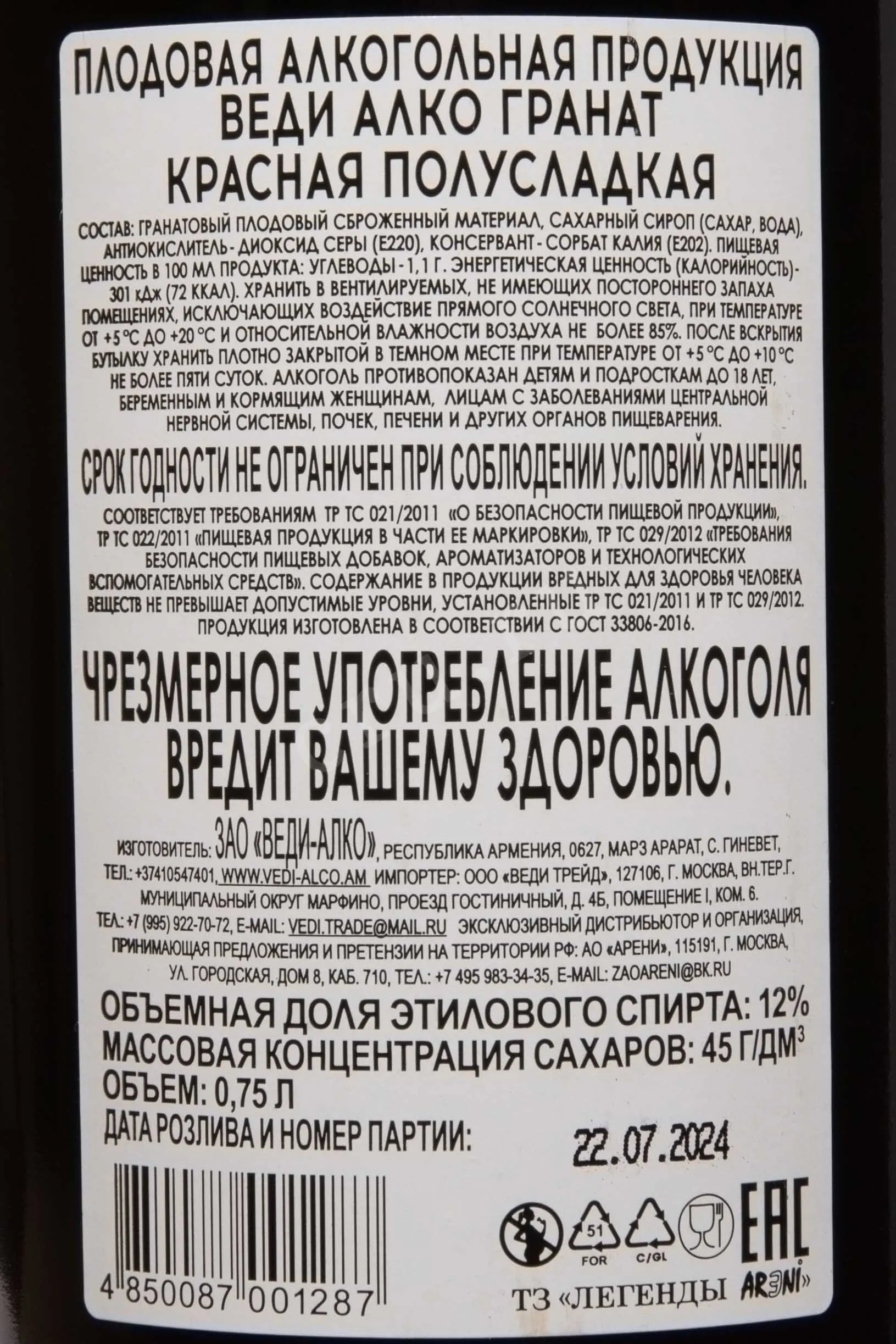 Красное полусладкое вино Vedi Alco Pomegranate 0,75 л — фруктовое, изготовлено исключительно из спелых гранатов, выращенных в армянской Араратской долине. Производитель, компания Веди Алко, основанная в 1956 году, известна своими традициями и качеством продукции. Была использована классическая технология винификации. Ферментация проходила при контролируемой температуре в стальных резервуарах, что позволило сохранить яркий фруктовый характер. Выдержка осуществлялась в стали, что дало возможность подчеркнуть естественные оттенки вкуса. Это вино получило признание за свою уникальность и высокое качество, часто упоминается в обзорах как один из лучших образцов в своей категории.